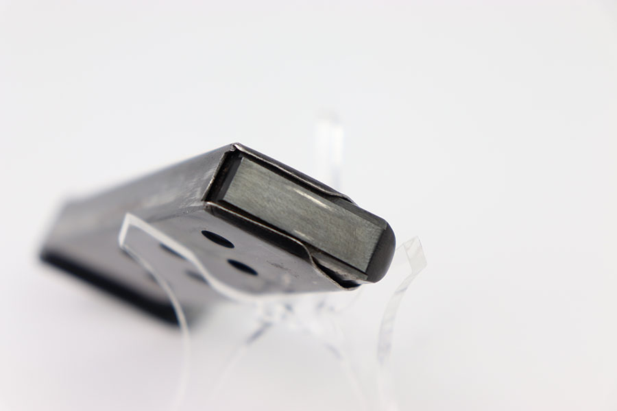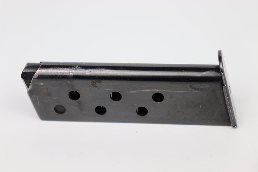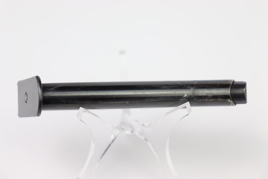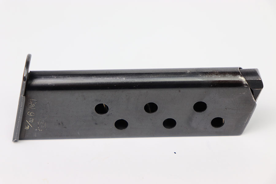 1/31/24 – This is a rare variation Walther PPK magazine in 9mm kurz (.380 acp). These are scarce WW2 variation magazines, as not many 9mm Walther PPKs were produced during WW2. The magazine is in excellent condition with most of its original high gloss blued finish intact with no pitting. There’s slight finish loss on the front rounded edge and spine of the magazine tube and some surface patina on the right side, as shown. This scarce variation has 6 holes on each side of the tube, a Walther banner on the left side with “Cal. 9m/m” underneath. The high gloss base is in minty condition. The spring is strong and functional with no mechanical issues.