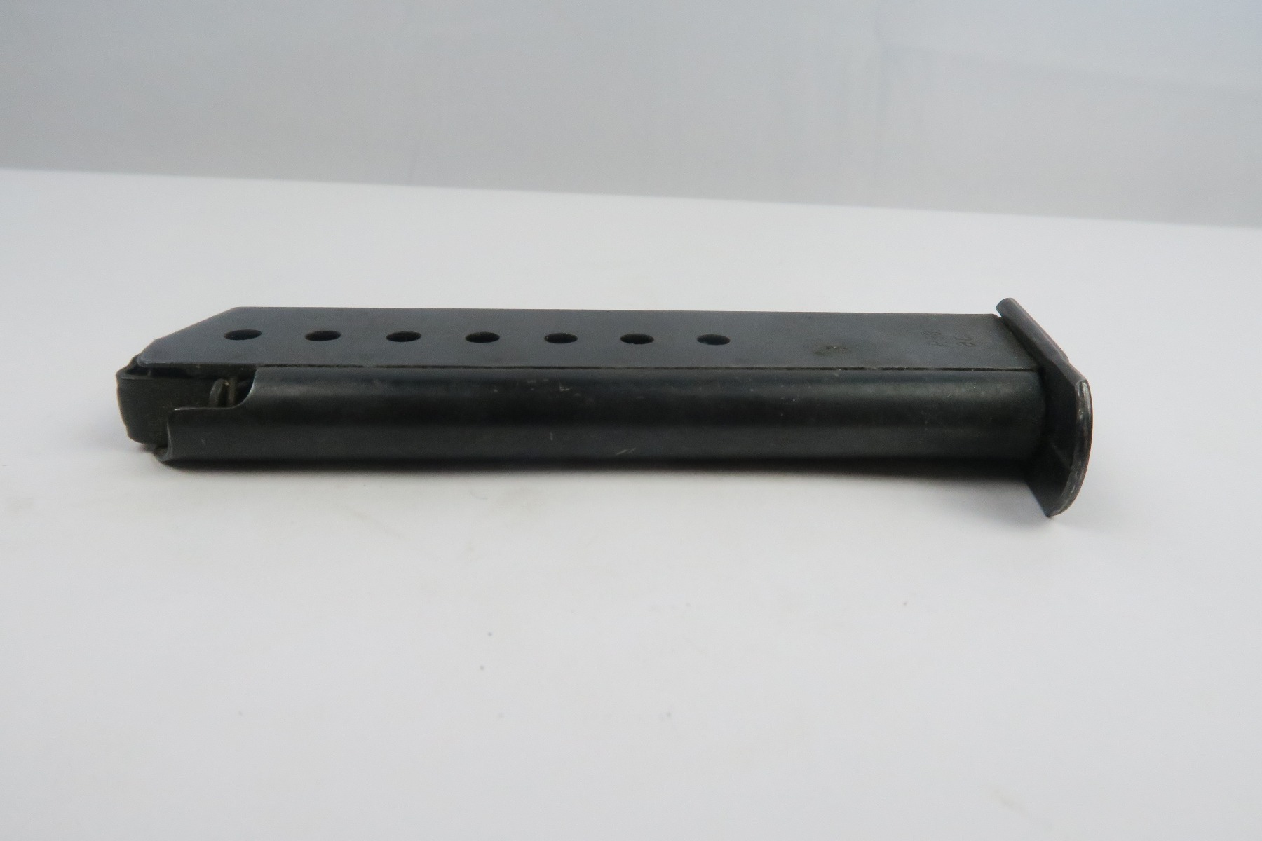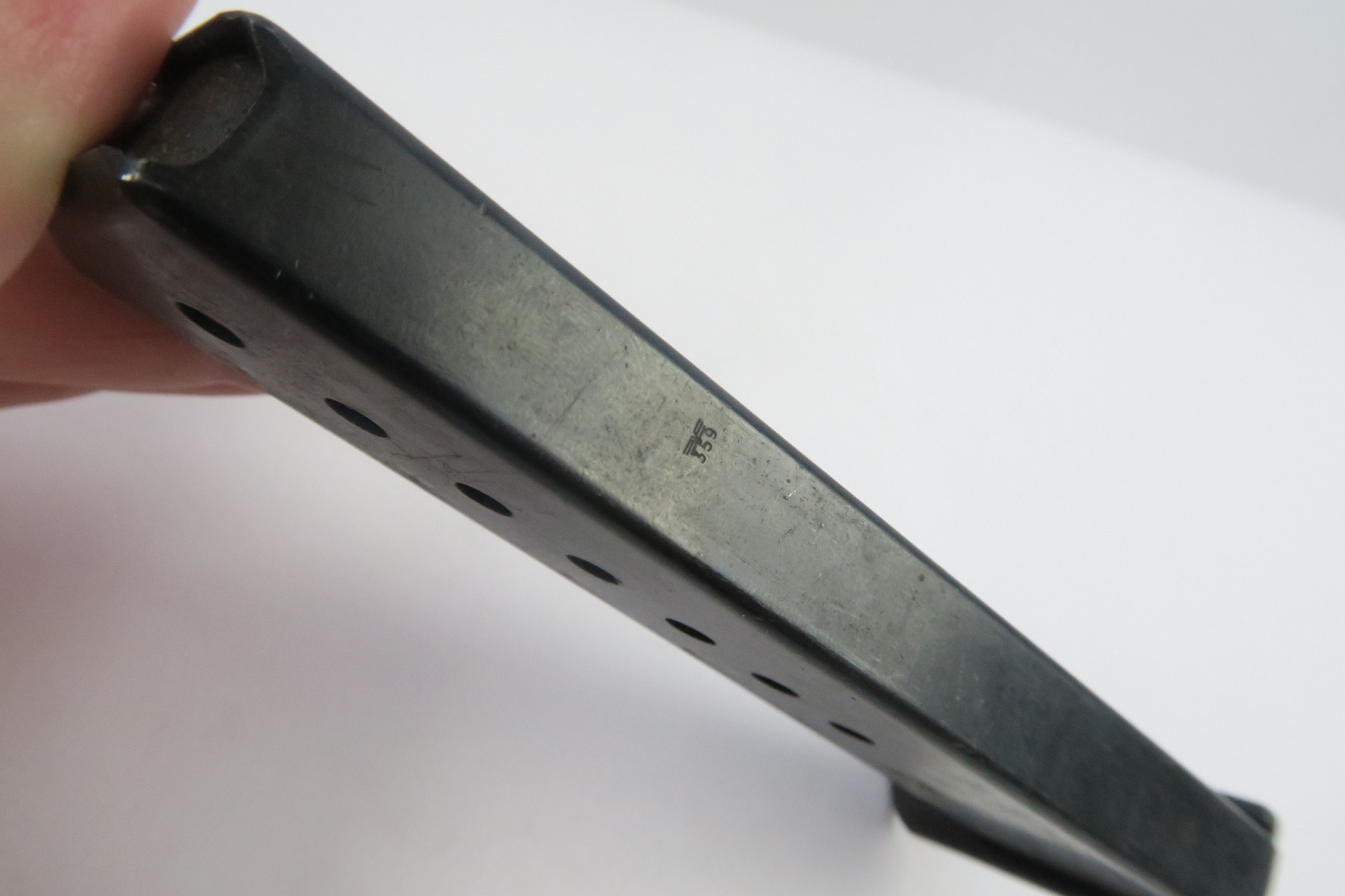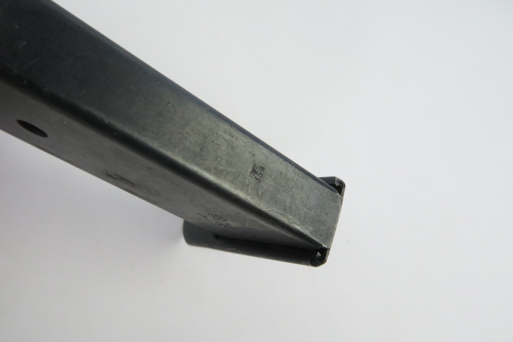 12/26/17 – This is an early production Walther P.38 Magazine. The magazine frame has “AC” under the “P.38” stamp on the left side. The spine is double eagle/359 military proofed. The magazine has light wear throughout but overall is in great shape with no major issues. No rust or pitting. The spring is strong and fully functional.