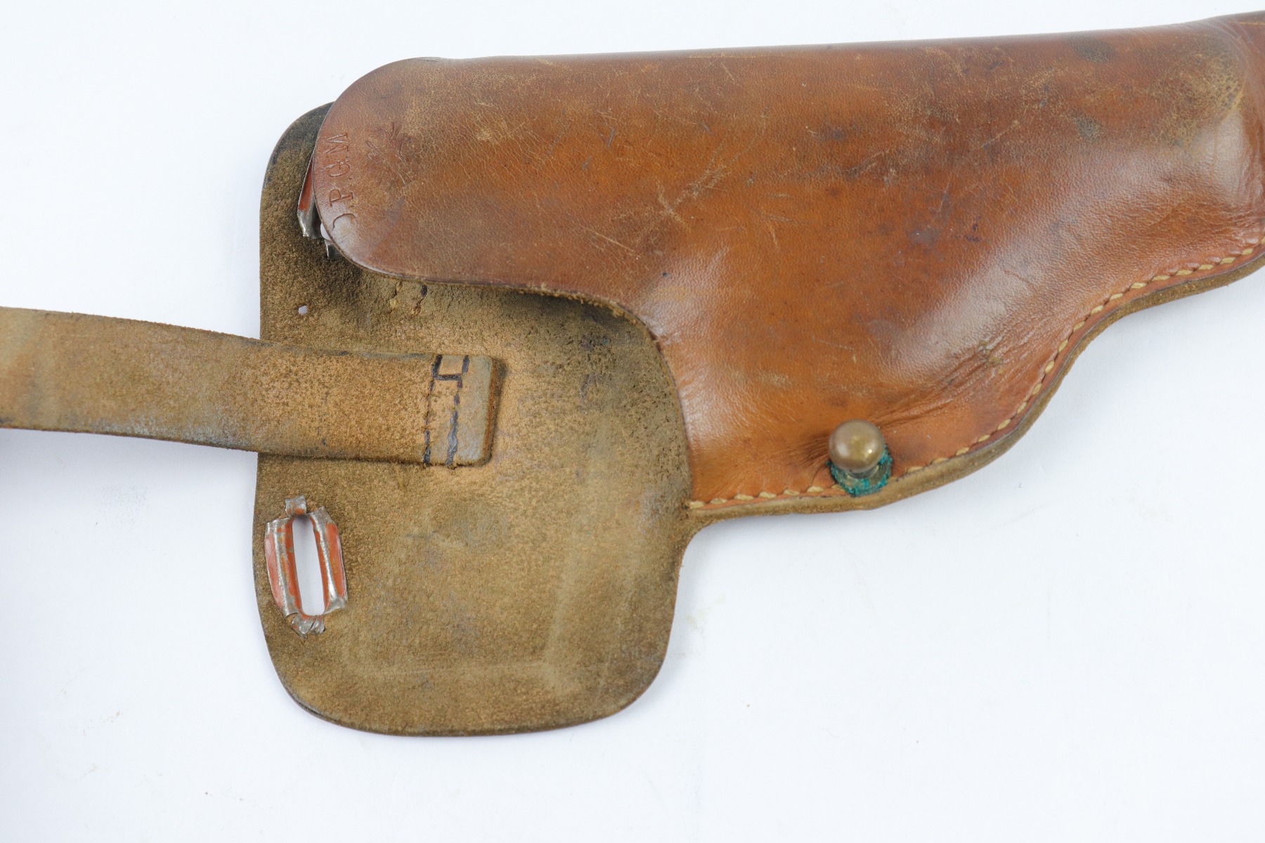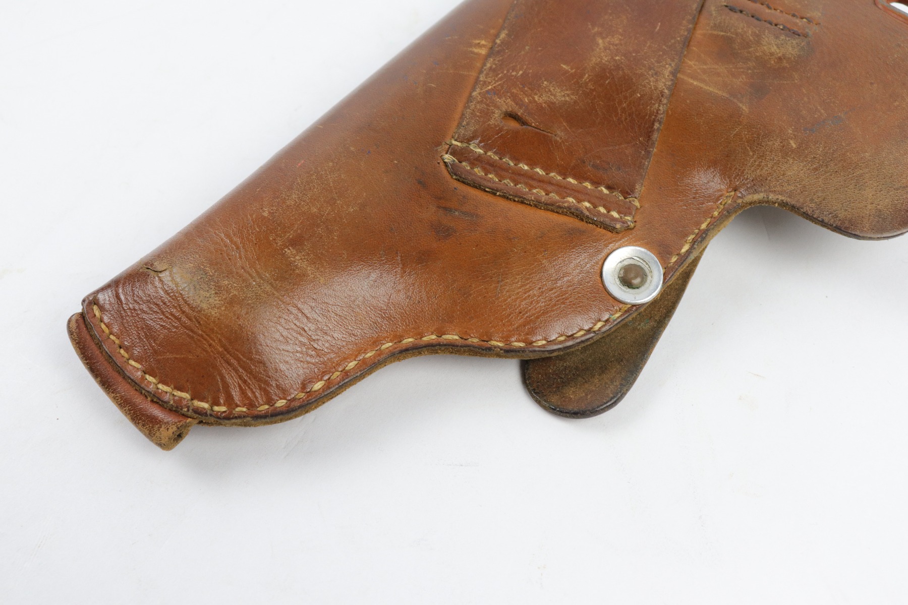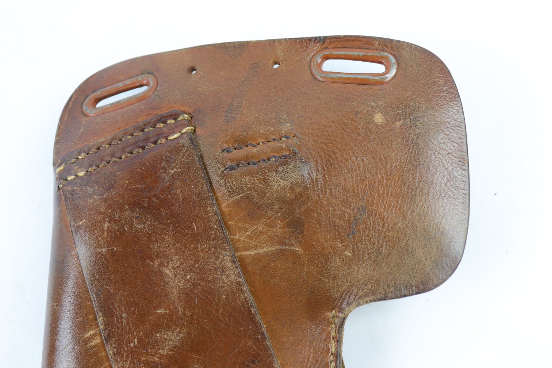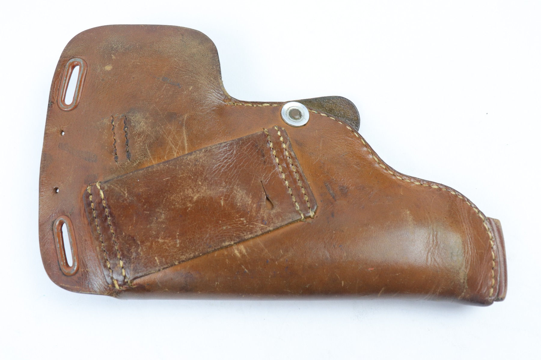 4/3/18 – This is an original AKAH Walther PPK Shoulder holster from pre WW2. The holster is early because of the large brass closure knob. This is an early style used prior to WW2. The holster is AKAH DRGM stamped on the front leather. The closure strap has different color stitching and is most likely a wartime replacement (the strap still looks old and worn, and the stitching style is congruent to WW2). The shoulder strap is not included. The holster leather is pliable and shows signs of use and aging. The stitching is all in tact. Guaranteed original.