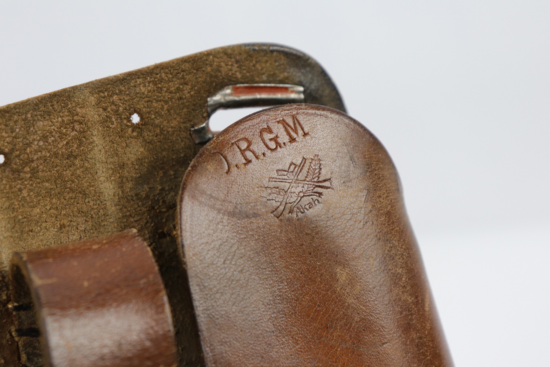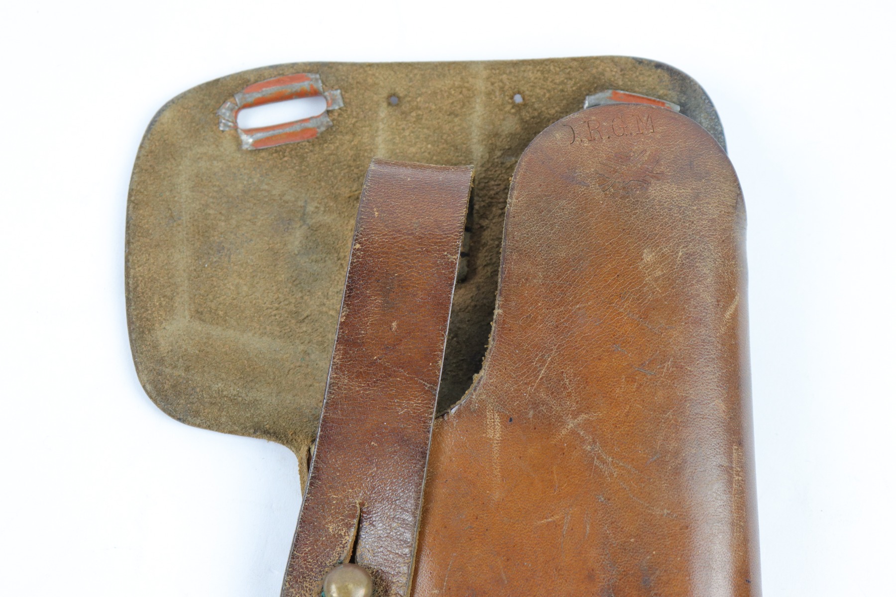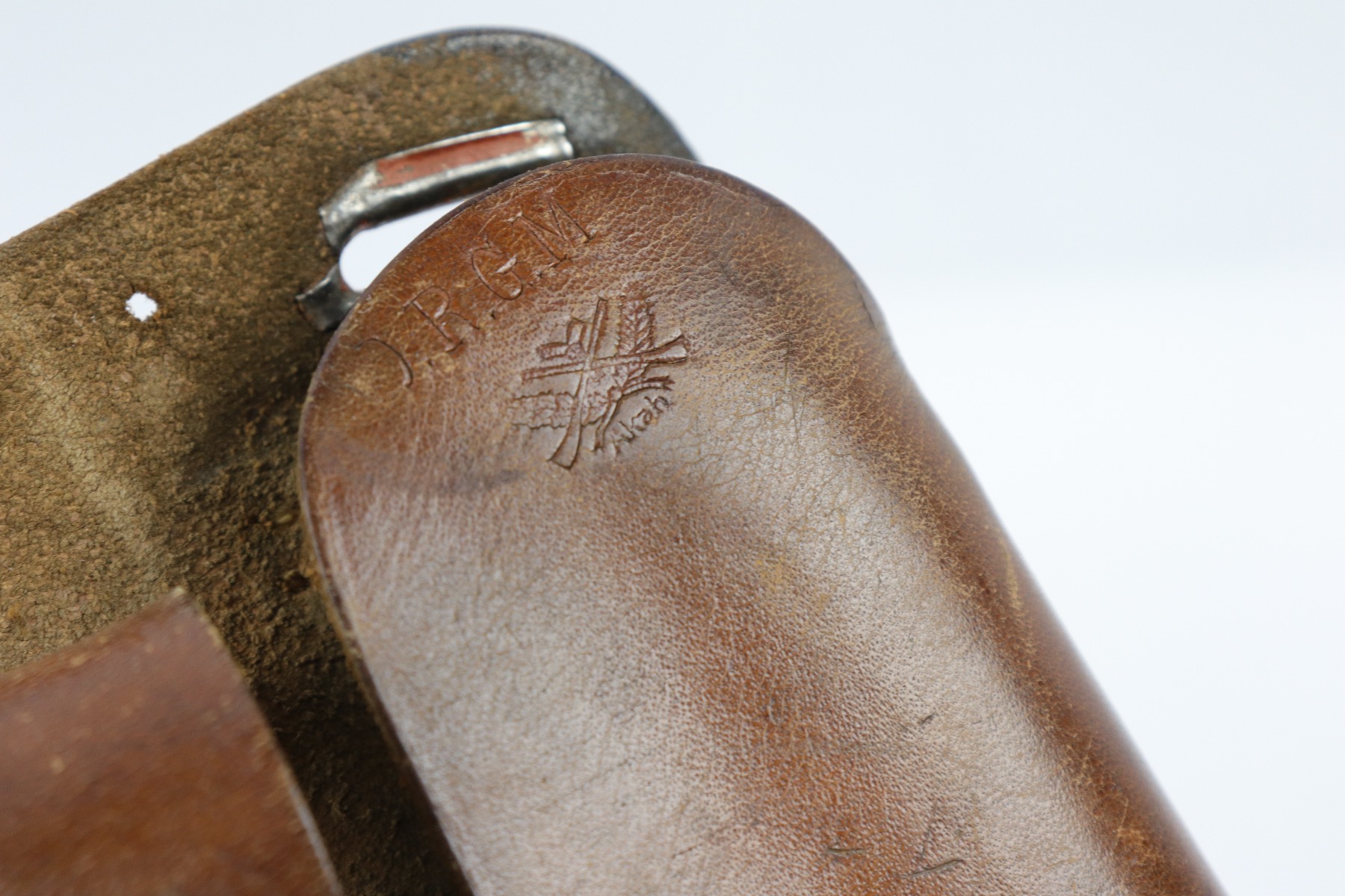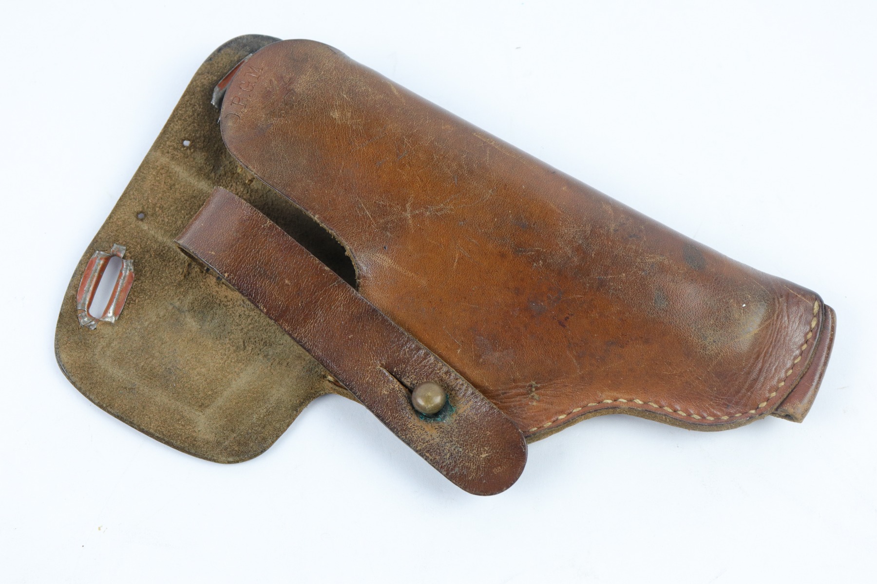 4/3/18 – This is an original AKAH Walther PPK Shoulder holster from pre WW2. The holster is early because of the large brass closure knob. This is an early style used prior to WW2. The holster is AKAH DRGM stamped on the front leather. The closure strap has different color stitching and is most likely a wartime replacement (the strap still looks old and worn, and the stitching style is congruent to WW2). The shoulder strap is not included. The holster leather is pliable and shows signs of use and aging. The stitching is all in tact. Guaranteed original.
