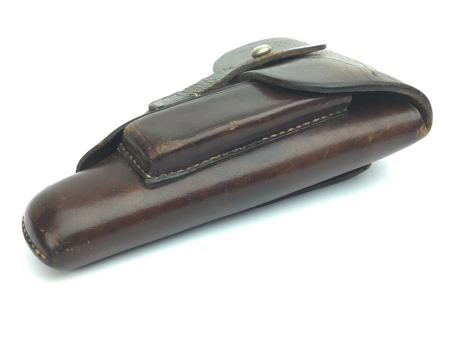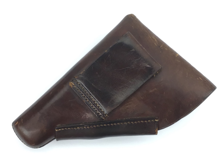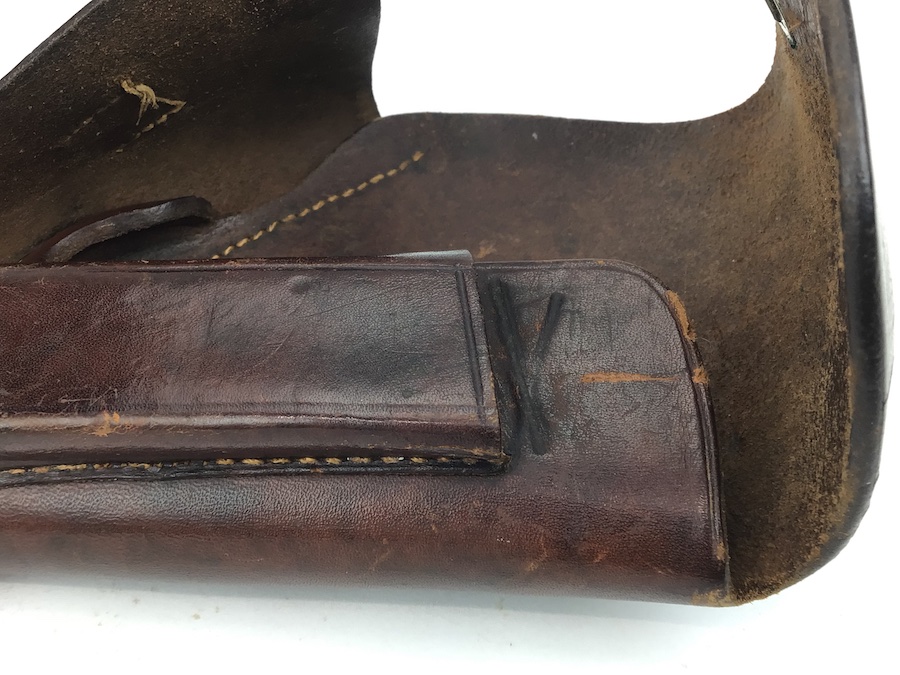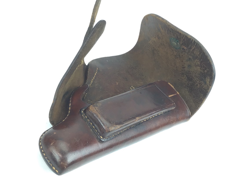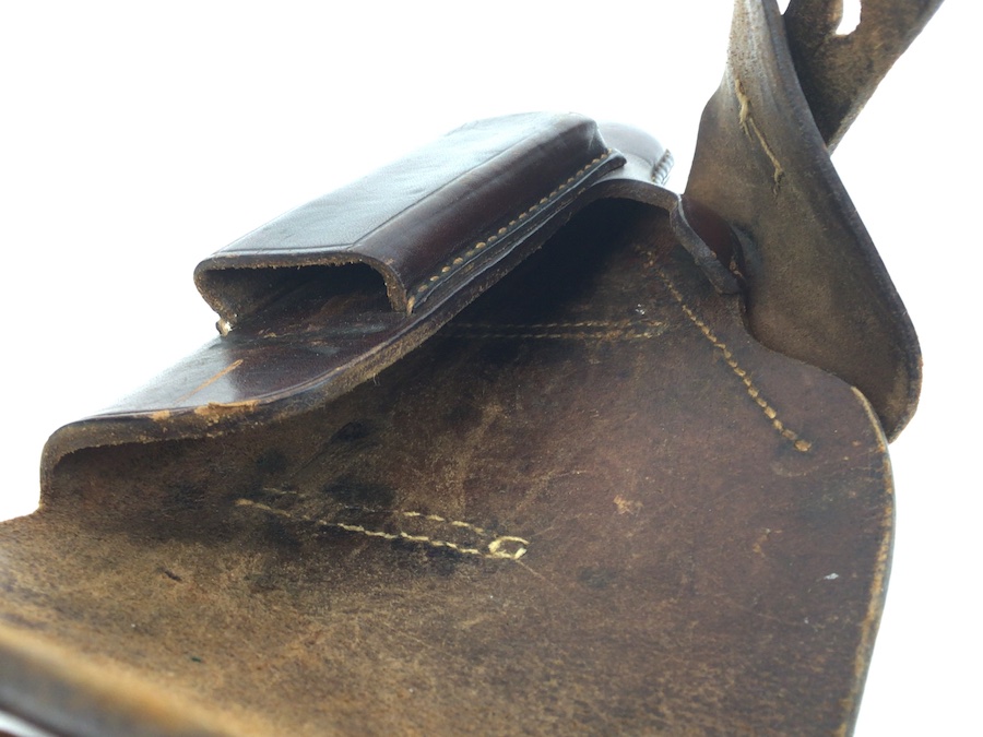 10/18/21 – This is an original AKAH Walther PPK holster from WW2. This is an earlier WWII production holster with a bronze closure stud. The holster is AKAH DRGM maker stamped under the closure strap. The brown leather is strong and fairly firm with no notable flaws with the exception of mild, etched initials “CFH” on the front of the closure flap. The stitching is all tight and original with no flaws. Overall a great collectible grade holster. The interior leather is fairly clean.