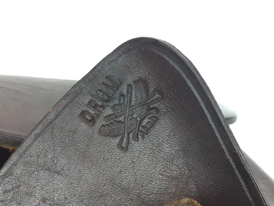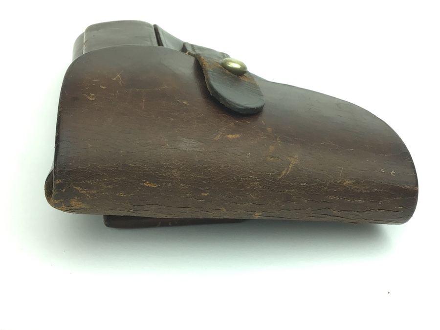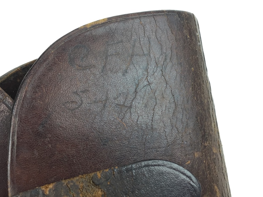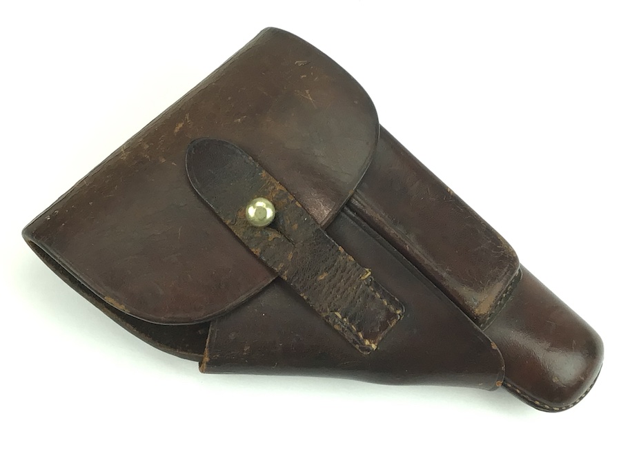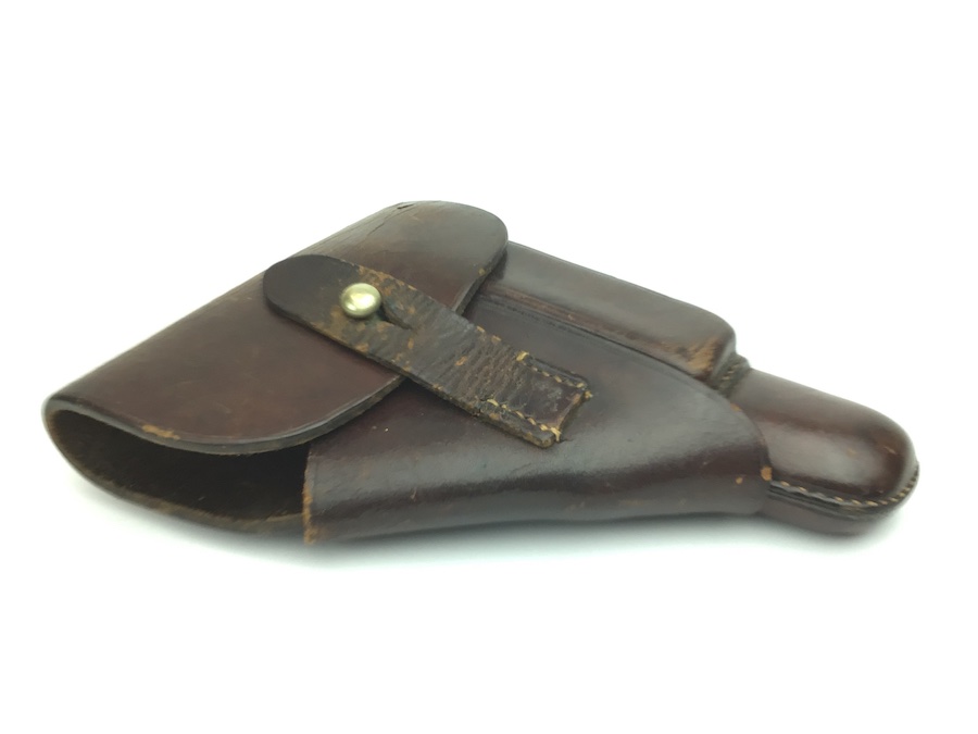 10/18/21 – This is an original AKAH Walther PPK holster from WW2. This is an earlier WWII production holster with a bronze closure stud. The holster is AKAH DRGM maker stamped under the closure strap. The brown leather is strong and fairly firm with no notable flaws with the exception of mild, etched initials “CFH” on the front of the closure flap. The stitching is all tight and original with no flaws. Overall a great collectible grade holster. The interior leather is fairly clean.