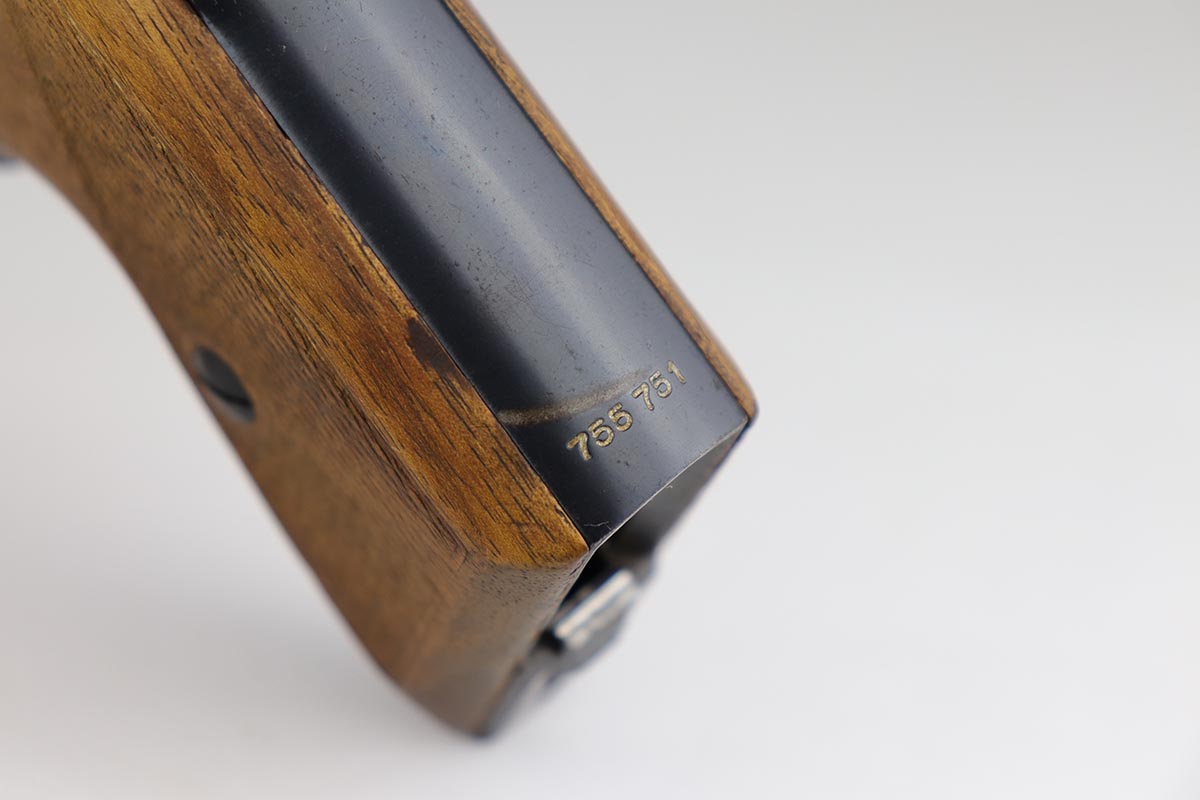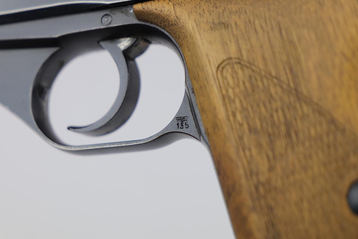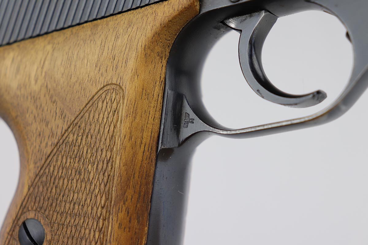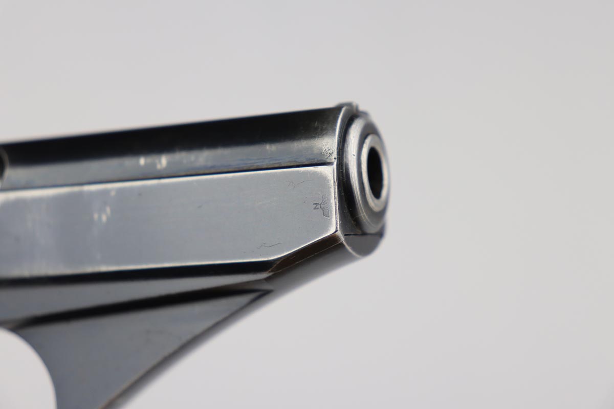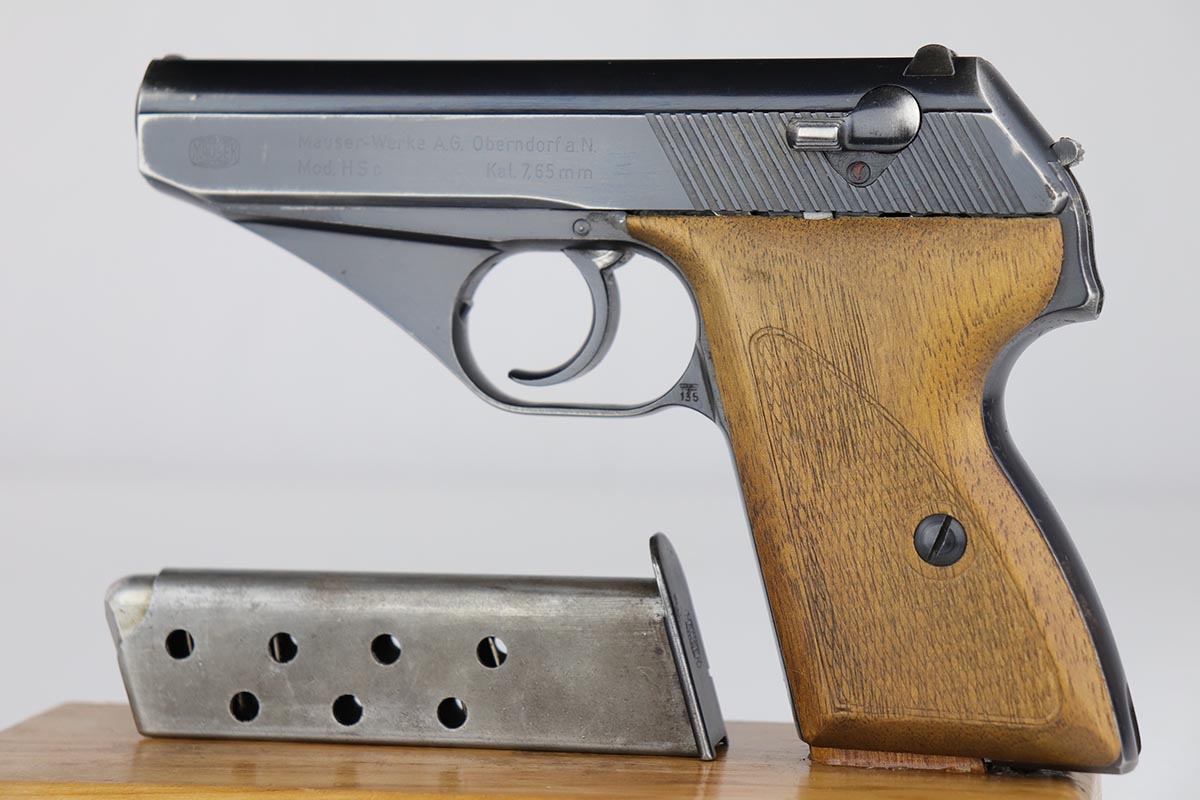 8/29/19 – This is a nice, early Mauser HSc that was manufactured at the beginning of 1942 and issued to the German Army. The high-polish blue rates at 93-94% with minor edge wear on both sides of the slide, and small areas of finish loss on the front strap and trigger guard. Excellent grips with no chips or cracks. Strong, shiny bore. Banner magazine.