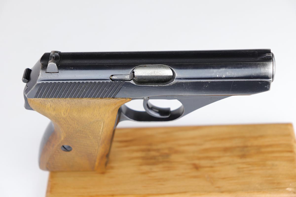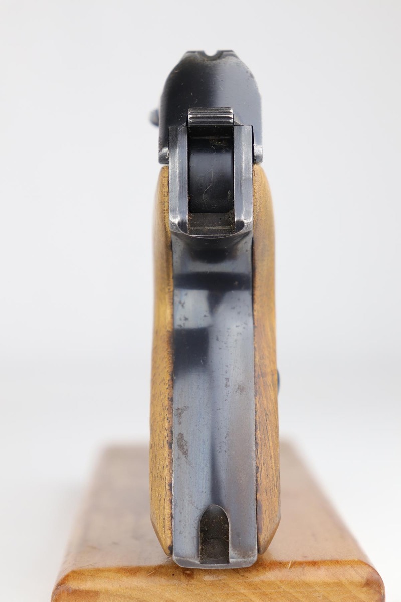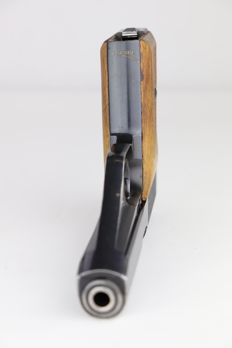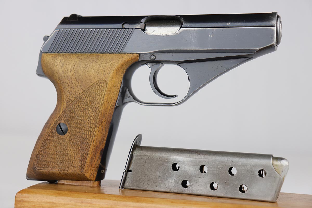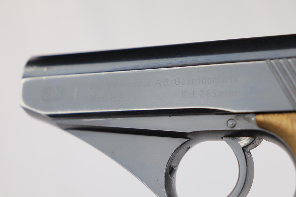 8/29/19 – This is a nice, early Mauser HSc that was manufactured at the beginning of 1942 and issued to the German Army. The high-polish blue rates at 93-94% with minor edge wear on both sides of the slide, and small areas of finish loss on the front strap and trigger guard. Excellent grips with no chips or cracks. Strong, shiny bore. Banner magazine.