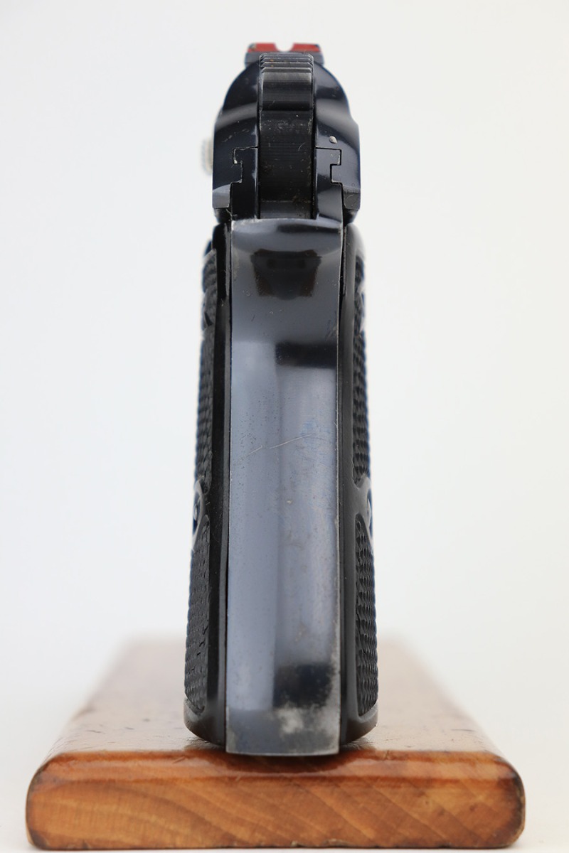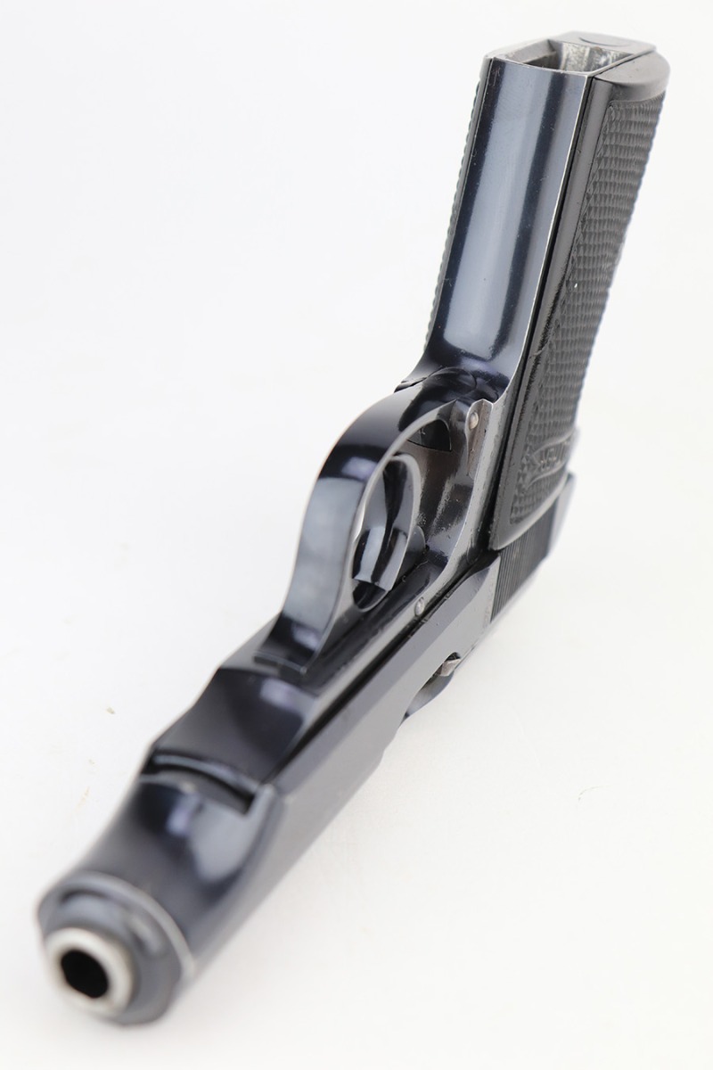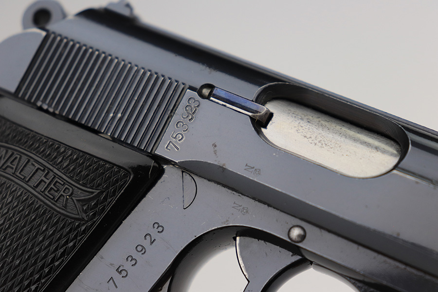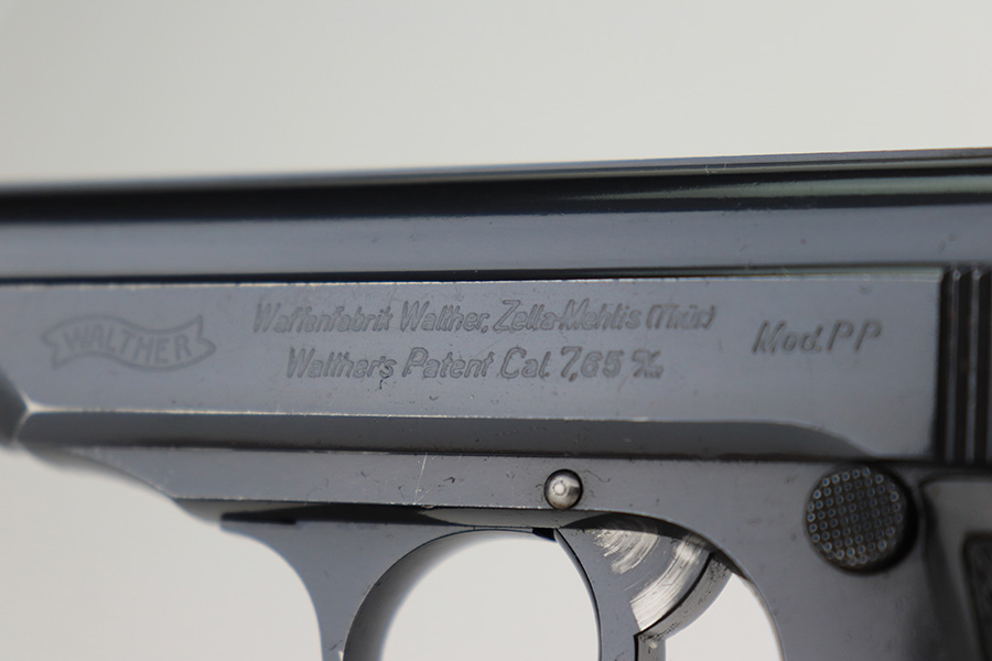 4/13/23 – This is an excellent example of a very early Walther PP that was issued to the Third Reich Banking system in 1930. The gun is all matching and has the proper “Crown N” proofs. It also comes with a bank-numbered finger extension magazine that is not matching but in the same serial range. The slide has the proper panographed numbering and painted sights, characteristics unique to the bank-issued guns. This particular gun is also in the proper serial range for a bank-issued gun and has early features such as a 90-degree safety lever and an extended barrel. It has retained about 97% of its original finish with very minor muzzle wear and some very light scratches on the right side of the slide and on the back strap. Fitted with proper weighted grips – there is some cracking and separation on the left grip panel. The bore is near-mint.