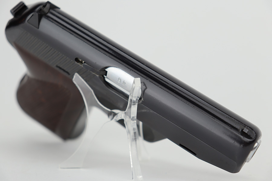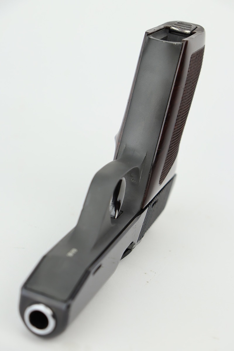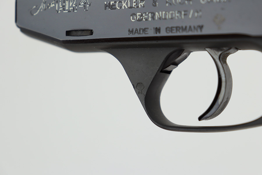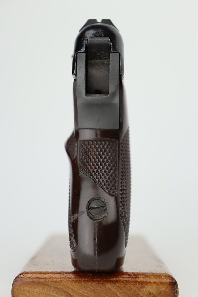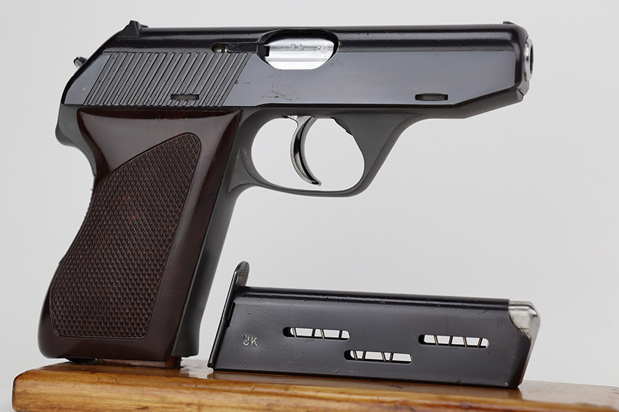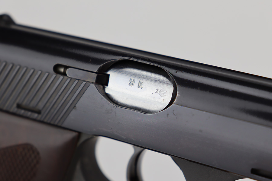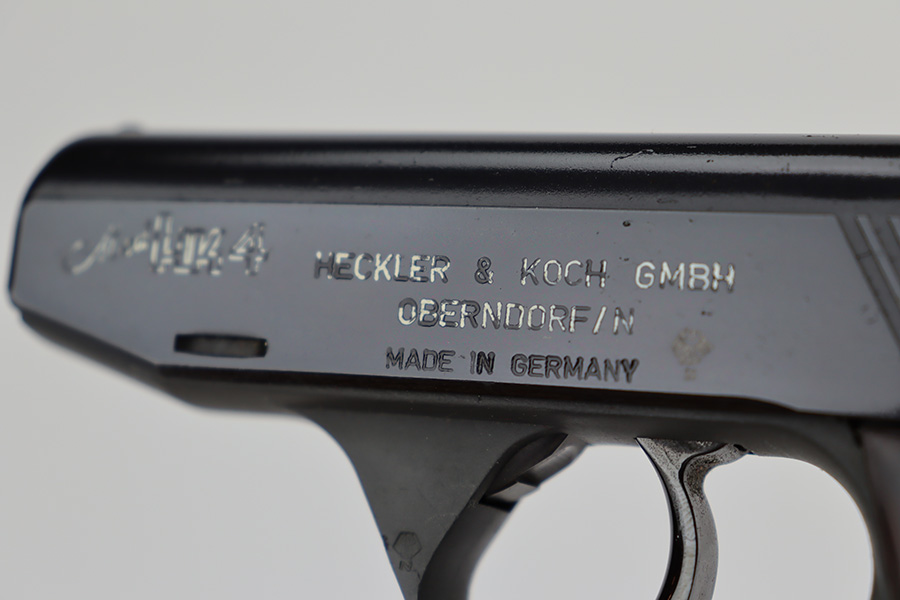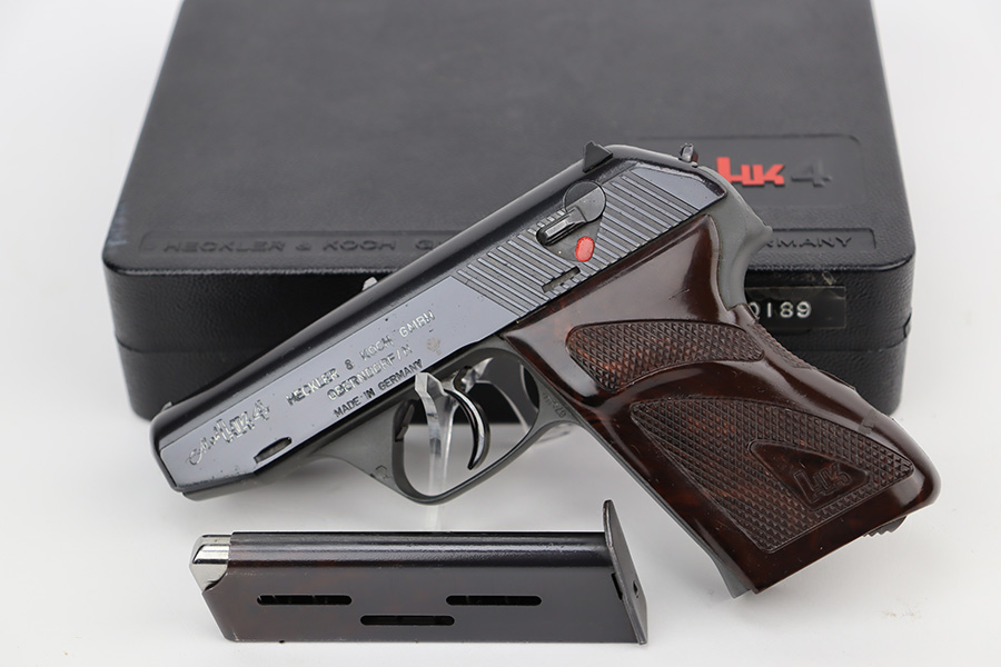 7/14/23 – This is a near-mint example of a Heckler & Koch Model 4, manufactured in 1967 and chambered in 9mm Kurz. It is all matching and has the proper West German proofs. Comes with a period-correct box (matching-numbered label on the front), owners manual, and one magazine. The hinges on the box is broken. The gun has retained essentially all of its finish – there is just a very light streak of discoloration where it looks like there may have been tape at one time. Fitted with very nice marbled brown plastic grips. Mint bore.