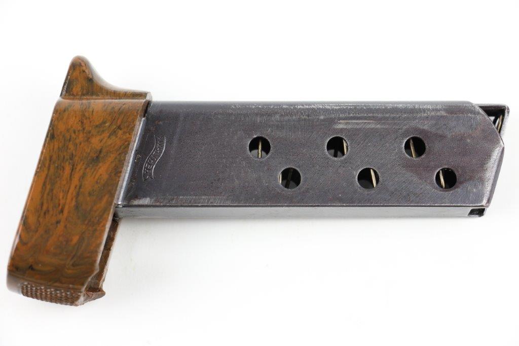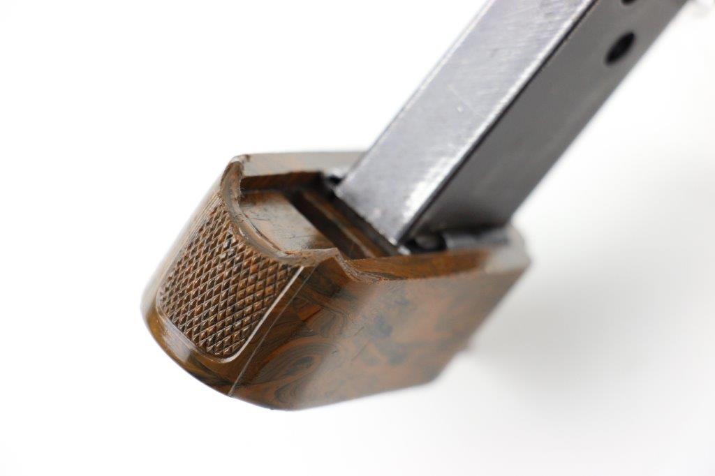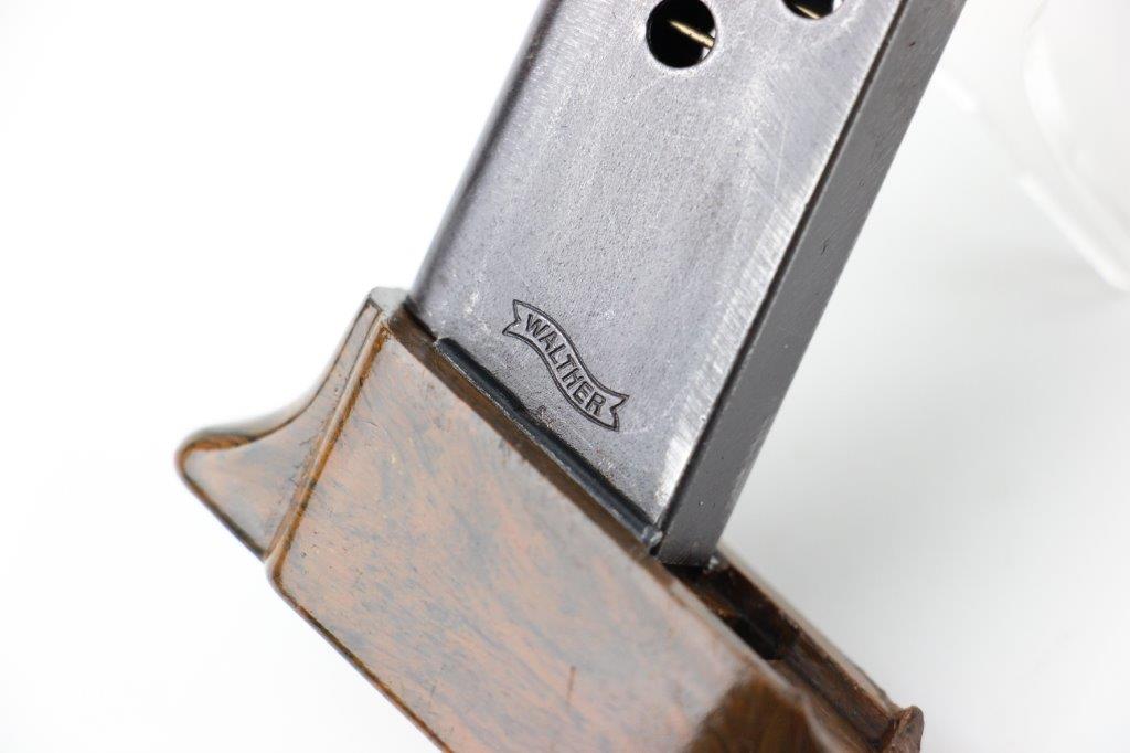 6/25/24 – This is an original WW2 production Walther PPK magazine with a rare boxed finger extension base. The magazine is correct early wartime production with a Walther banner stamped on one side of the tube. There’s light finish loss and mild patina throughout, with an area of finish loss on the right side of the tube, as shown. The finger extension base is brown bakelite with black marbling throughout. Some light surface scratches on the exterior, and the spine of the base is chipped. Despite this, the magazine still fits and functions well, providing additional grip support for PPK users with larger hands. A great example priced to sell!