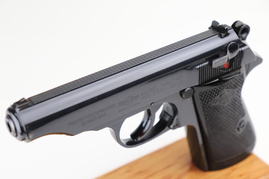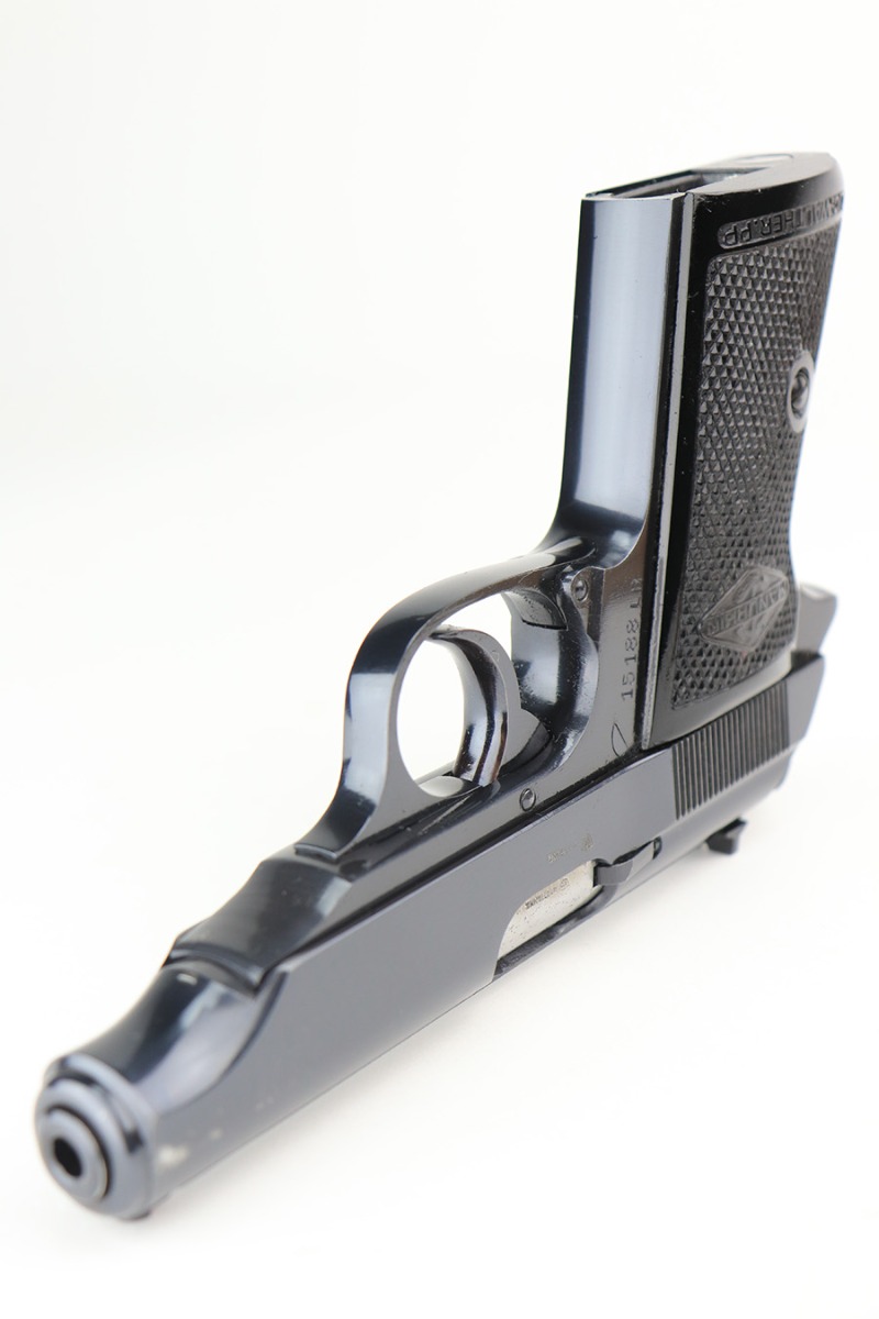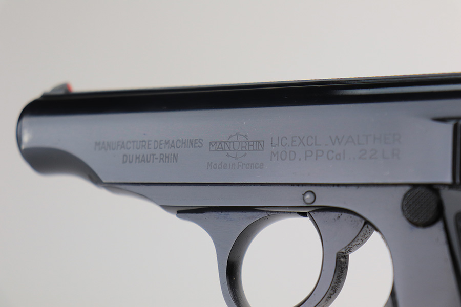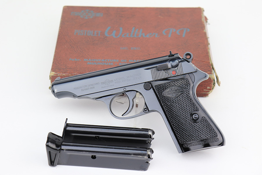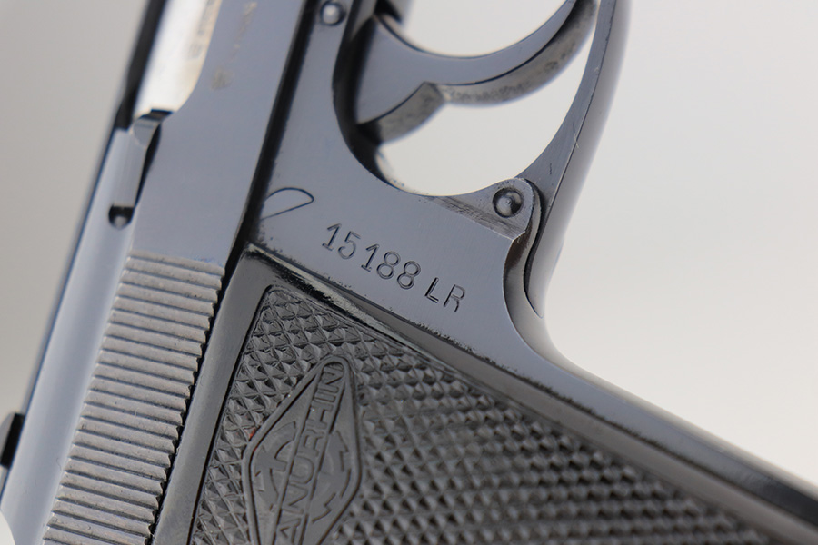 4/5/22 – This is an excellent, early Manurhin PP in its original, matching box. It has about 97% of the original blue remaining with most of the wear on either side of the muzzle. Mint bore and grips. Box includes a spare flat-bottom magazine, and the pistol has a finger extension on the other mag. Made in France, no import mark. The box shows some wear and separation but the label is intact and has the matching serial to the pistol. C&R eligible.
