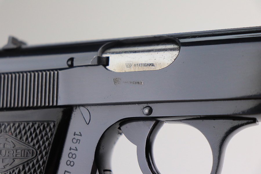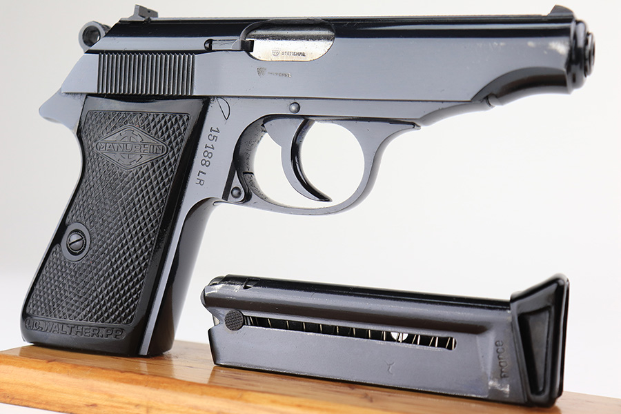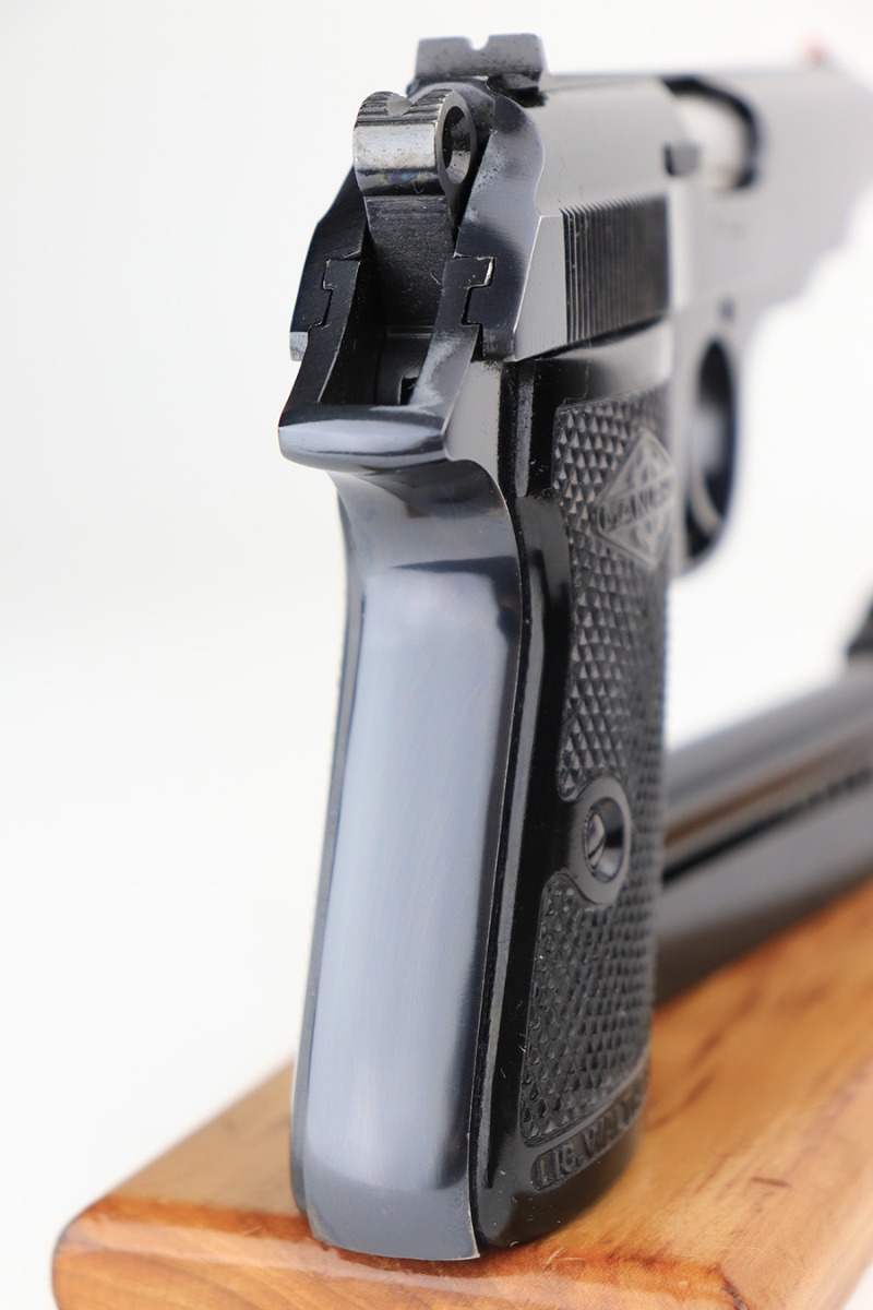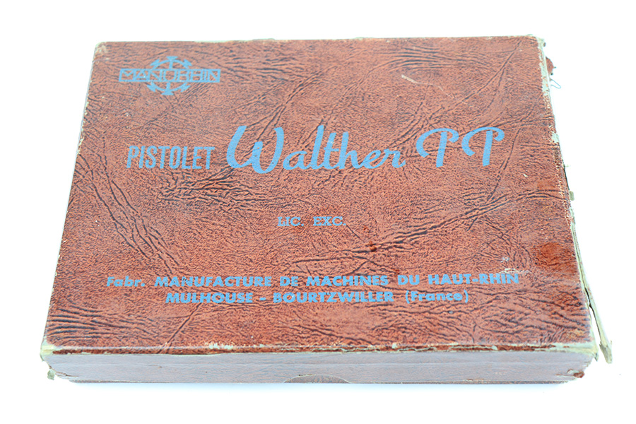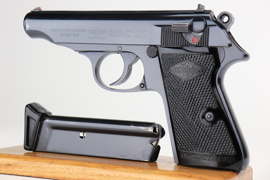 4/5/22 – This is an excellent, early Manurhin PP in its original, matching box. It has about 97% of the original blue remaining with most of the wear on either side of the muzzle. Mint bore and grips. Box includes a spare flat-bottom magazine, and the pistol has a finger extension on the other mag. Made in France, no import mark. The box shows some wear and separation but the label is intact and has the matching serial to the pistol. C&R eligible.