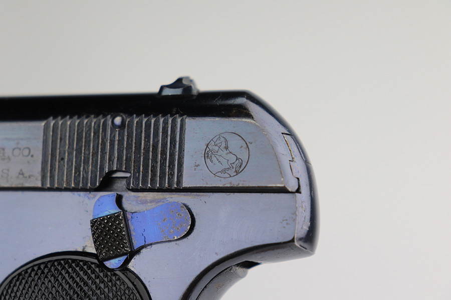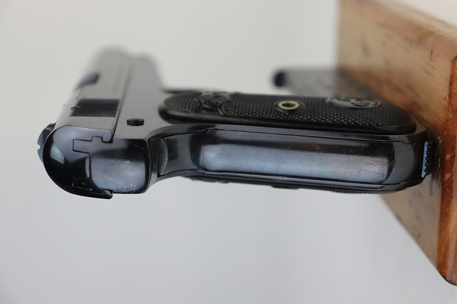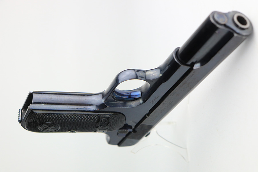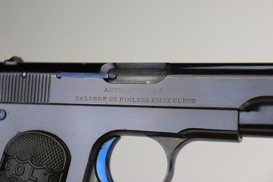 12/1/21 – This is an excellent, early Colt M1903 pocket hammerless from 1908. It has about 97% of the original, lustrous Colt bluing. There’s very little actual bluing loss, but there are several patches of freckling on the safety and left side of slide. Minor high edge wear on the slide, and some patina/oxidation on grip safety. Beautiful fire blue on the small parts. Bore has strong rifling but a little frost in the grooves. This listing also includes a spare magazine, and a custom display case.