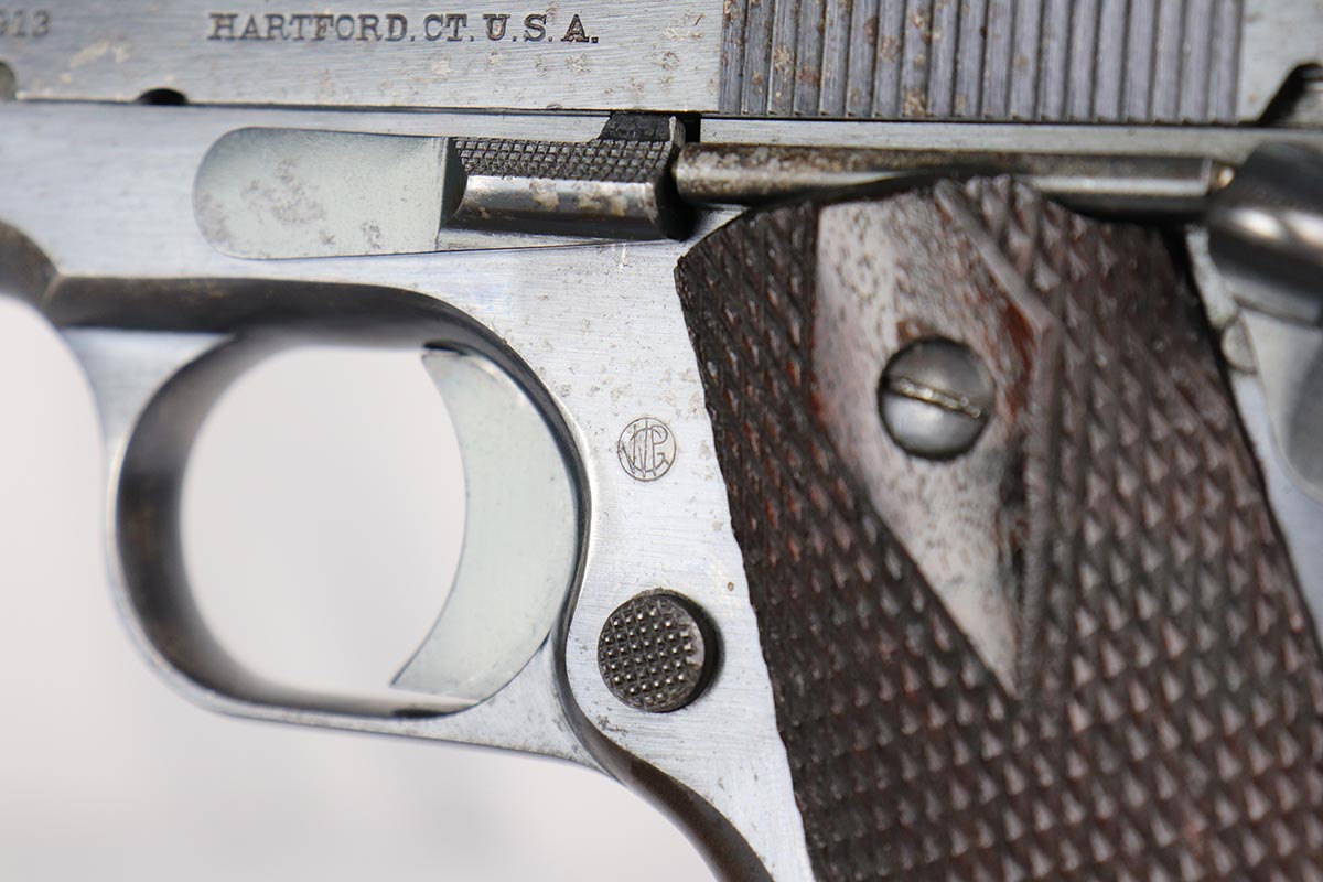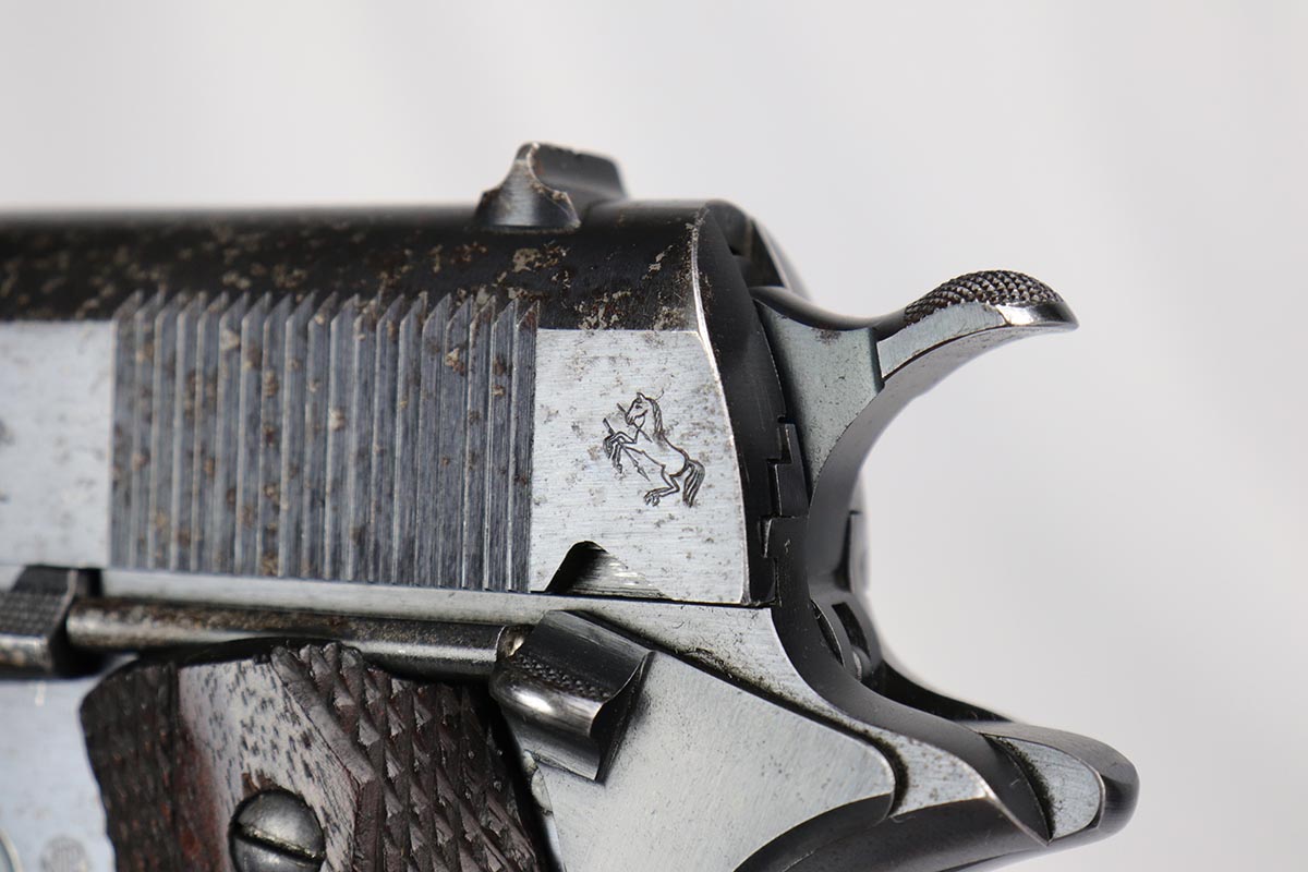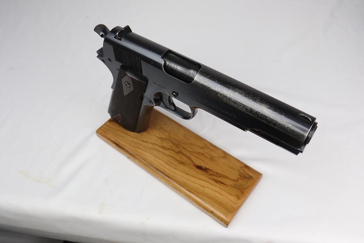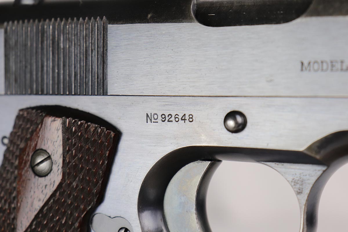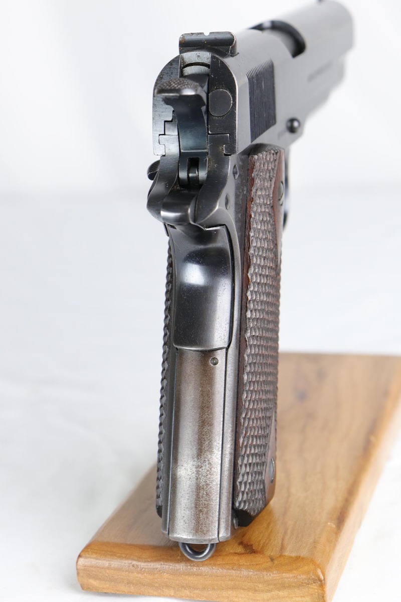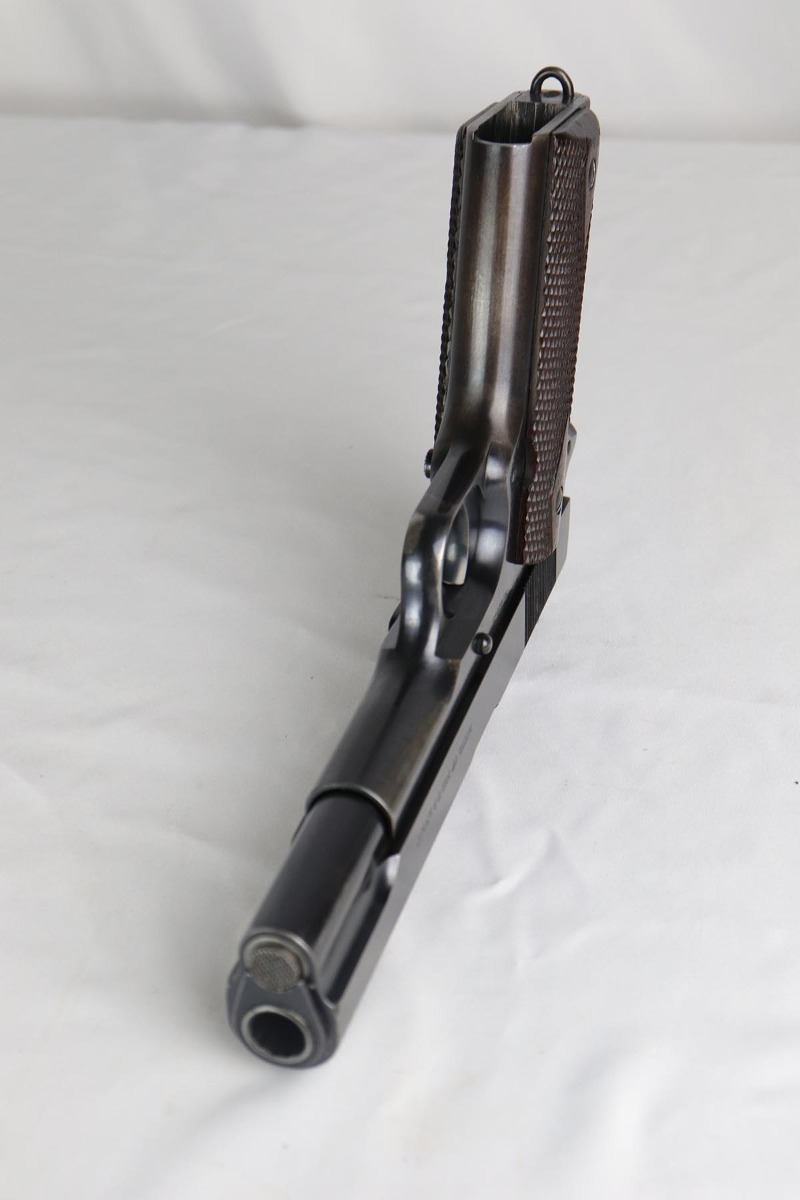 8/10/18 – This is an early and scarce Colt 1911 from 1914, when fewer than 40,000 were produced. It has a nice brushed blue finish with correct barrel and H marked slide. The finish rates at 80-85% with thinning on the straps and spots of finish loss on the slide that look similar to when a pistol has been exposed to (salt) water. Excellent grips and bore.