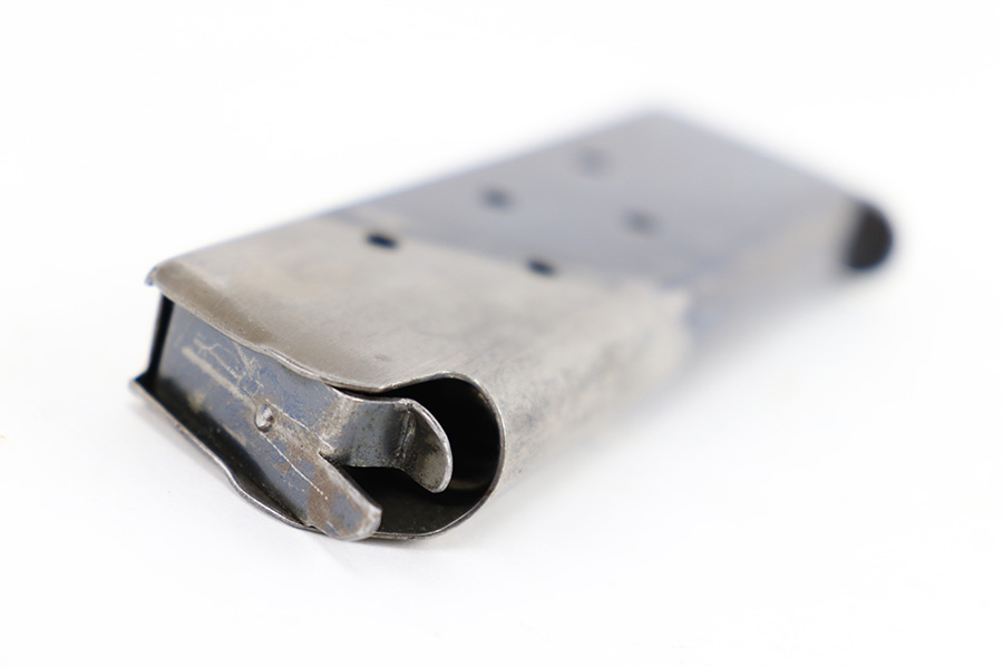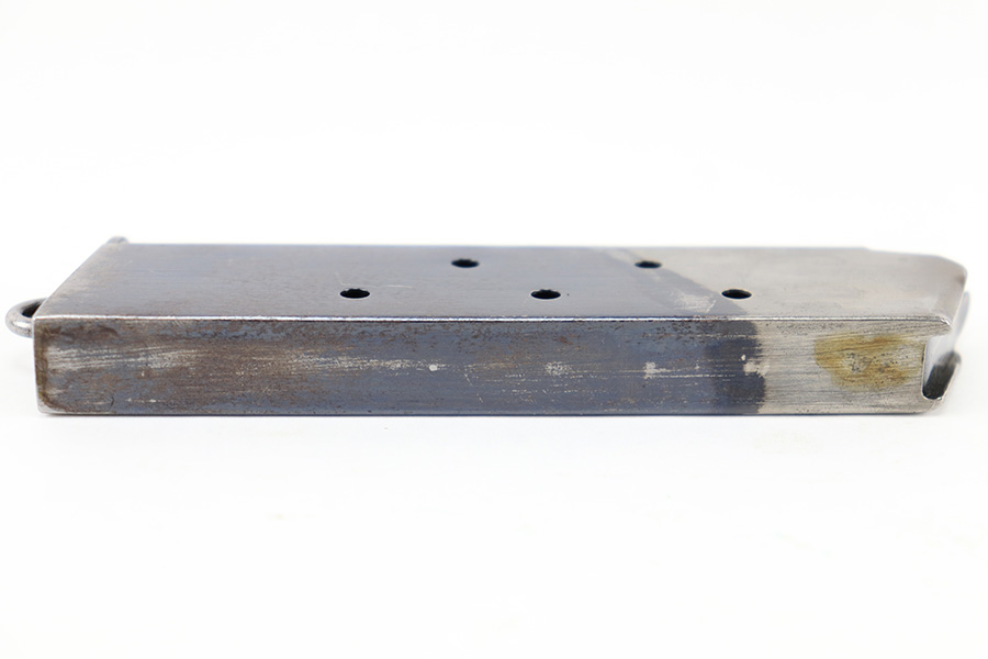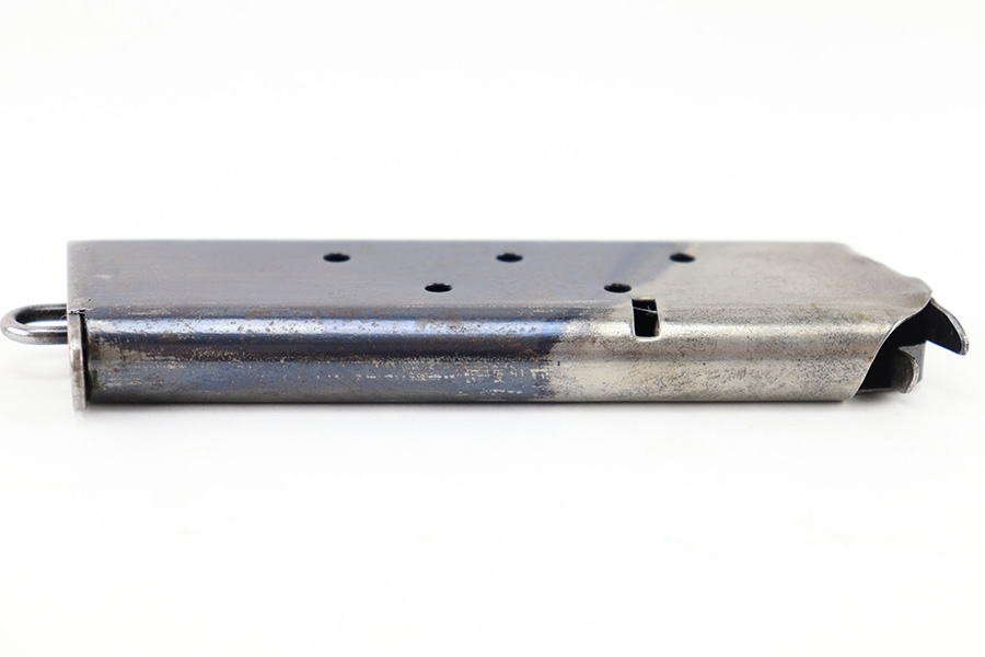 8/15/23 – This is an original, early WW1 production Colt M1911 pistol magazine. The magazine has a two-toned finish with a majority of the magazine retaining the original bluing. The base has an original lanyard loop as well. No markings or stamps, but made in the typical Colt style with 2 pins retaining the base. There’s light surface patina and mild discoloration throughout but no rust or pitting. The spring is strong and functional.