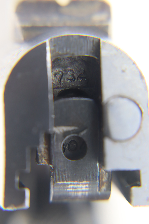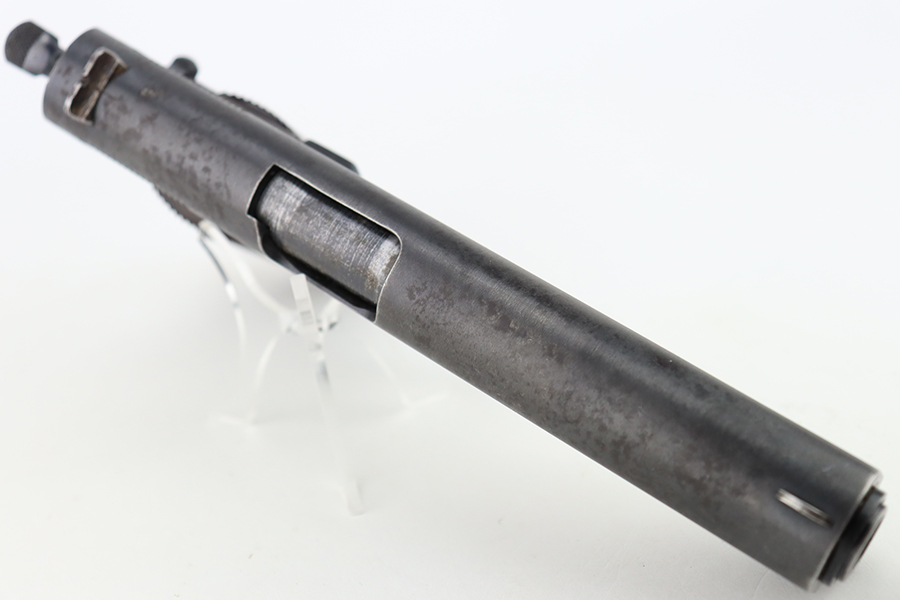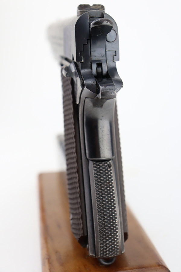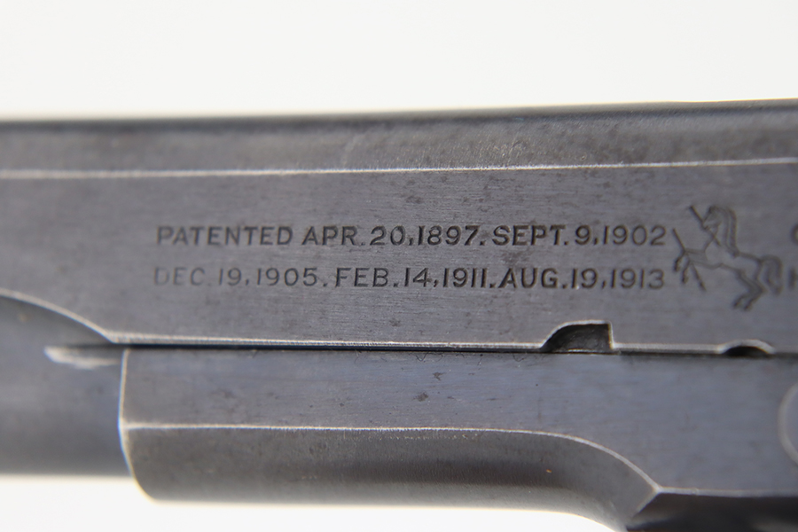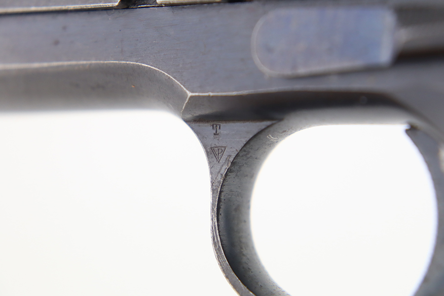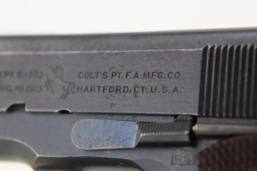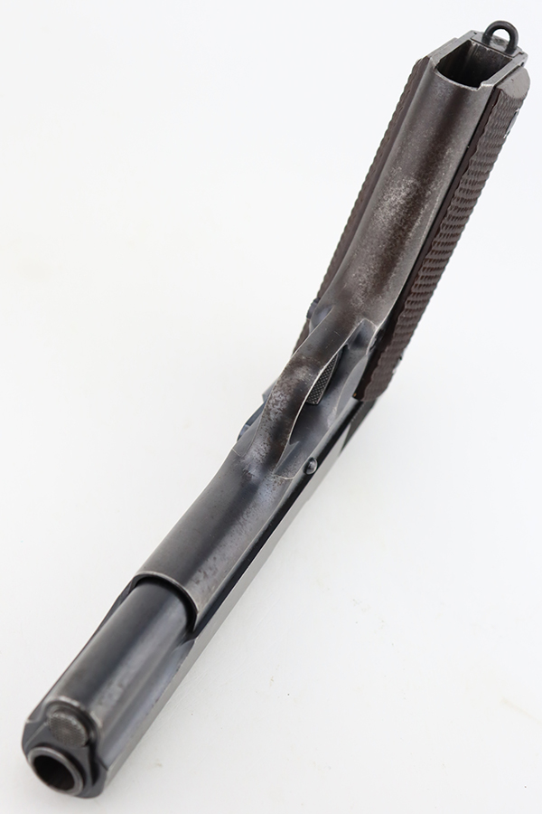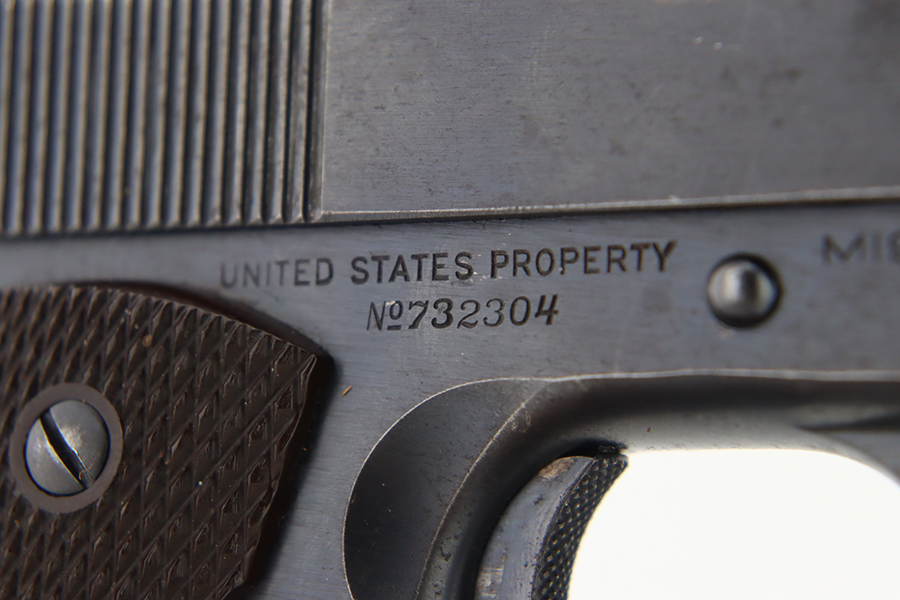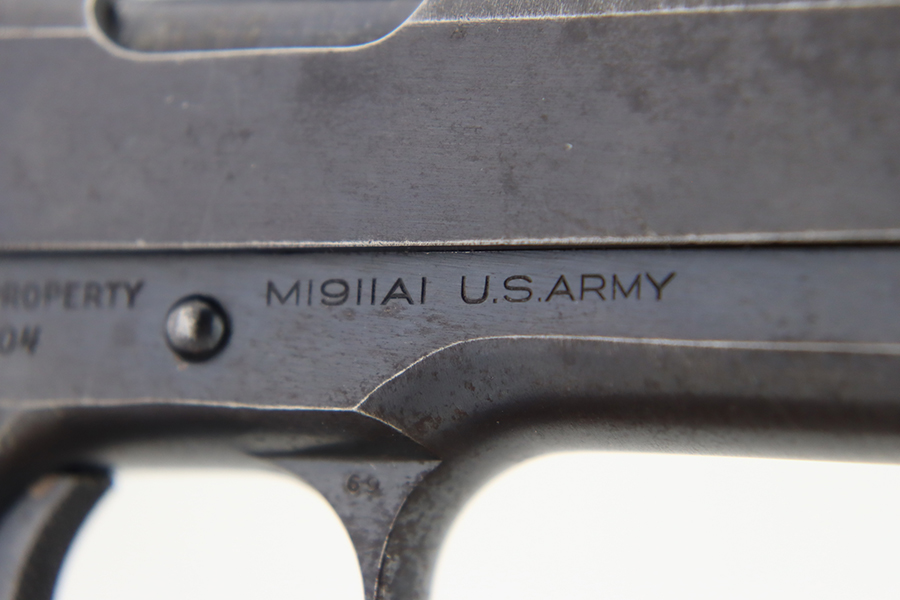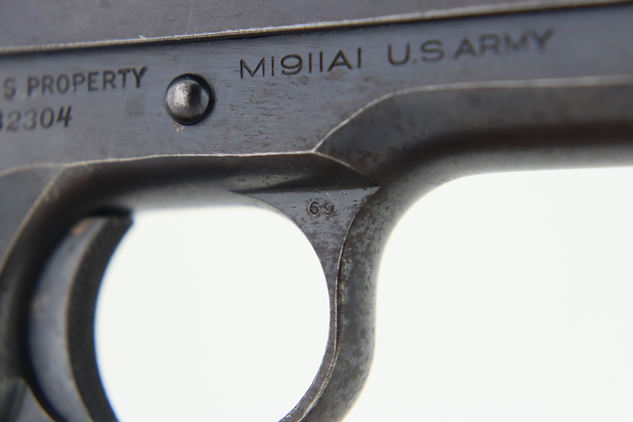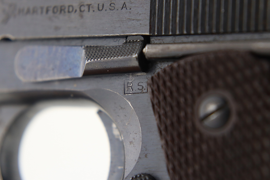 1/16/24 – This is a very nice example of an early Colt 1911A1, issued to the US Military in 1941. It is “US Property”-marked and has the proper “RS” inspector initials. “P” proofs on the frame and slide. The slide is numbered and matching to the receiver. It has a “Colt .45” barrel with a “G” under the lug. This gun has retained about ~80% of its beautiful Colt blue. The takedown lever is still fire-blued. There is minor muzzle wear, minor wear on some of the high edges, some minor thinning on the top of the slide, and an area of wear on the front strap. The most noticeable sign of wear is spotty oxidation throughout, most visible on the slide and underside of the frame and front strap. Two small areas of minor pitting around the muzzle. There are a few surface scratches here and there. Comes with excellent Colt grips and a two-tone magazine. The bore is not bad, but the rifling is a little worn and there is minor pitting throughout.