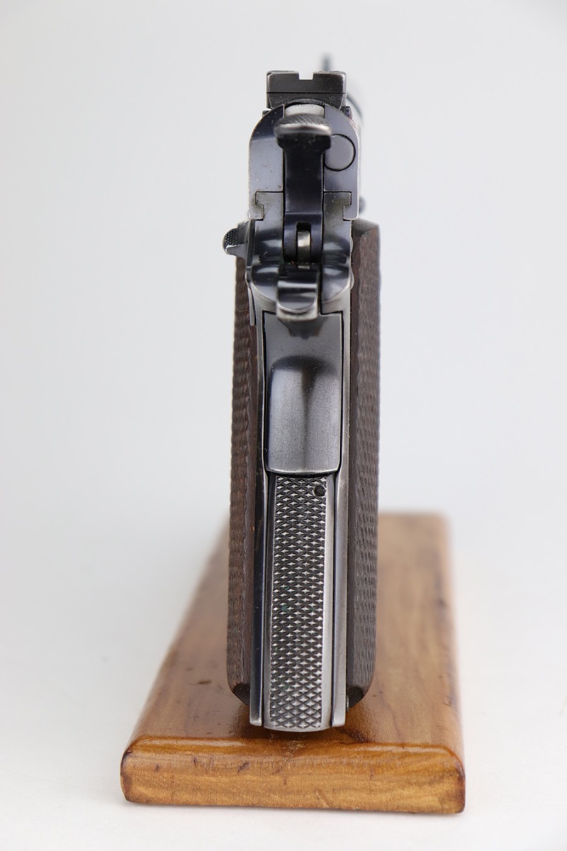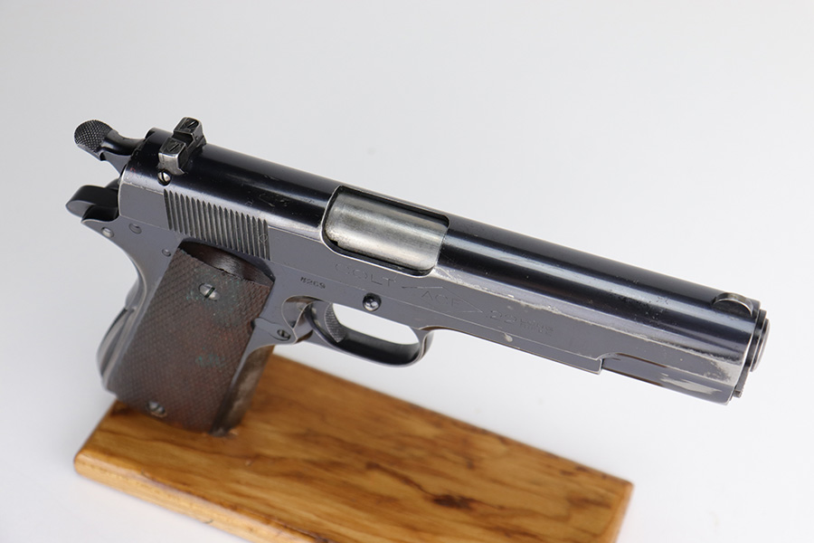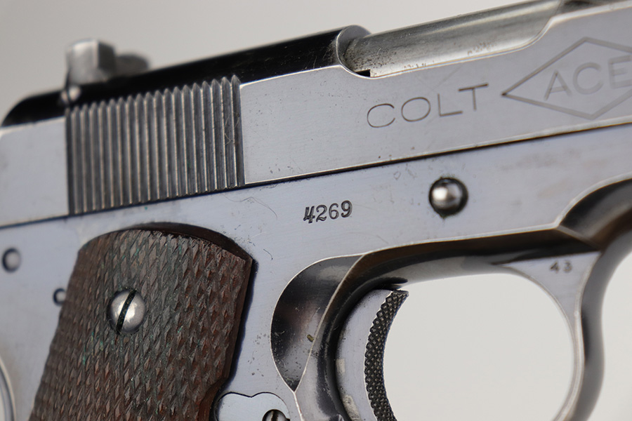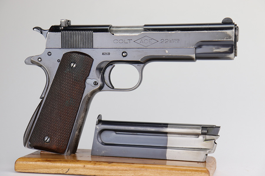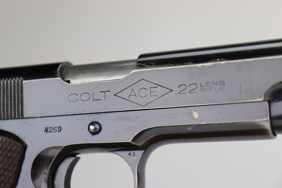 12/14/22 – This is a nice example of an early Colt Ace Model 1911A1 manufactured in 1931 and chambered in .22 LR. The gun is all correct and has retained about 70% of its original high polish Colt bluing. The vast majority of the finish loss is on the front strap, but there is also wear on the edges of the slide and frame. Comes with nice wood grips and one two-tone ACE mag. The bore is mint.