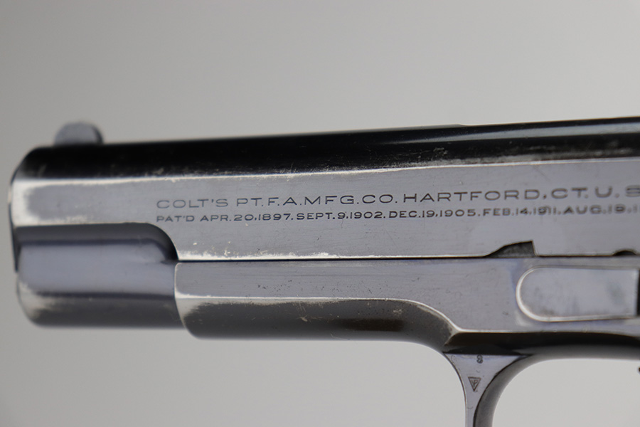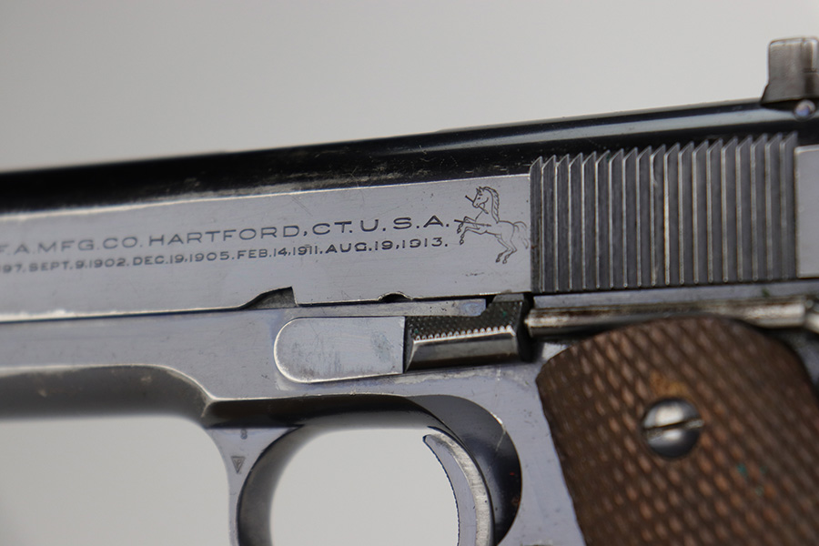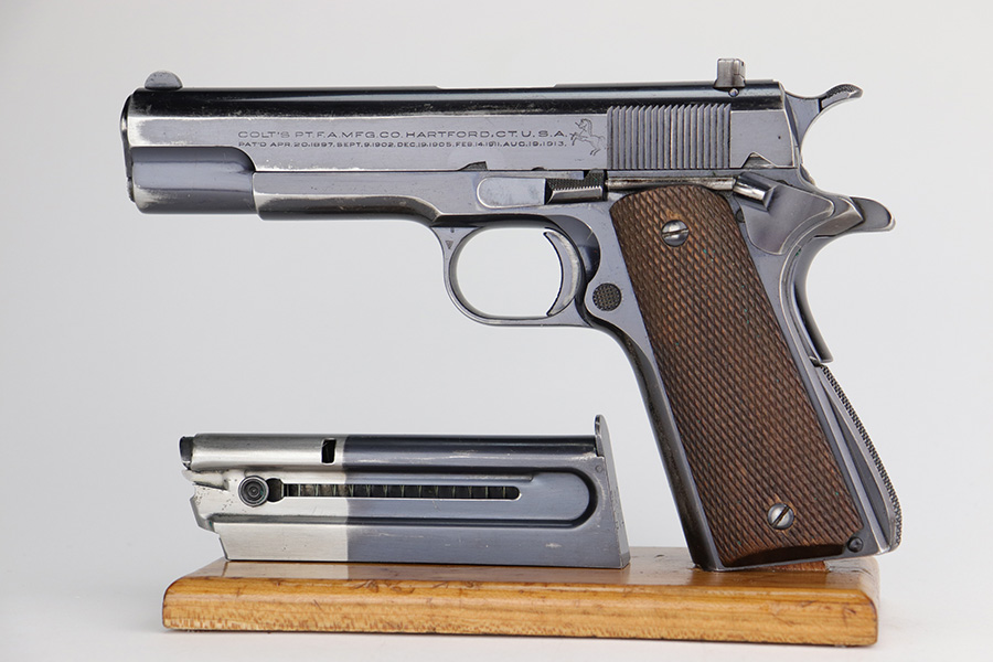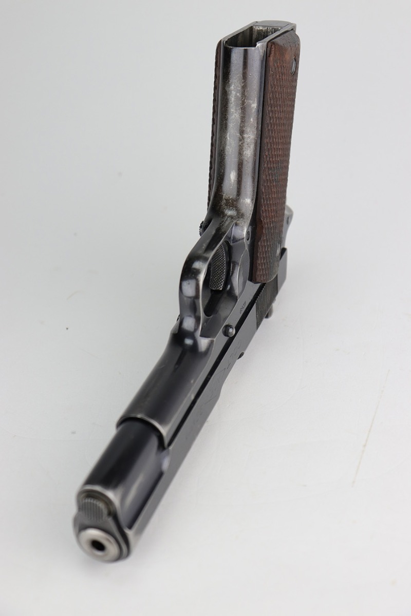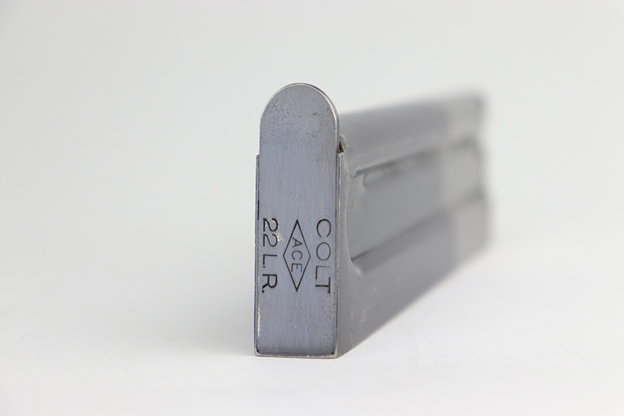 12/14/22 – This is a nice example of an early Colt Ace Model 1911A1 manufactured in 1931 and chambered in .22 LR. The gun is all correct and has retained about 70% of its original high polish Colt bluing. The vast majority of the finish loss is on the front strap, but there is also wear on the edges of the slide and frame. Comes with nice wood grips and one two-tone ACE mag. The bore is mint.