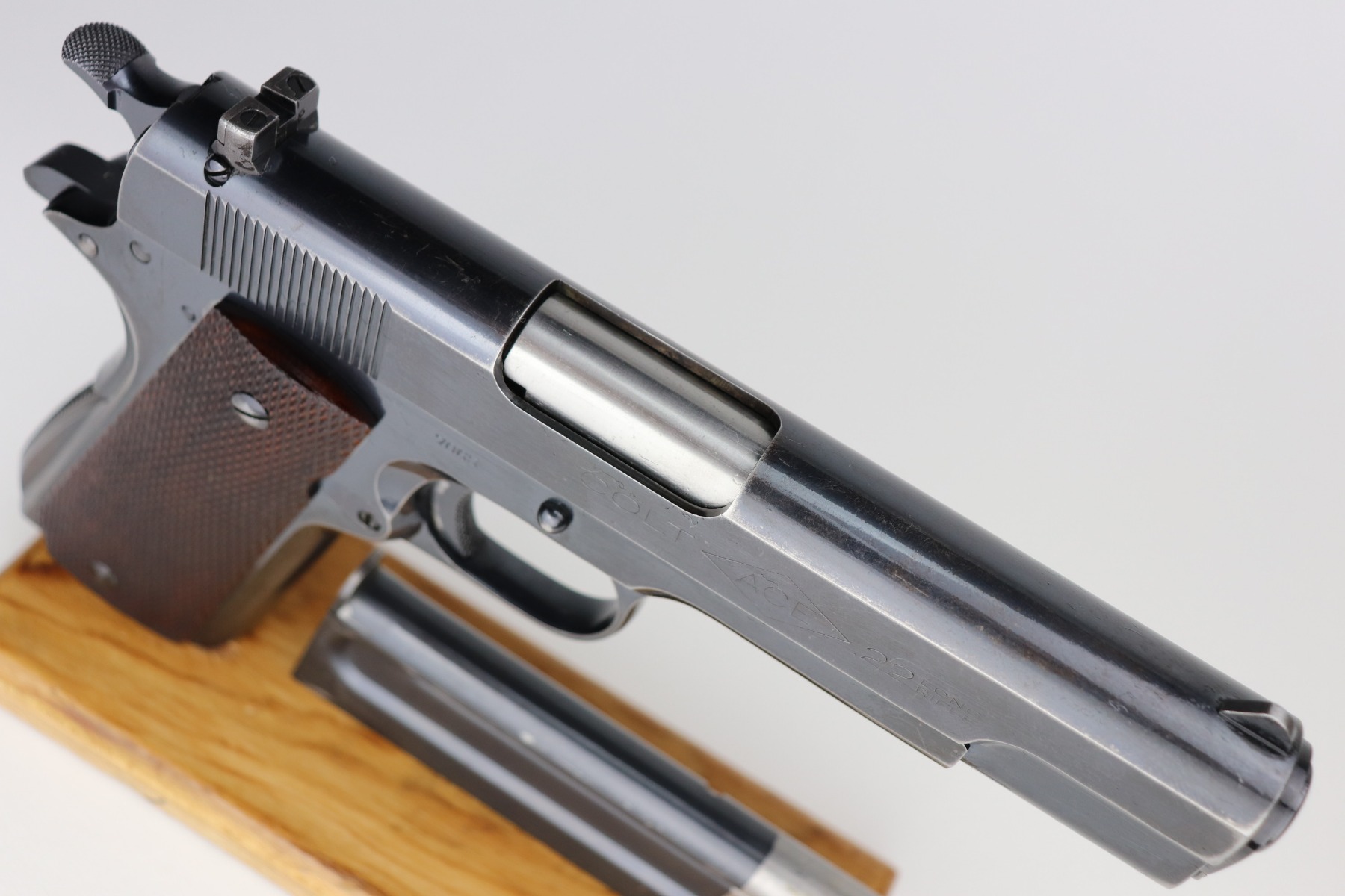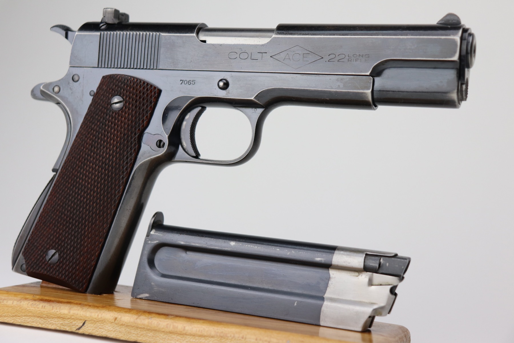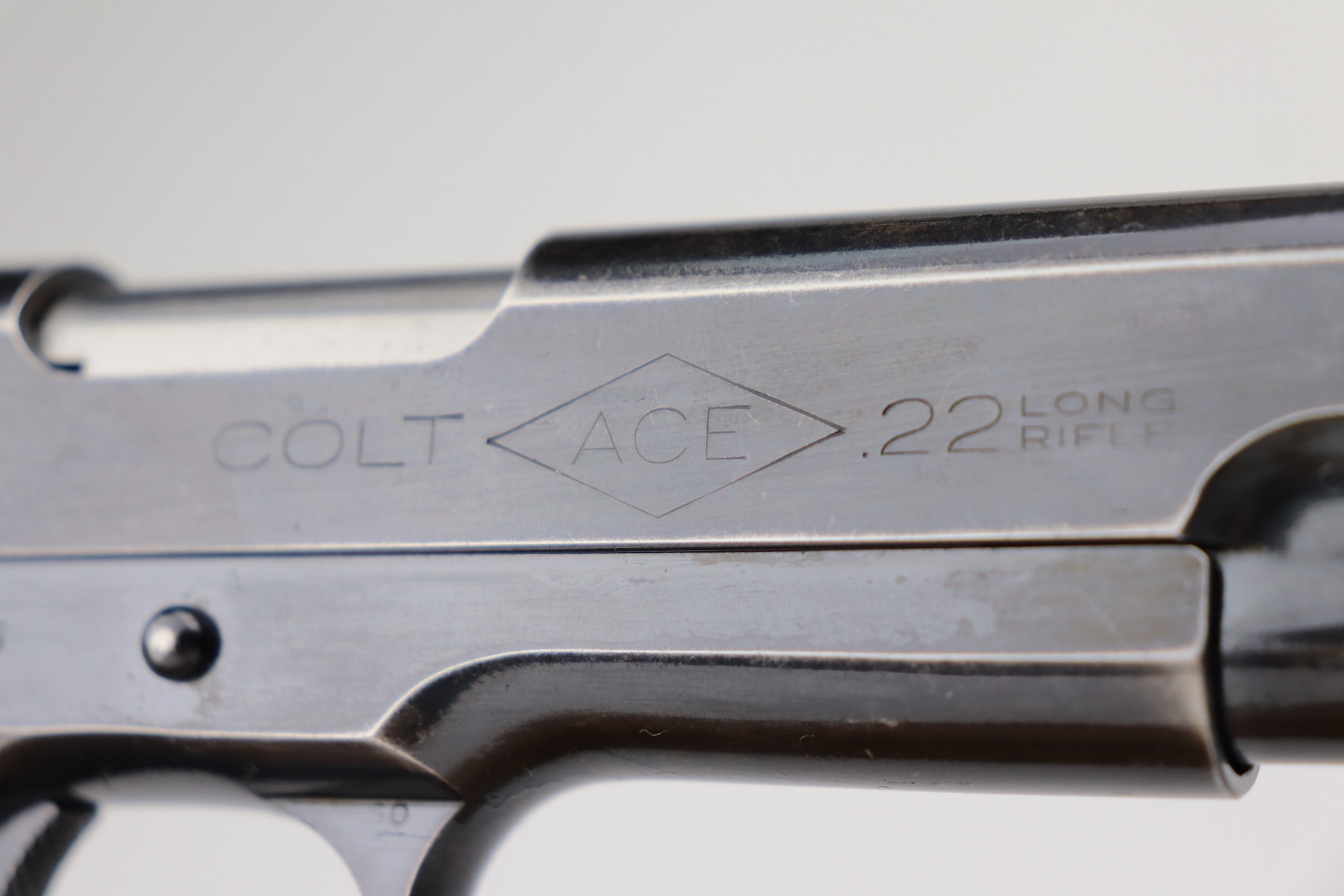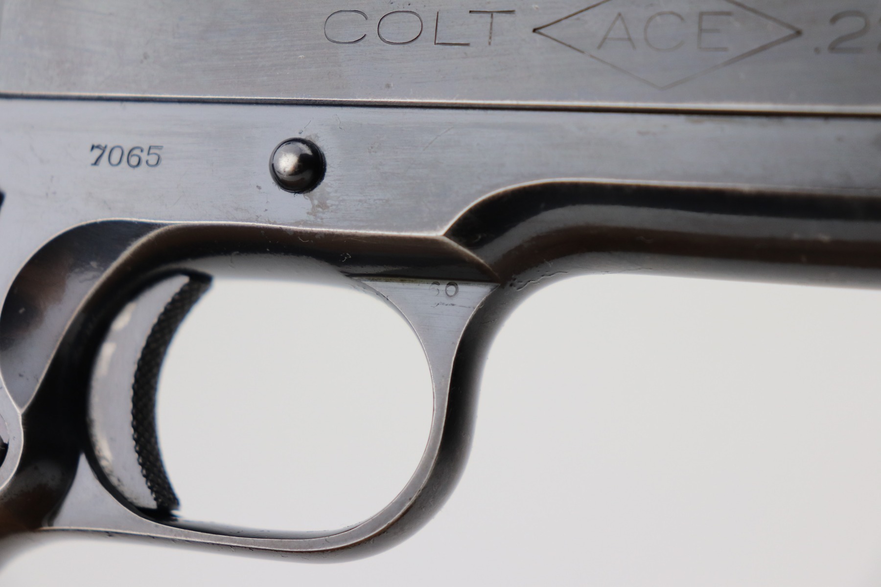 3/10/21 – This is an early example of a Colt ACE sold in the commercial market in 1936, and chambered in .22LR. It has an early high polish finish but the front strap has been professionally touched up. It has retained about 90% of the bluing. There is minor thinning on the straps and minor wear/micro scratches along the high edges of the slide and around the muzzle. It comes with excellent wood grips and a proper ACE magazine. The bore is mint.