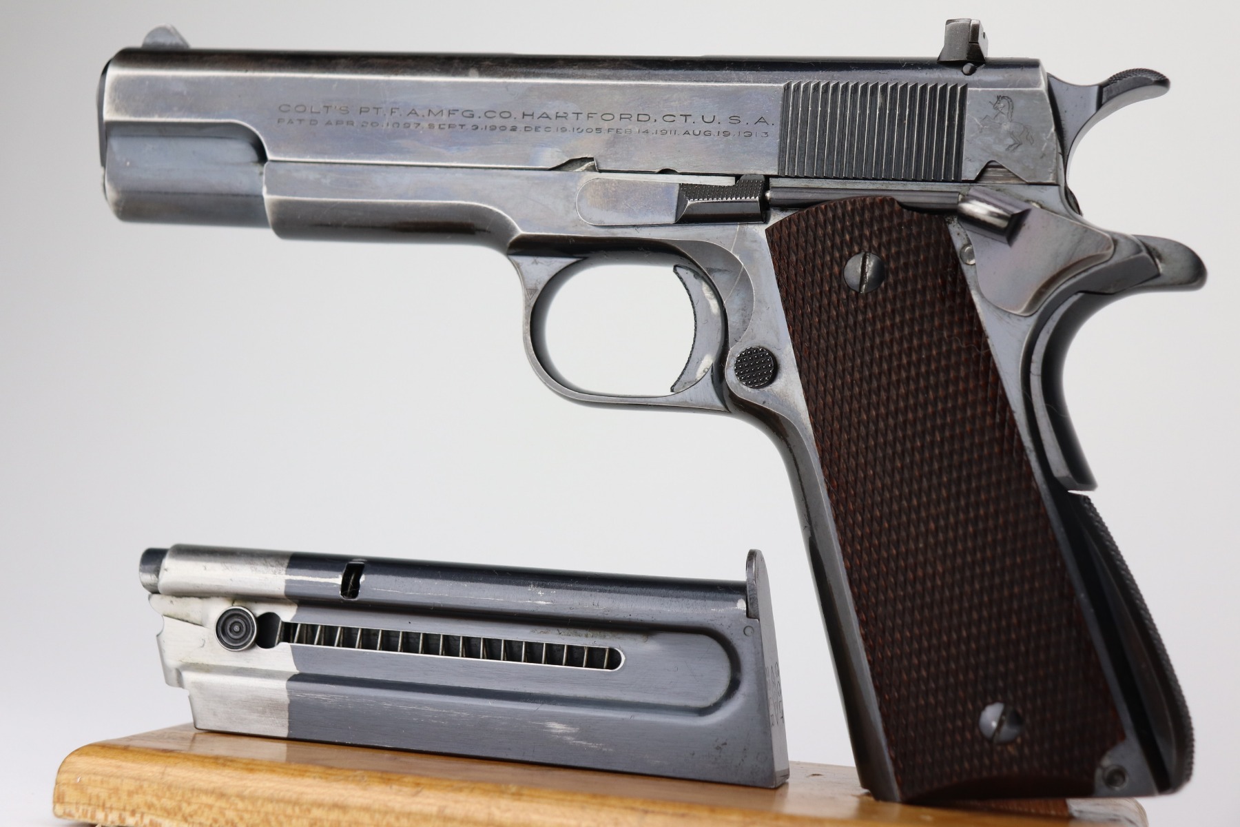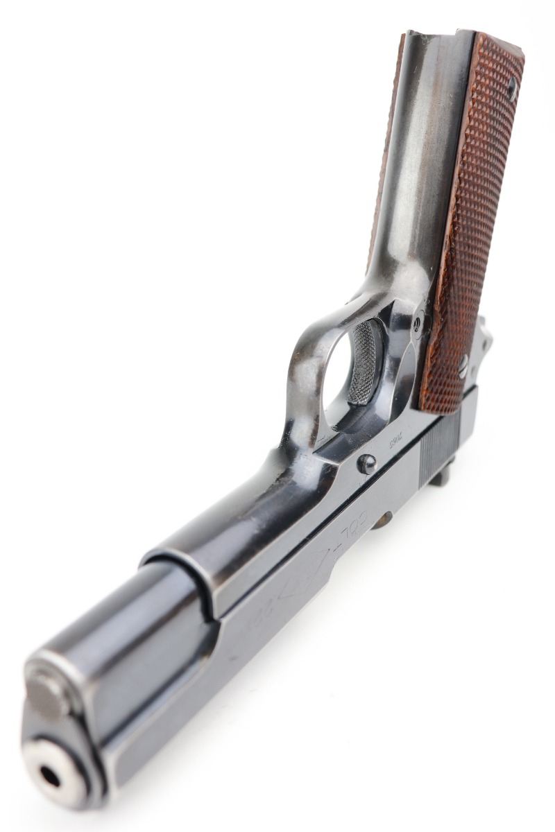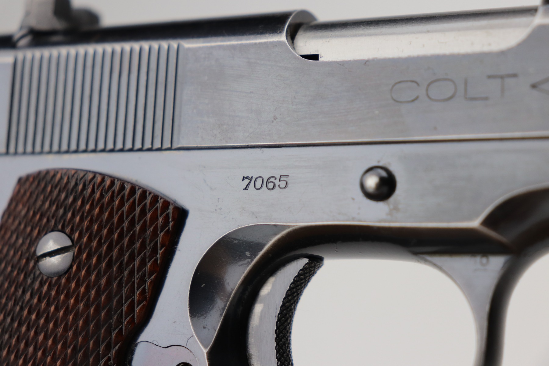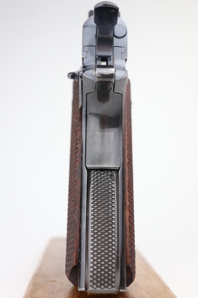 3/10/21 – This is an early example of a Colt ACE sold in the commercial market in 1936, and chambered in .22LR. It has an early high polish finish but the front strap has been professionally touched up. It has retained about 90% of the bluing. There is minor thinning on the straps and minor wear/micro scratches along the high edges of the slide and around the muzzle. It comes with excellent wood grips and a proper ACE magazine. The bore is mint.