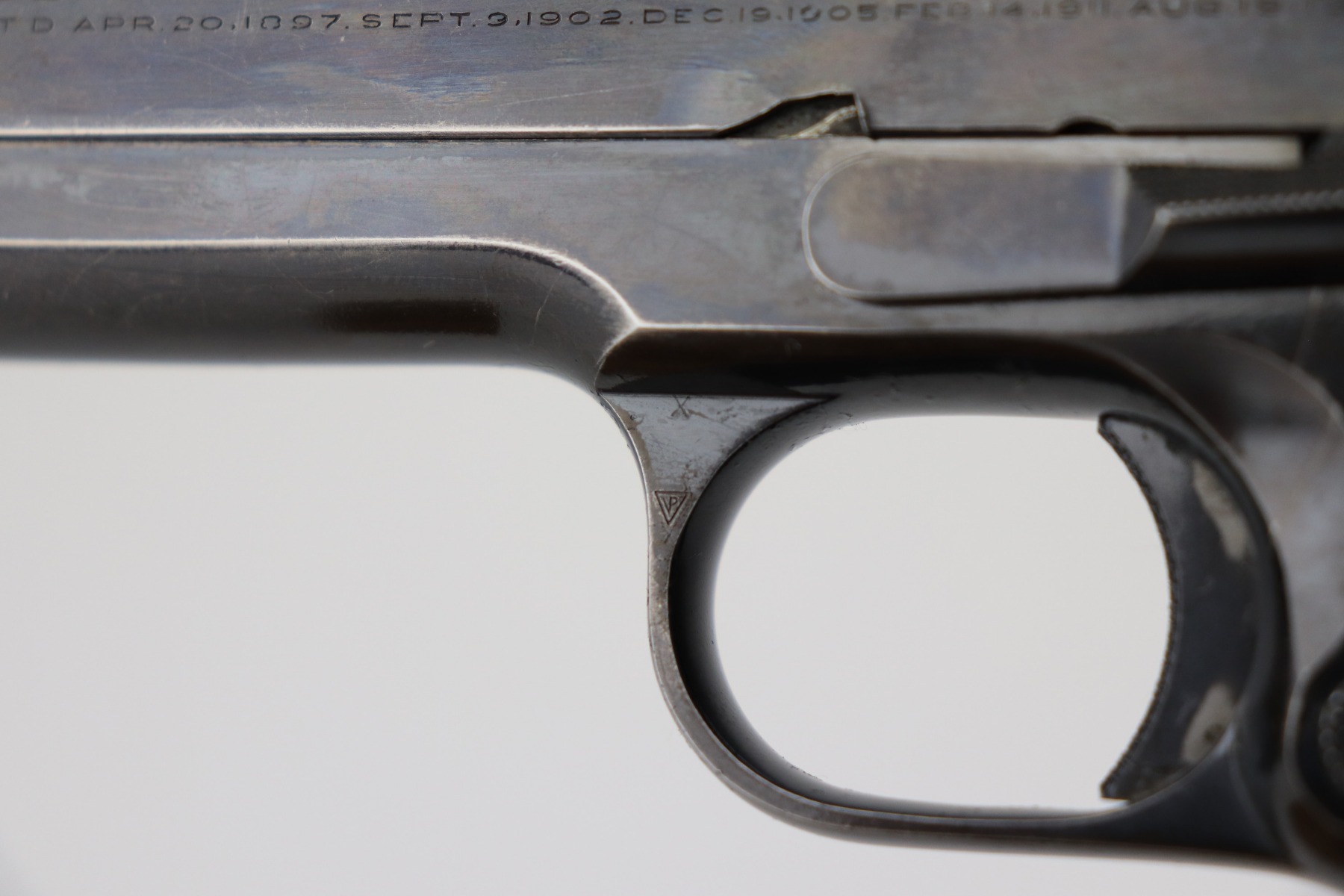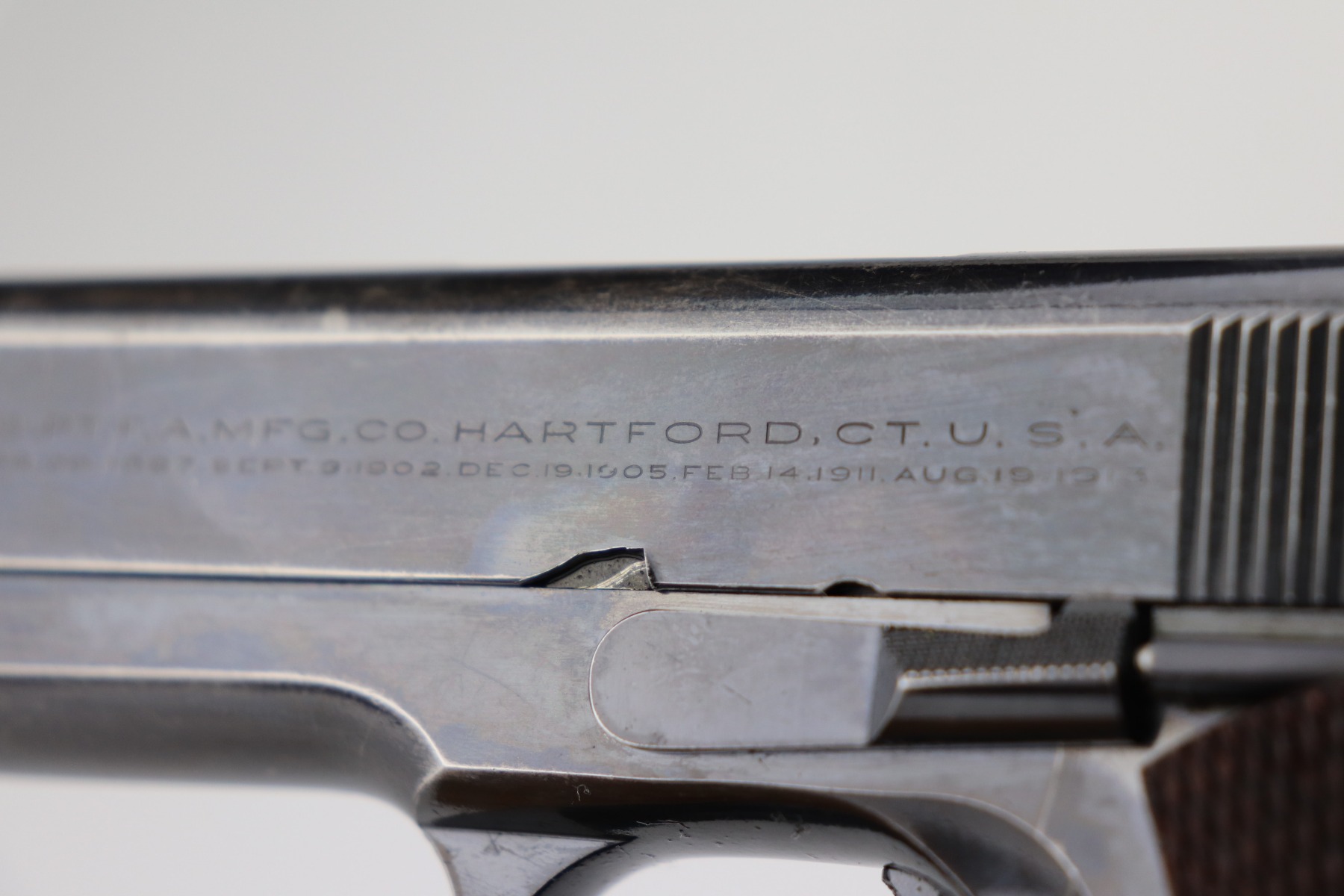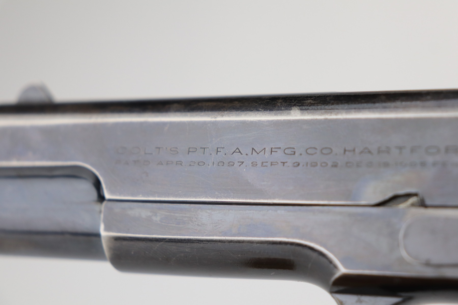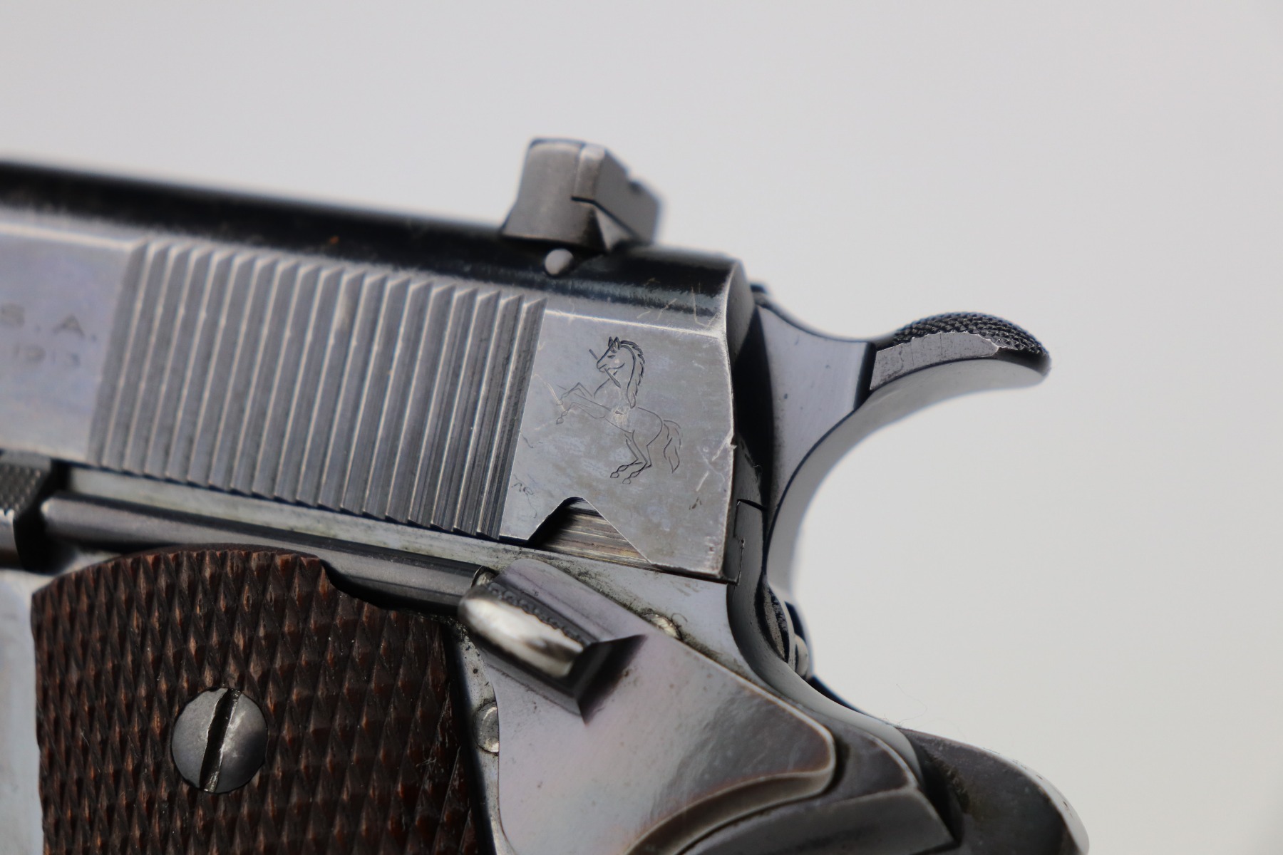 3/10/21 – This is an early example of a Colt ACE sold in the commercial market in 1936, and chambered in .22LR. It has an early high polish finish but the front strap has been professionally touched up. It has retained about 90% of the bluing. There is minor thinning on the straps and minor wear/micro scratches along the high edges of the slide and around the muzzle. It comes with excellent wood grips and a proper ACE magazine. The bore is mint.