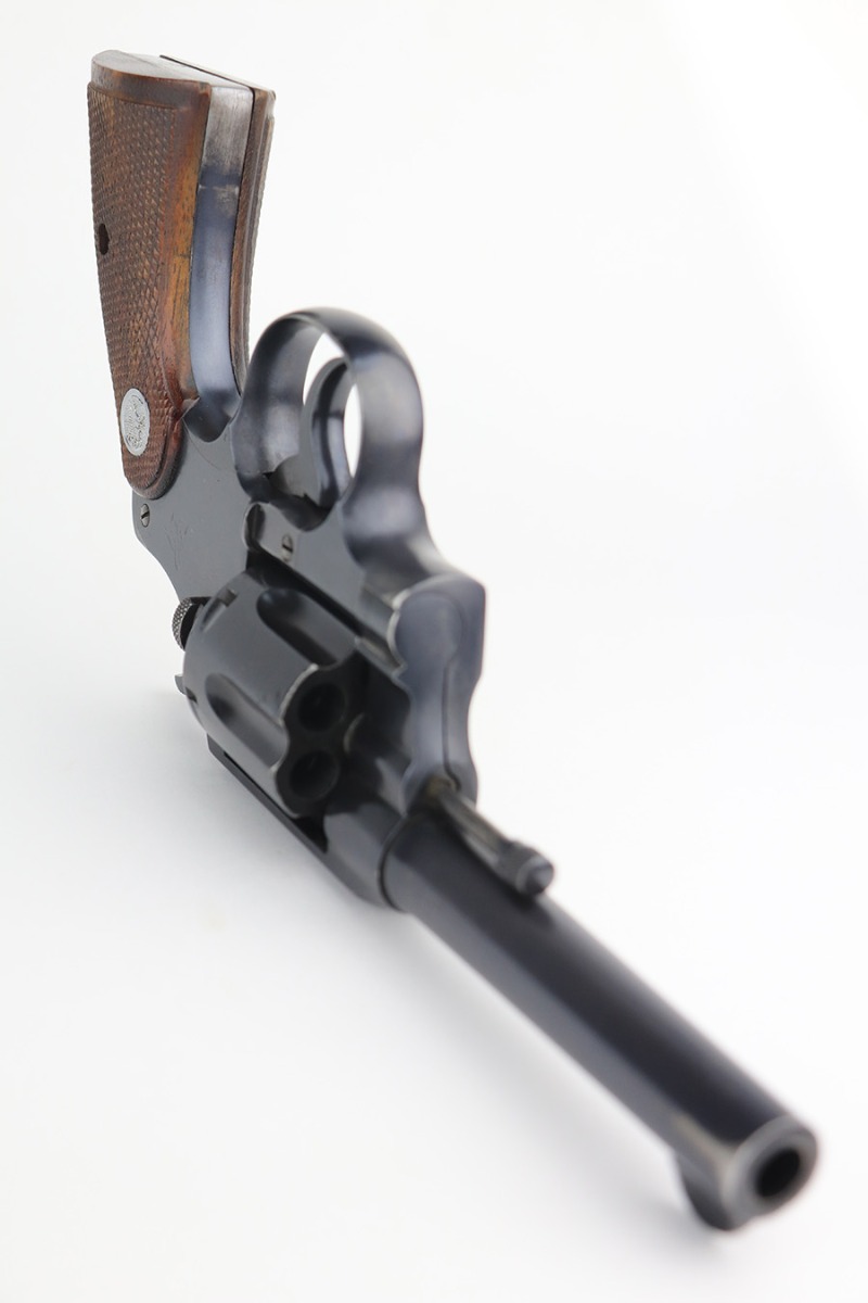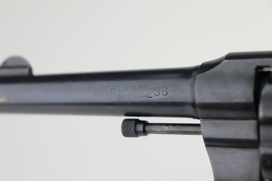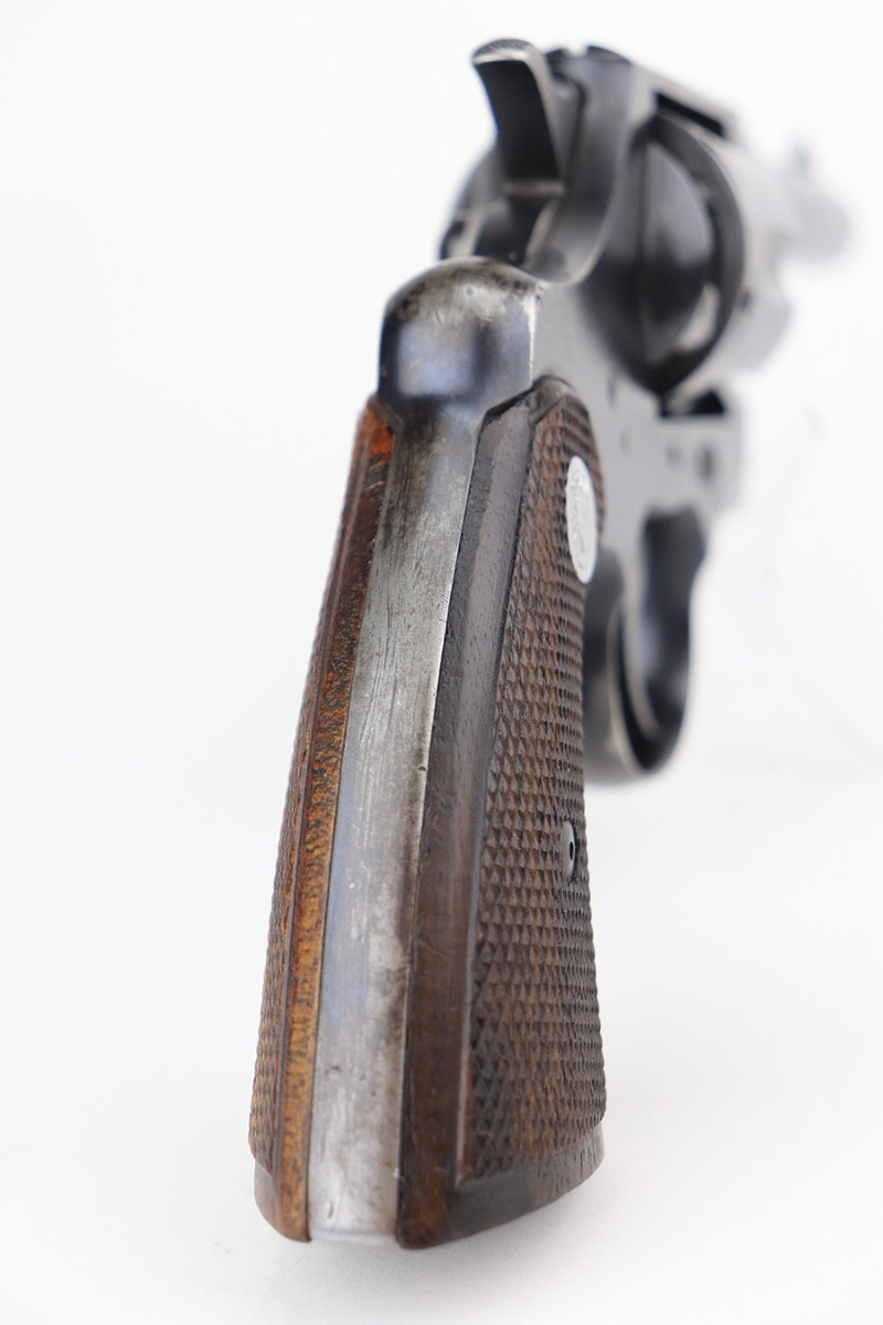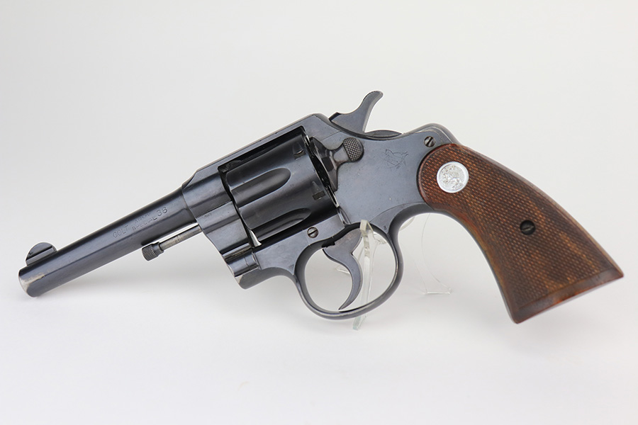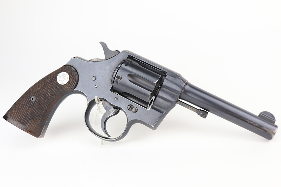2/11/22 – This is an early Colt Army Special revolver from 1912. Released in 1908 as the Colt Army Special, the revolver was renamed the “Colt’s Official Police” in 1927 in order to better market to law enforcement agencies. It became one of the best selling police firearms of all time, eventually in the 1950s coming to exemplify typical law enforcement officer weaponry. This early example features the “surfboard” Colt logo. The gun has about 85-90% bluing coverage but appears to be an old re-blue. Excellent, shiny bore. Good mechanics. Excellent wood grips aside from a small chip in the bottom of the right panel.
