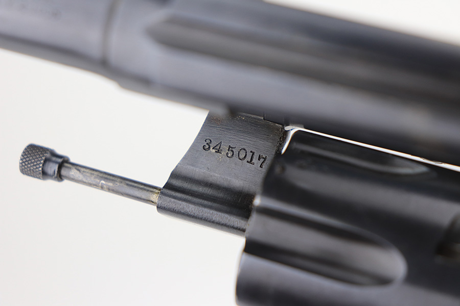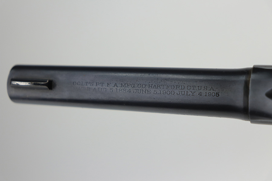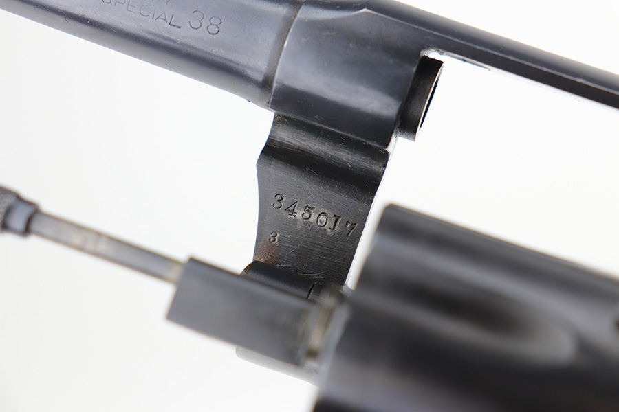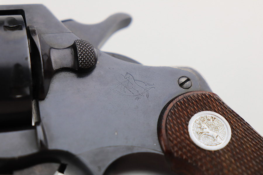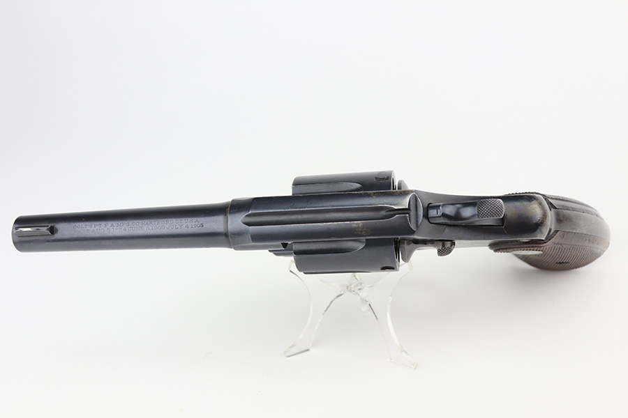 2/11/22 – This is an early Colt Army Special revolver from 1912. Released in 1908 as the Colt Army Special, the revolver was renamed the “Colt’s Official Police” in 1927 in order to better market to law enforcement agencies. It became one of the best selling police firearms of all time, eventually in the 1950s coming to exemplify typical law enforcement officer weaponry. This early example features the “surfboard” Colt logo. The gun has about 85-90% bluing coverage but appears to be an old re-blue. Excellent, shiny bore. Good mechanics. Excellent wood grips aside from a small chip in the bottom of the right panel.