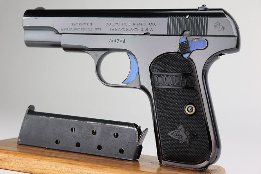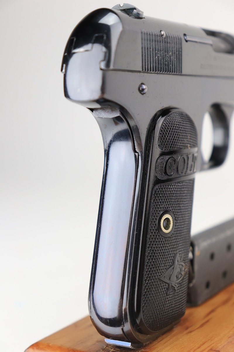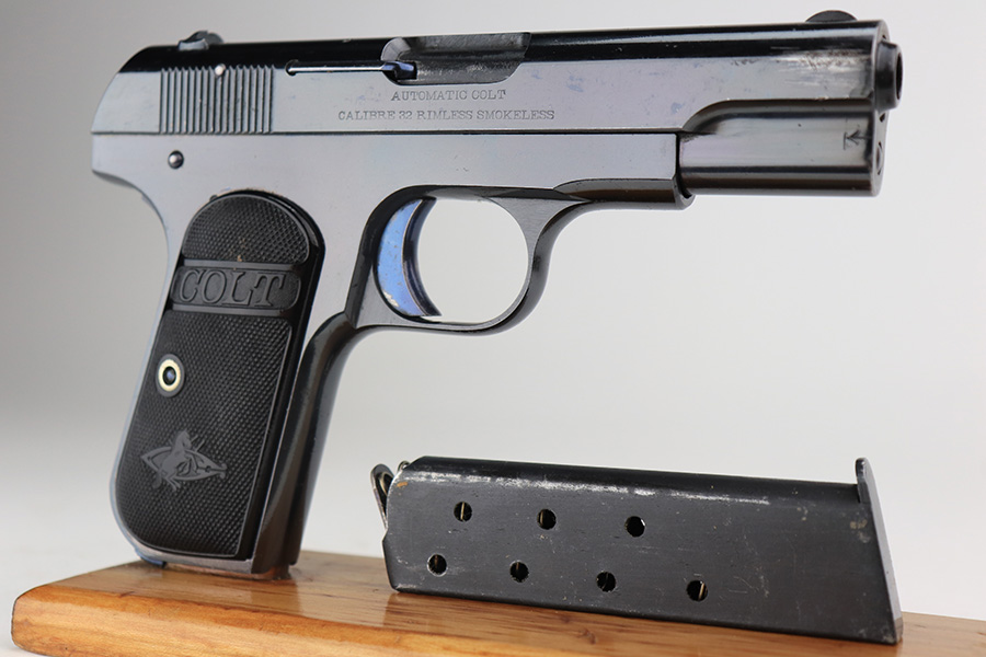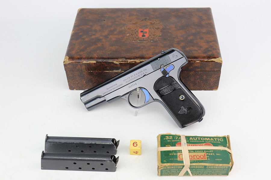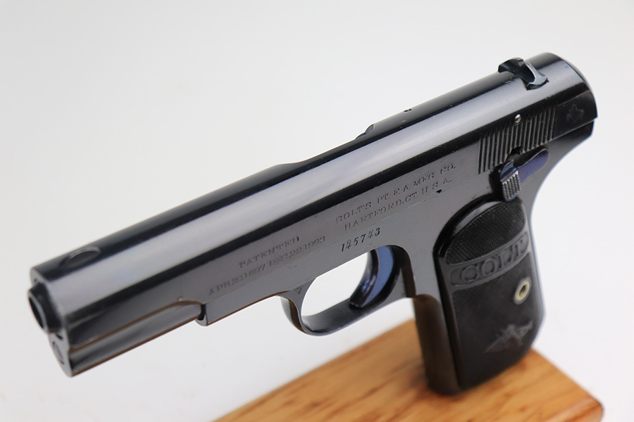 4/1/22 – This is a beautiful, fairly early Colt M1903 from 1913. It has about 96% of the original blue remaining, with nearly all of the wear on either side of the slide toward the muzzle. The right side does have some surface scratches in this area. Excellent fire blue on the safety, extractor and trigger. Excellent Colt hard rubber grips with no chips or cracks. Listing includes a total of two unmarked magazines. Also included is a box of vintage ammo and a display case of some sort.