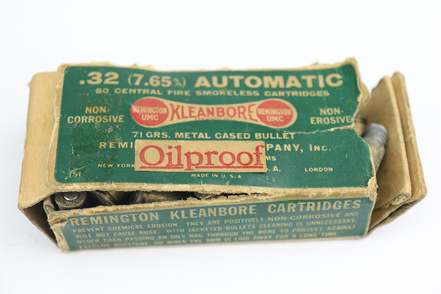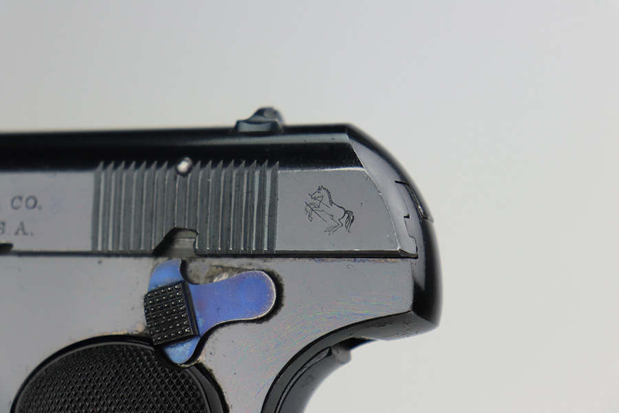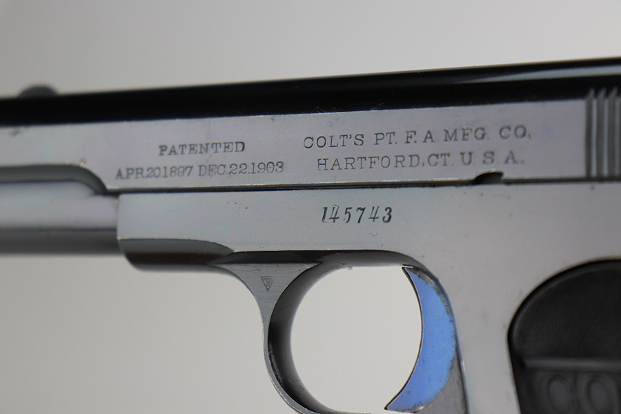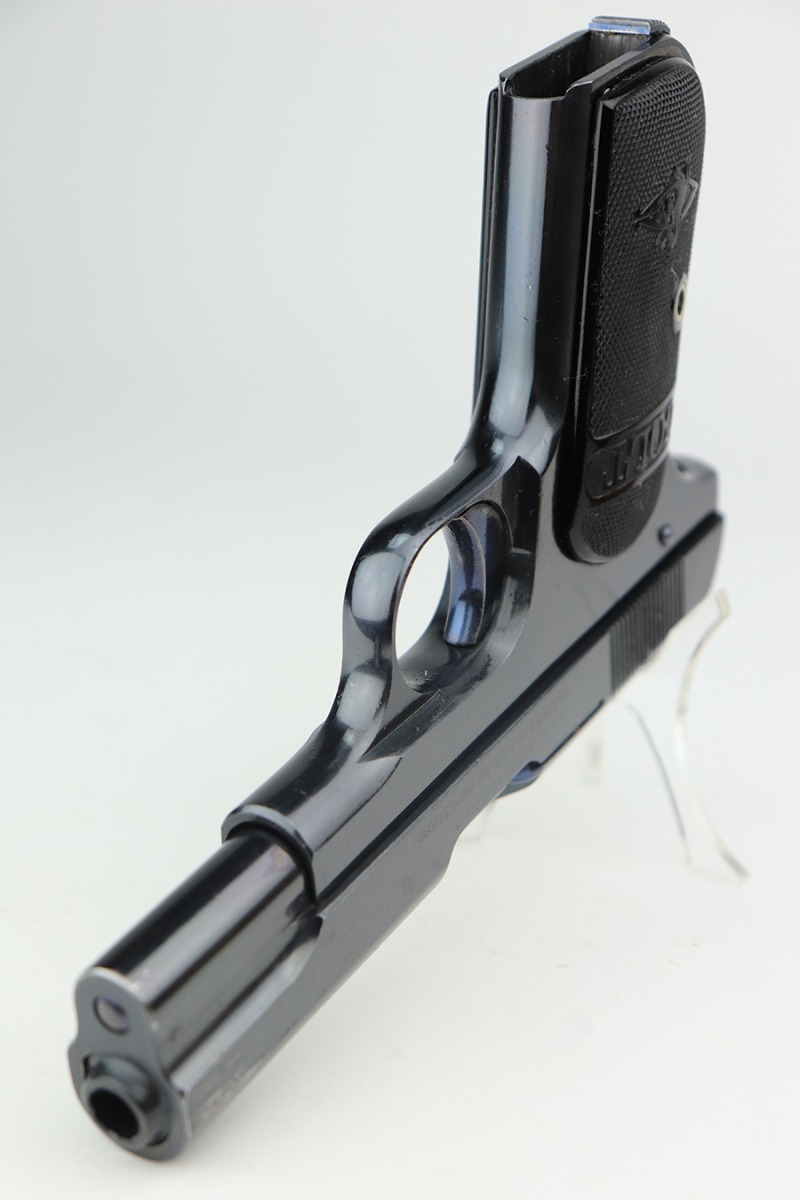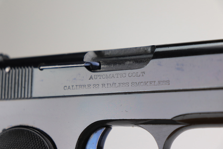 4/1/22 – This is a beautiful, fairly early Colt M1903 from 1913. It has about 96% of the original blue remaining, with nearly all of the wear on either side of the slide toward the muzzle. The right side does have some surface scratches in this area. Excellent fire blue on the safety, extractor and trigger. Excellent Colt hard rubber grips with no chips or cracks. Listing includes a total of two unmarked magazines. Also included is a box of vintage ammo and a display case of some sort.