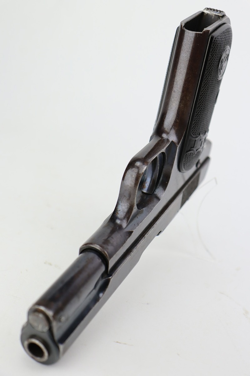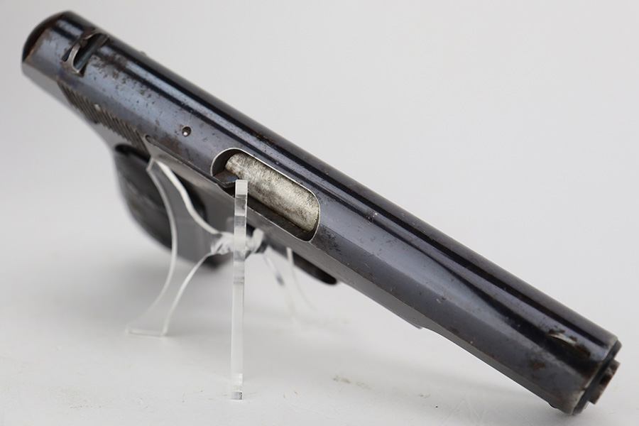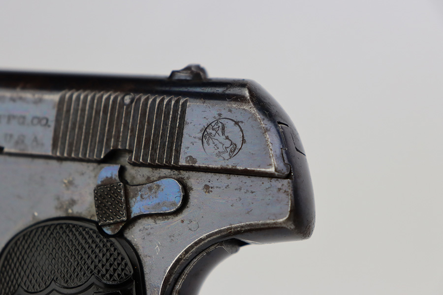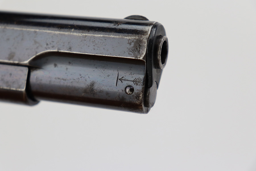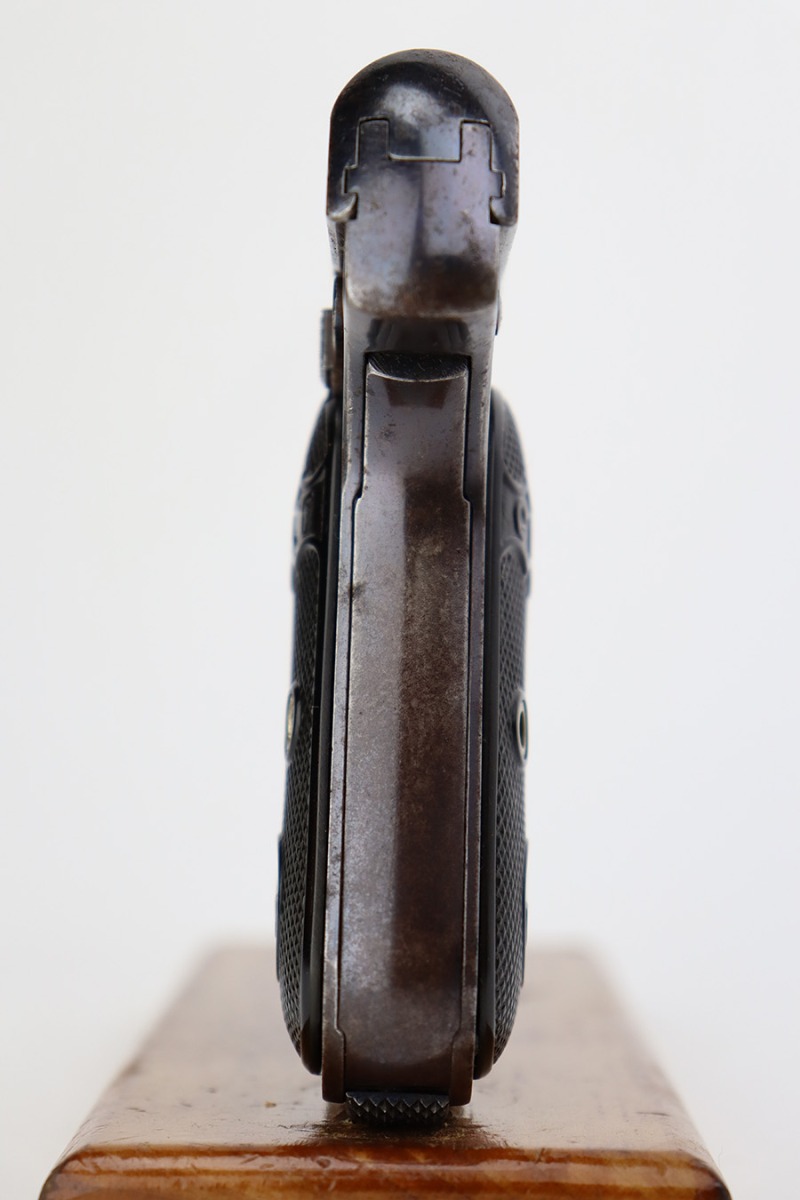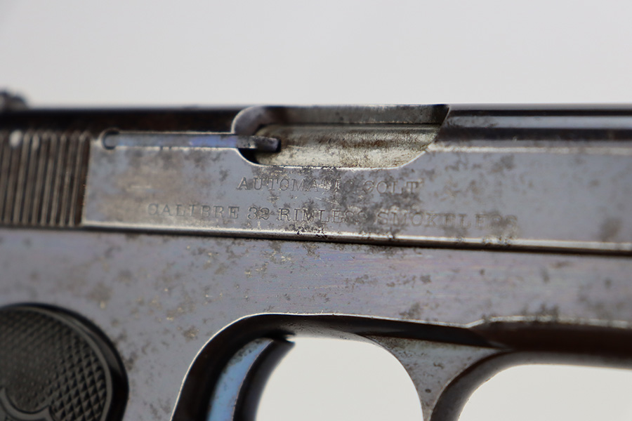 7/28/23 – This is a nice example of an early Colt Model 1903 Pocket Hammerless pistol, manufactured in 1907 and chambered in .32 ACP. It is all matching and has retained roughly 75% of its original high polish finish. The majority of the wear is on the grip straps and concentrated around the high edges in general, but there is also spotty wear throughout. While there isn’t a ton of actual bluing loss, there is obvious spotty oxidation covering the whole gun. Fitted with period-correct black hard rubber grips. Comes with one proper magazine. The bore has decent rifling, but there is noticeable pitting in the grooves.