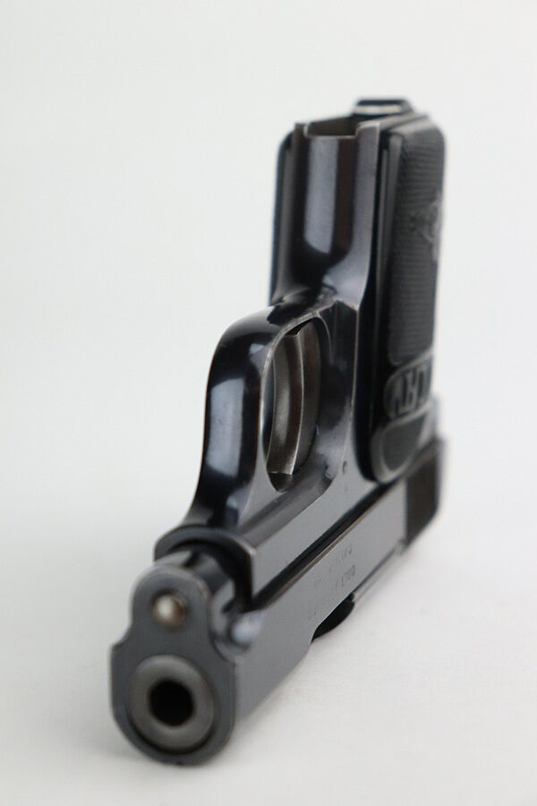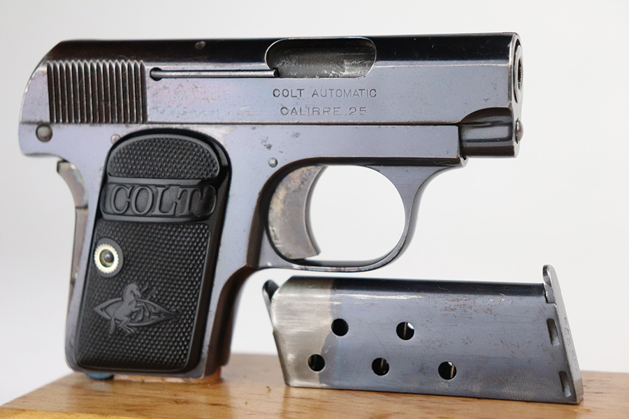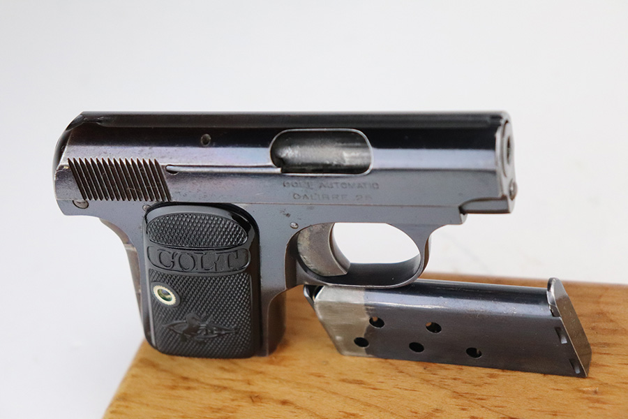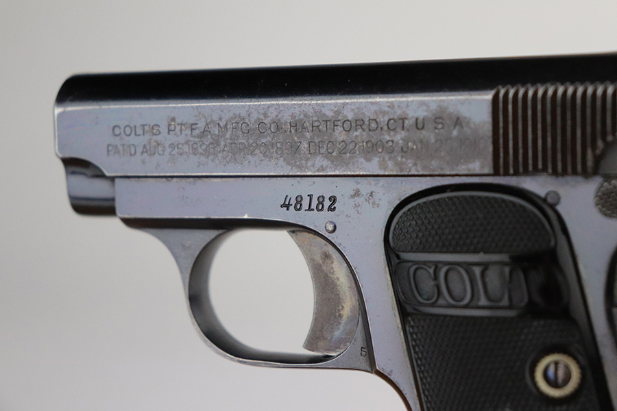 7/19/21 – This is an excellent example of an early Colt Model 1908 Vest Pocket manufactured in 1911. The gun is all correct and has retained about 96-97% of its original finish. There is minor wear around the high edges of the slide and around the muzzle and minor thinning on the back strap. The entire left side of the slide has heavy spotty oxidation and freckling. Areas of freckling throughout and brown patina on the straps. Comes with excellent early grips and one proper magazine. The bore has decent rifling with minor pitting in the grooves.