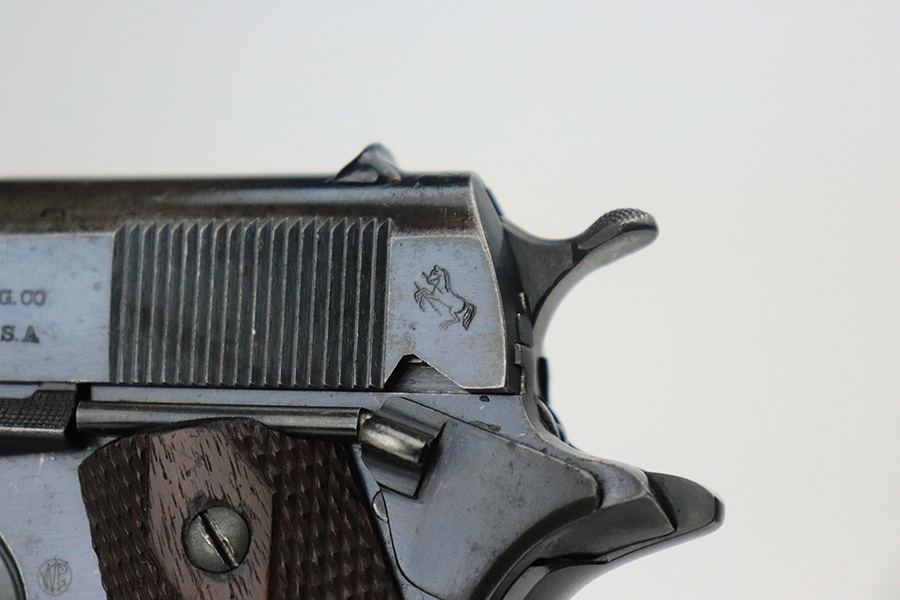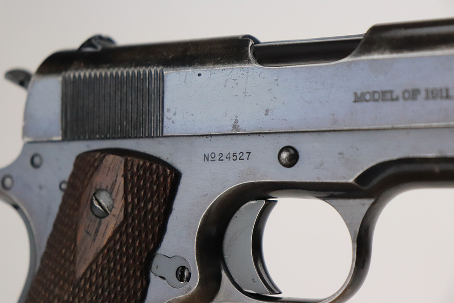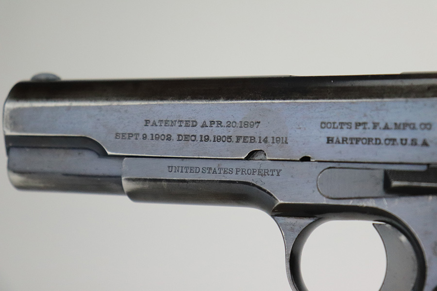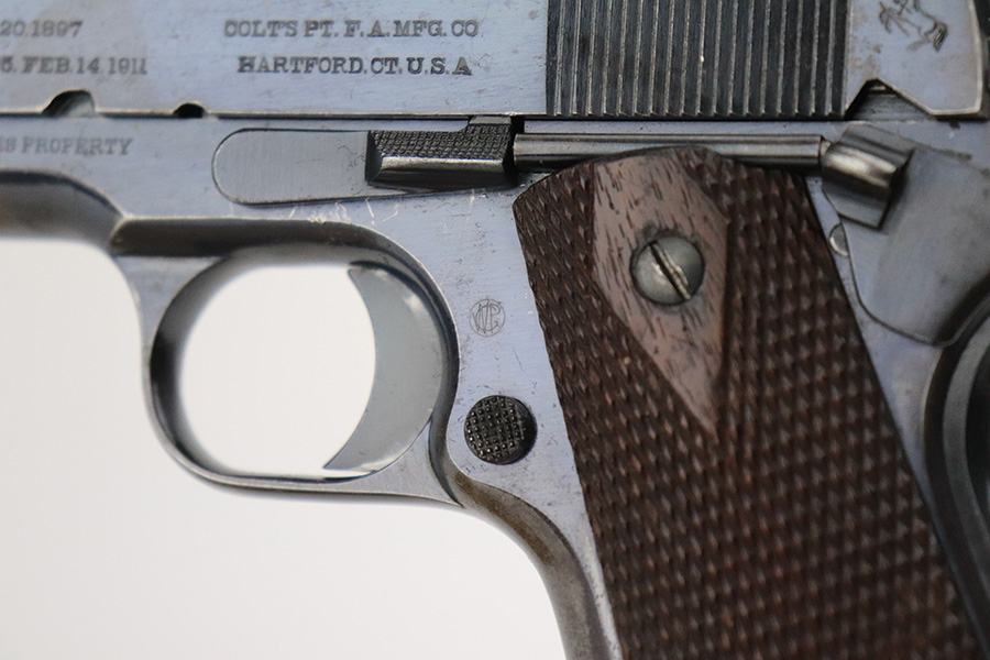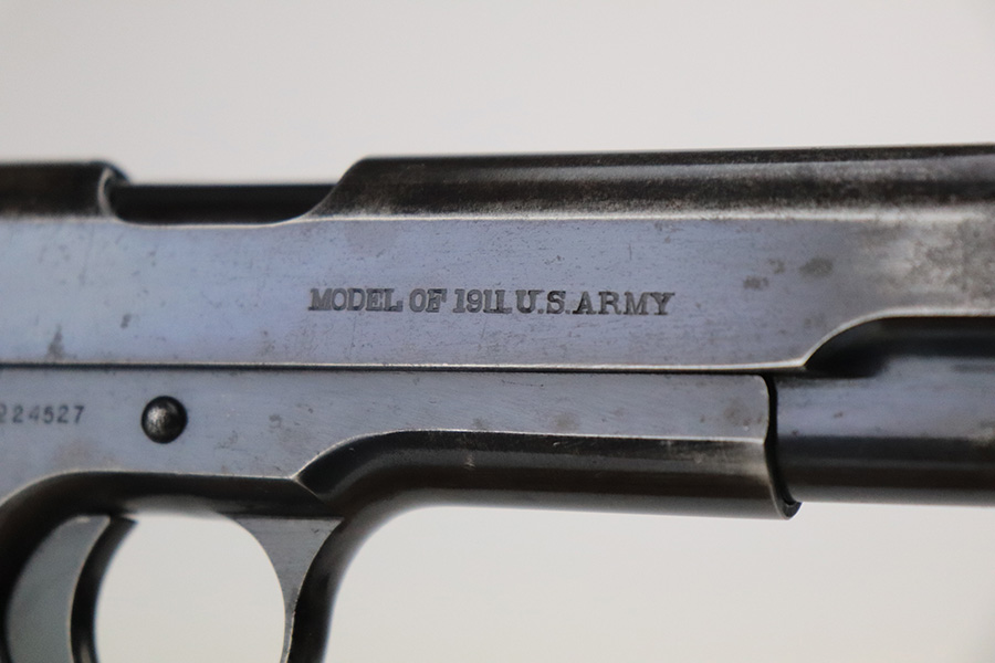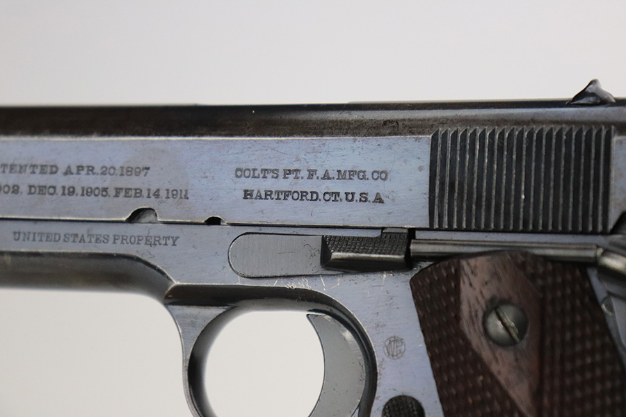 6/13/22 – This is a fairly scarce and early military Colt 1911 that was issued to the U.S. military in early 1913. The original blue rates at about 50-60% with notable bluing loss on the straps, all along the top of the slide, and more on either side of the muzzle. Correct early slide with 1911 patent date. Both frame and slide have a couple of minor dings on them. Right side frame has three initials lightly scratched in above the trigger guard. Rare, early barrel with horizontal ‘H’ on the hood. Excellent bore with strong rifling. It does appear the recoil link is replaced. The grips have some scratches and handling wear but no cracks. Early two-tone mag with lanyard ring.