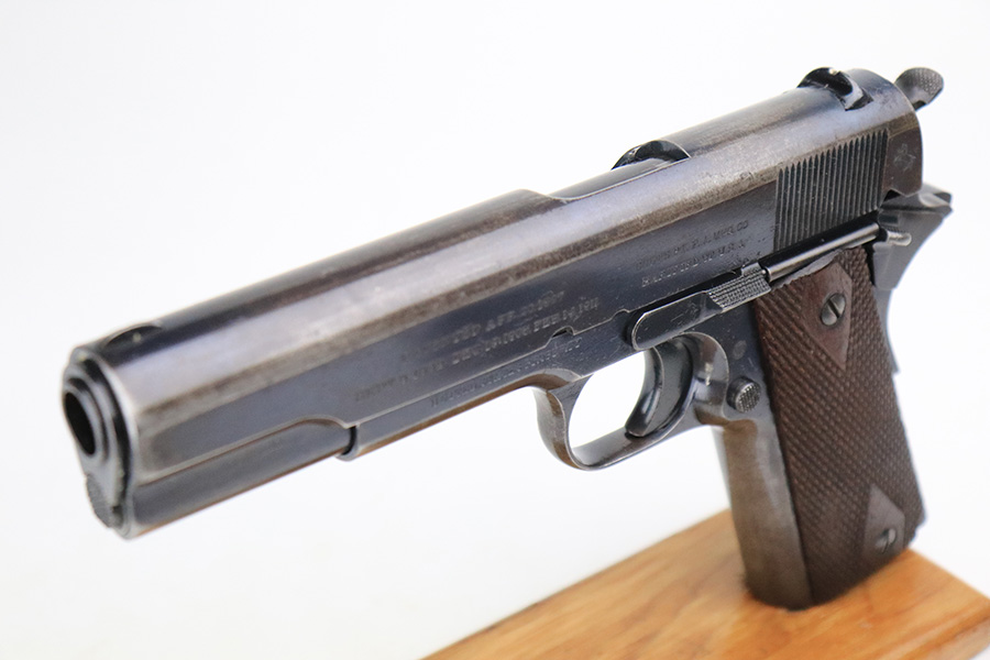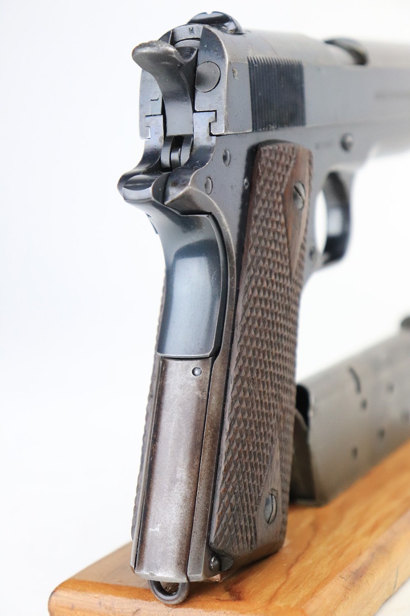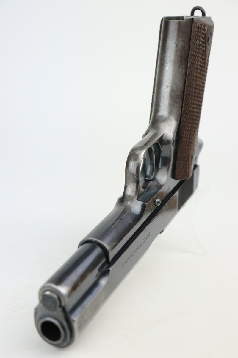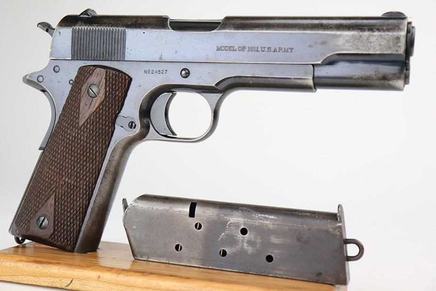 6/13/22 – This is a fairly scarce and early military Colt 1911 that was issued to the U.S. military in early 1913. The original blue rates at about 50-60% with notable bluing loss on the straps, all along the top of the slide, and more on either side of the muzzle. Correct early slide with 1911 patent date. Both frame and slide have a couple of minor dings on them. Right side frame has three initials lightly scratched in above the trigger guard. Rare, early barrel with horizontal ‘H’ on the hood. Excellent bore with strong rifling. It does appear the recoil link is replaced. The grips have some scratches and handling wear but no cracks. Early two-tone mag with lanyard ring.