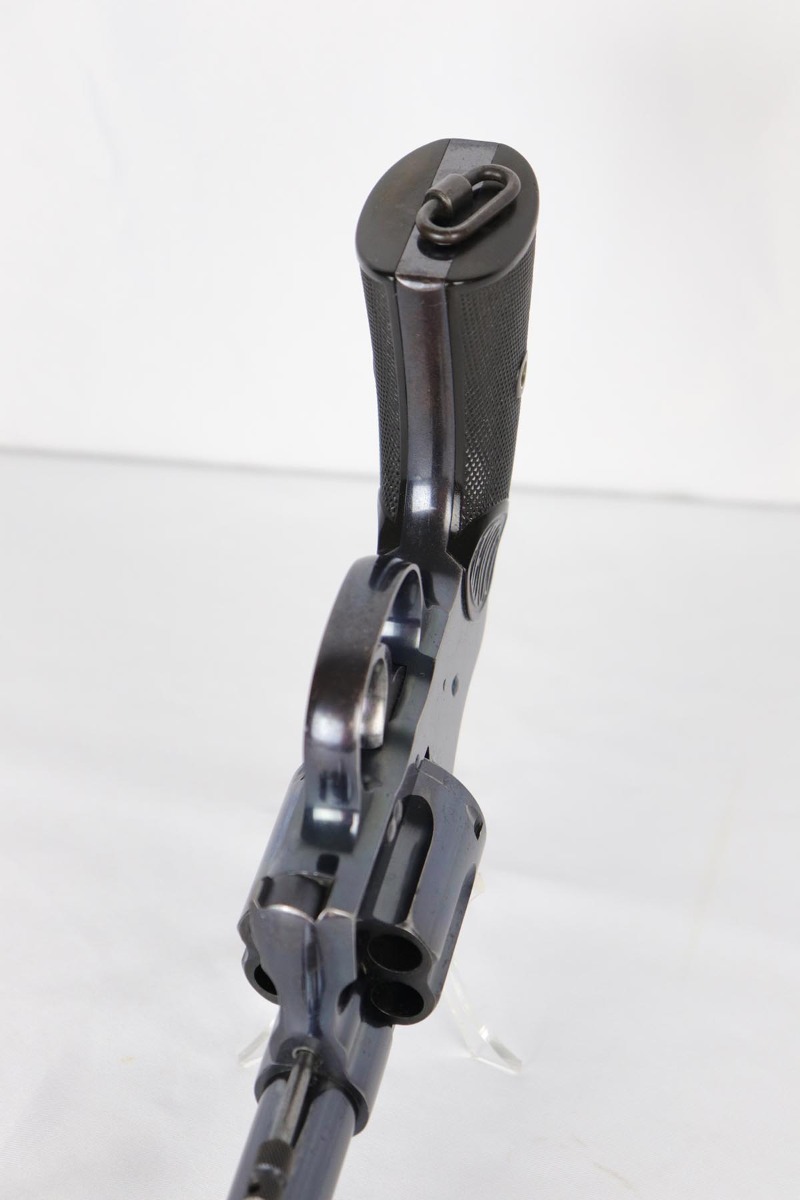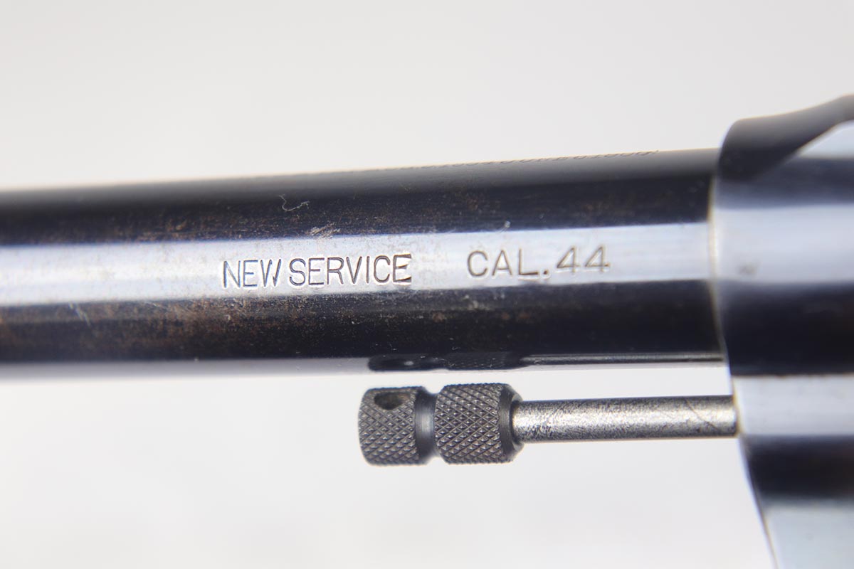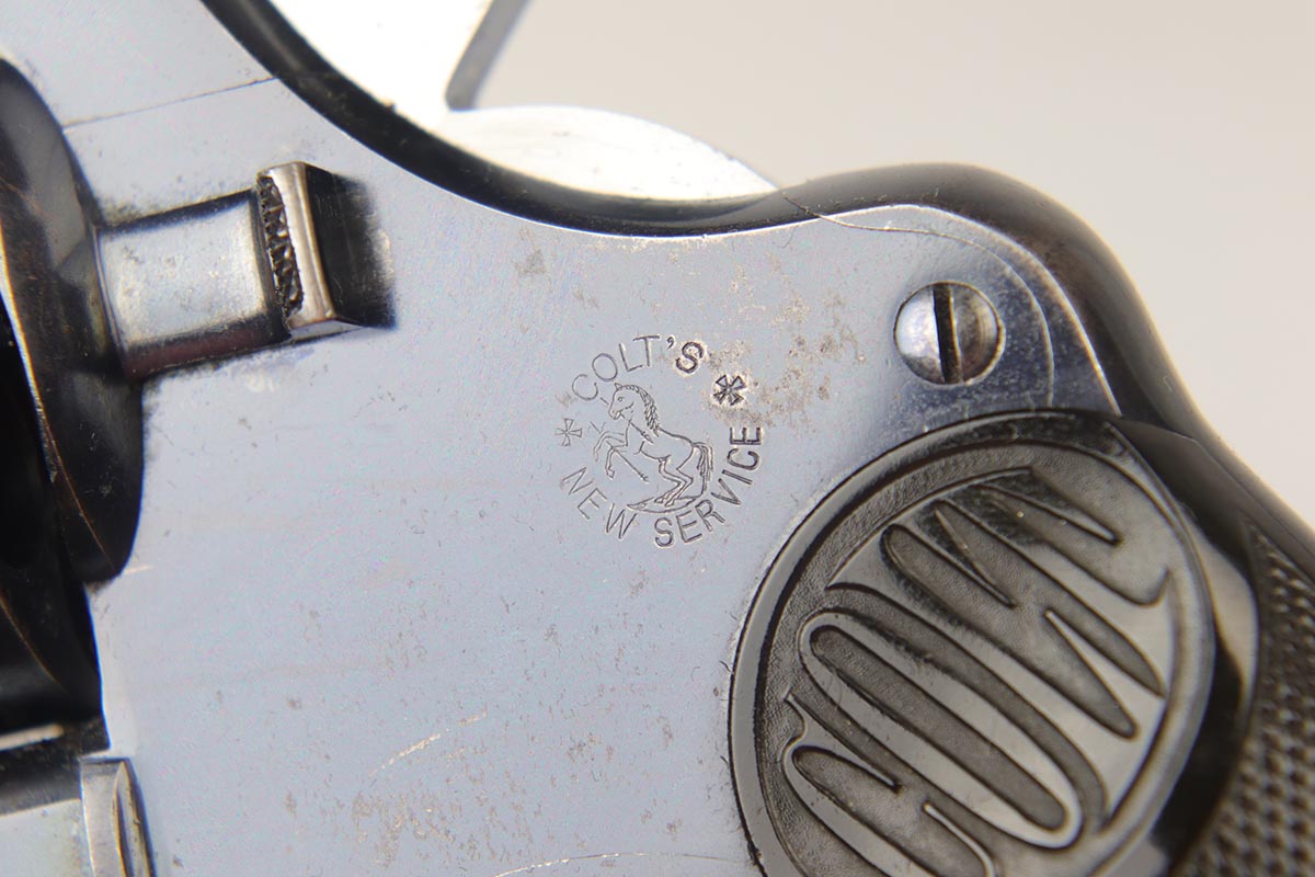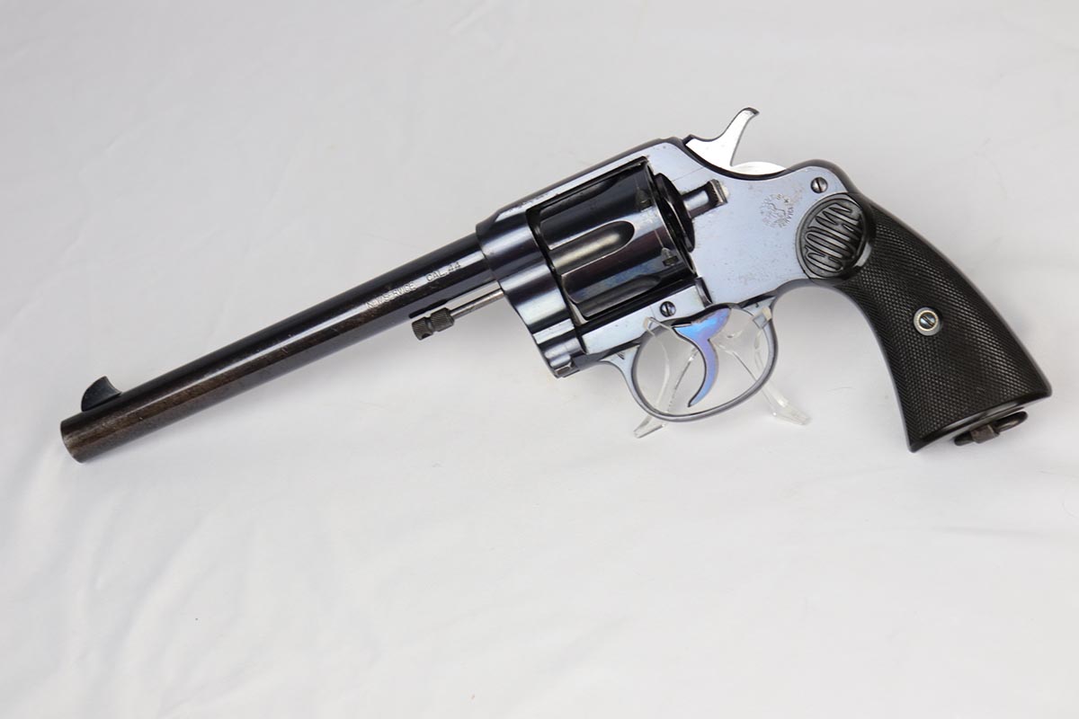 8/6/18 – This is a nice example of an early Colt New Service revolver, manufactured in 1907 and chambered .44-40. The revolver retains 90+% original high-polish blue, with the majority of the thinning along the barrel. Excellent timing and action. Early Colt logo with New Service proof is visible on left side frame. Original grips are in fantastic condition. Bore shows minor use but is shiny and very nice overall.