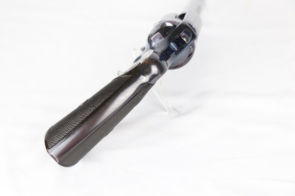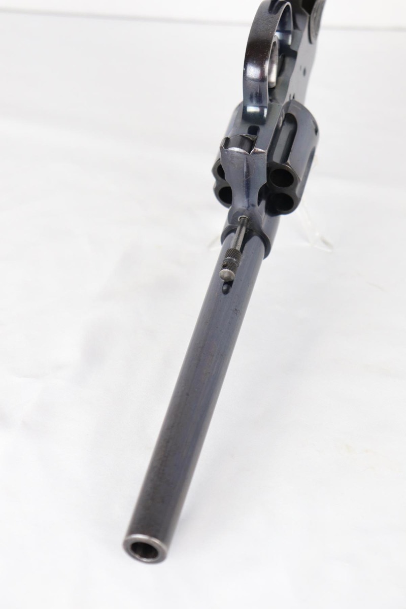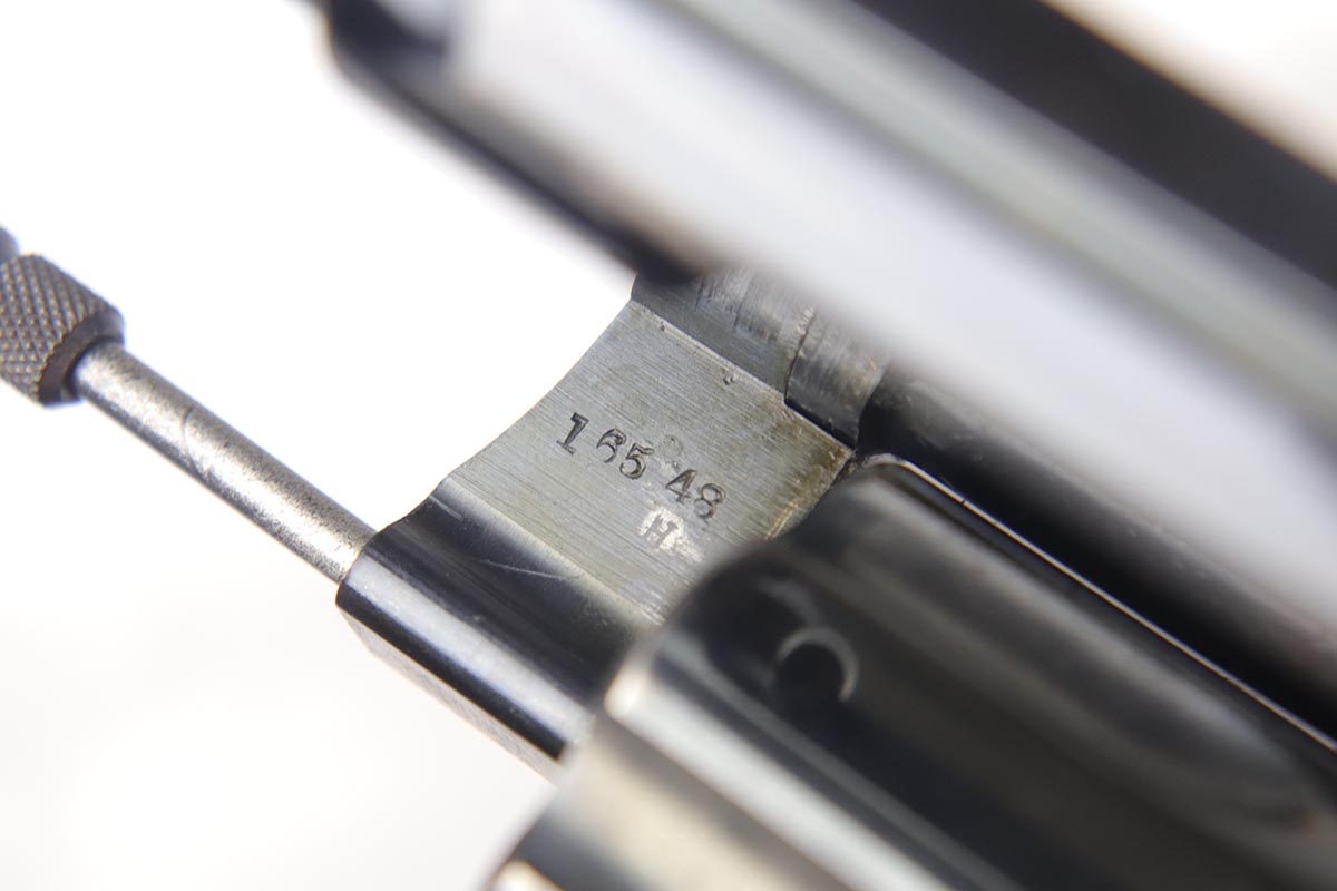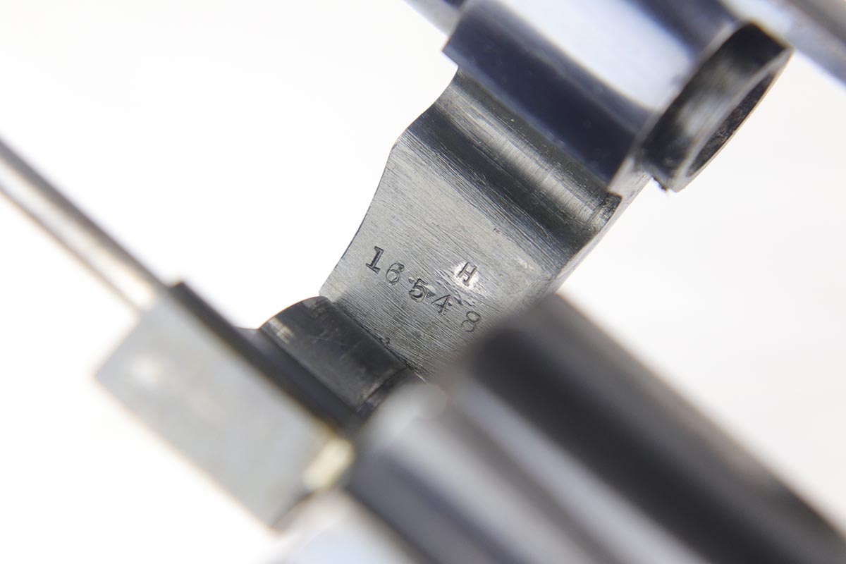 8/6/18 – This is a nice example of an early Colt New Service revolver, manufactured in 1907 and chambered .44-40. The revolver retains 90+% original high-polish blue, with the majority of the thinning along the barrel. Excellent timing and action. Early Colt logo with New Service proof is visible on left side frame. Original grips are in fantastic condition. Bore shows minor use but is shiny and very nice overall.