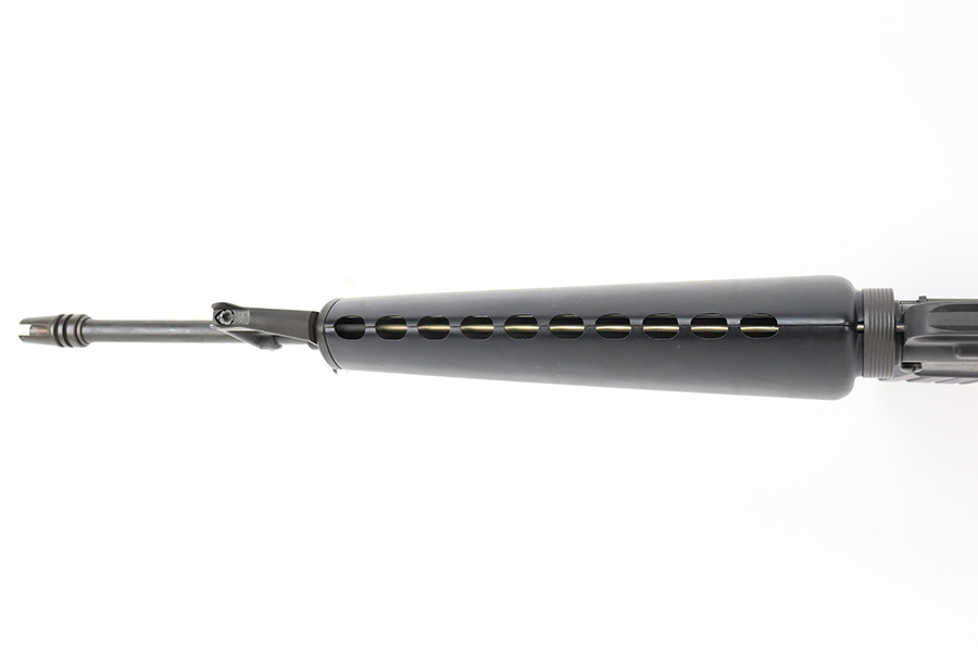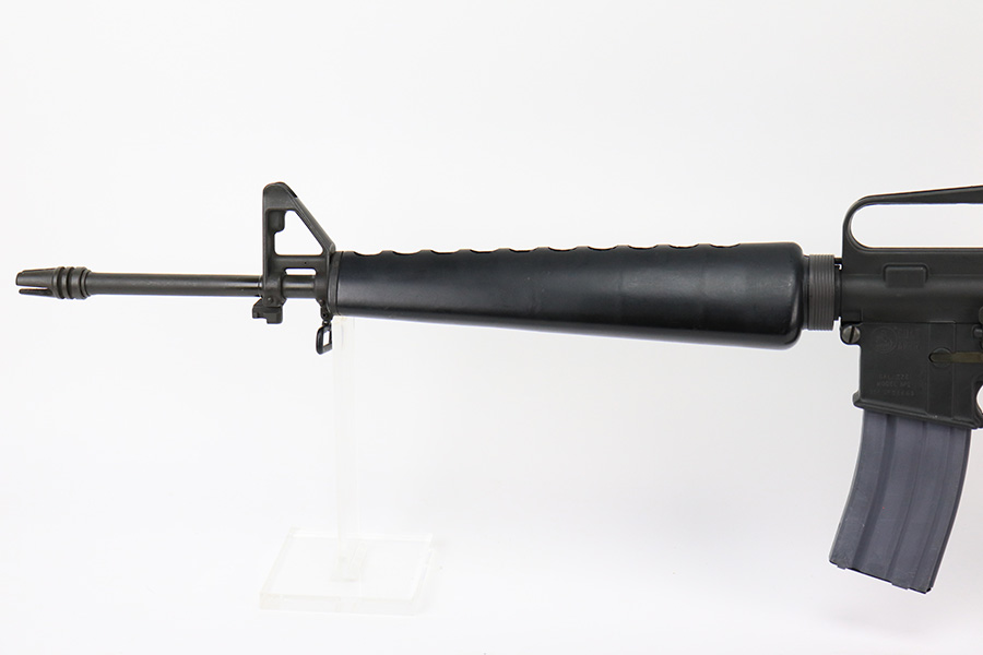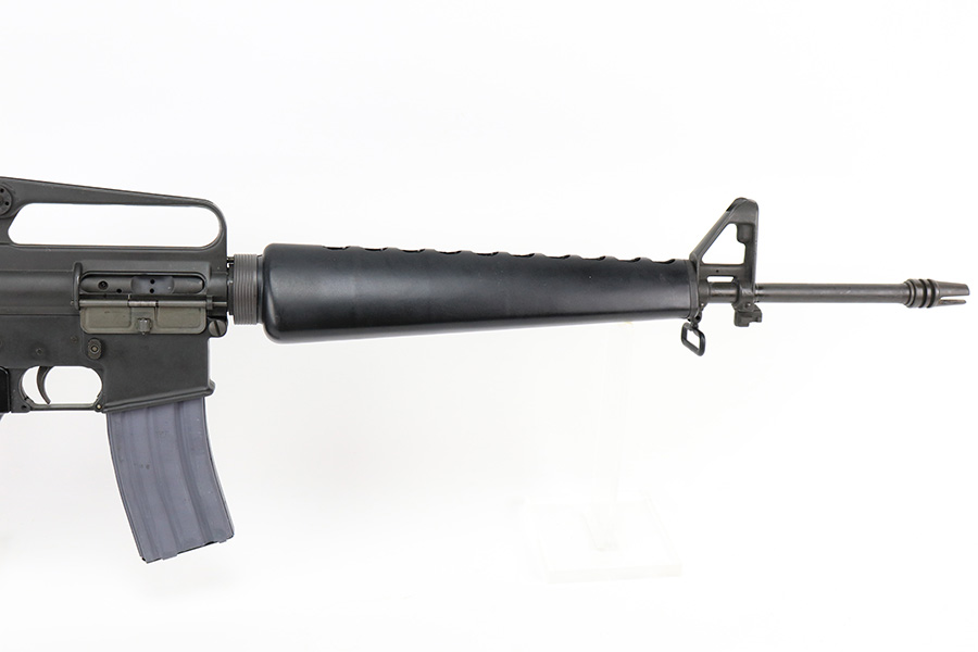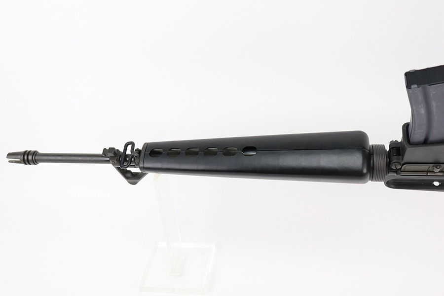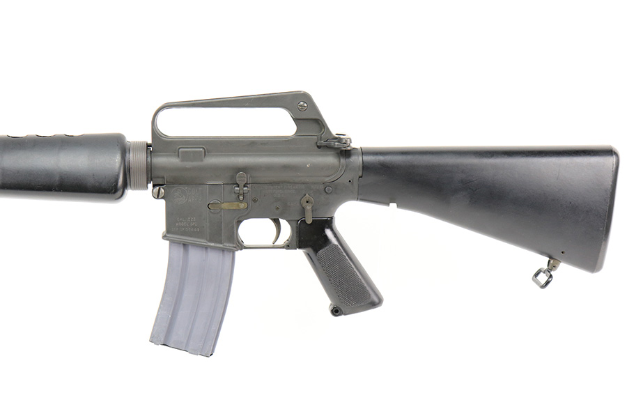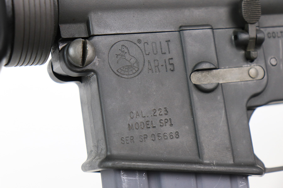 4/21/22 – This is a fantastic example of a very early and desirable Colt SP1 that predates the Vietnam War. Dates to either one of the last made in 1965, or first in 1966. All original with 98-99% finish remaining, just very minor surface scuffing. Barrel is ‘M’ marked, and the early barrel is marked ’12’ on underside, indicating it has the 1×12 inch twist. Three prong flash hider is present, as is bayonet lug. Early triangular handguards and early style buttstock, with no provisions for internal storage. Minty bore and C&R eligible.
