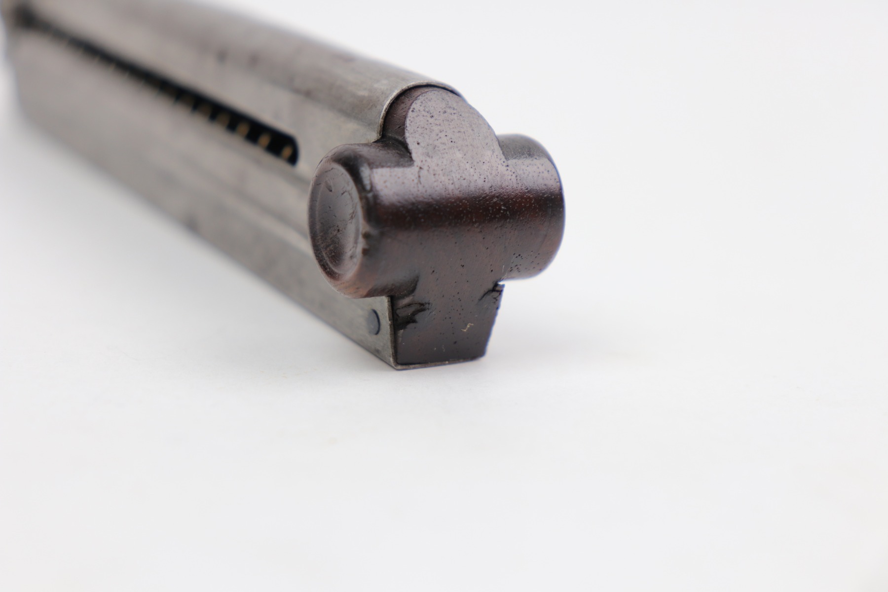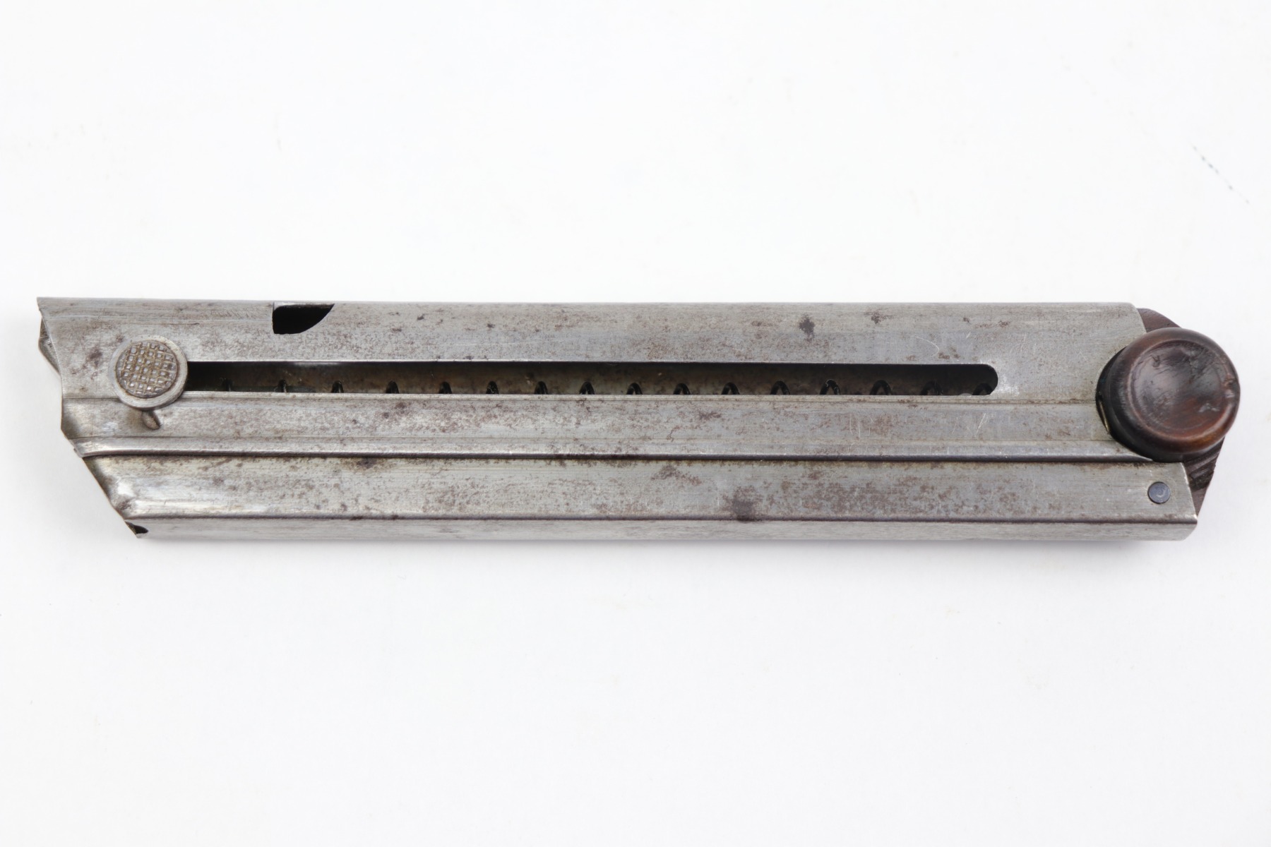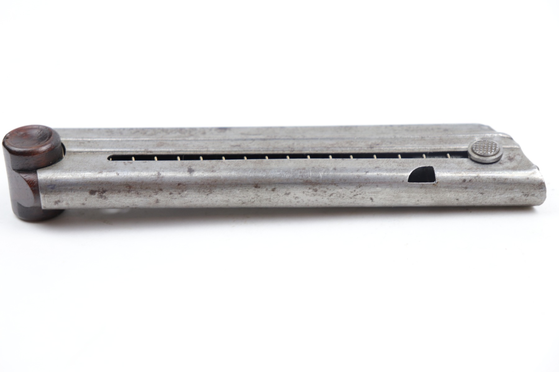 12/23/20 – This is an original WW1 era / pre WW1 commercial Luger magazine. Fairly scarce and desirable. The base is unmarked nor shows signs of ever having been stamped. There are however two small chips in the lower portion of the base. This doesn’t affect the structural integrity of the base and is a minor flaw. The tube has oxidation throughout but no major rust or pitting. Strong, functional spring.