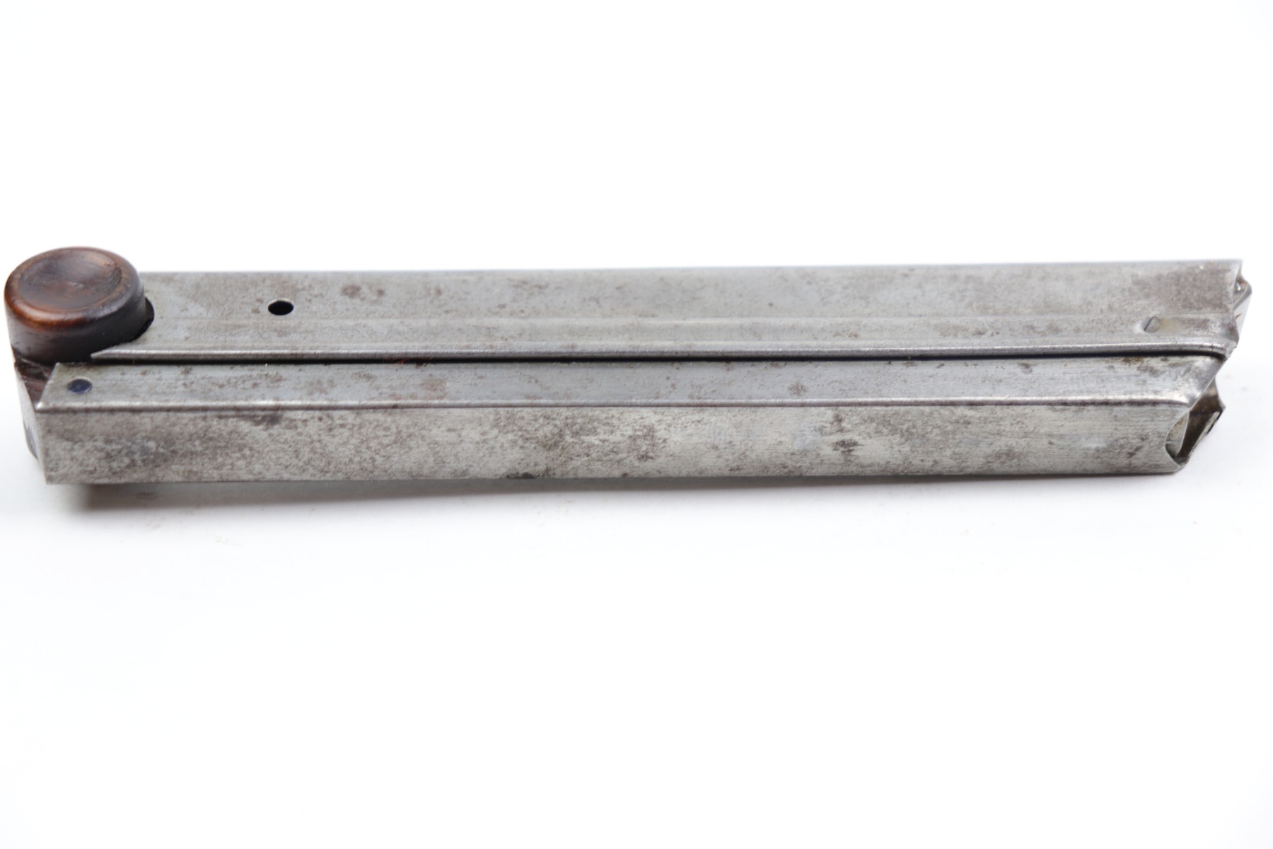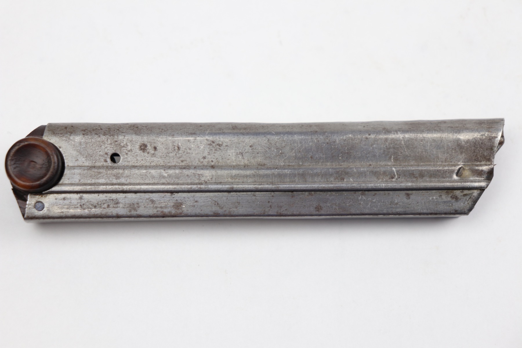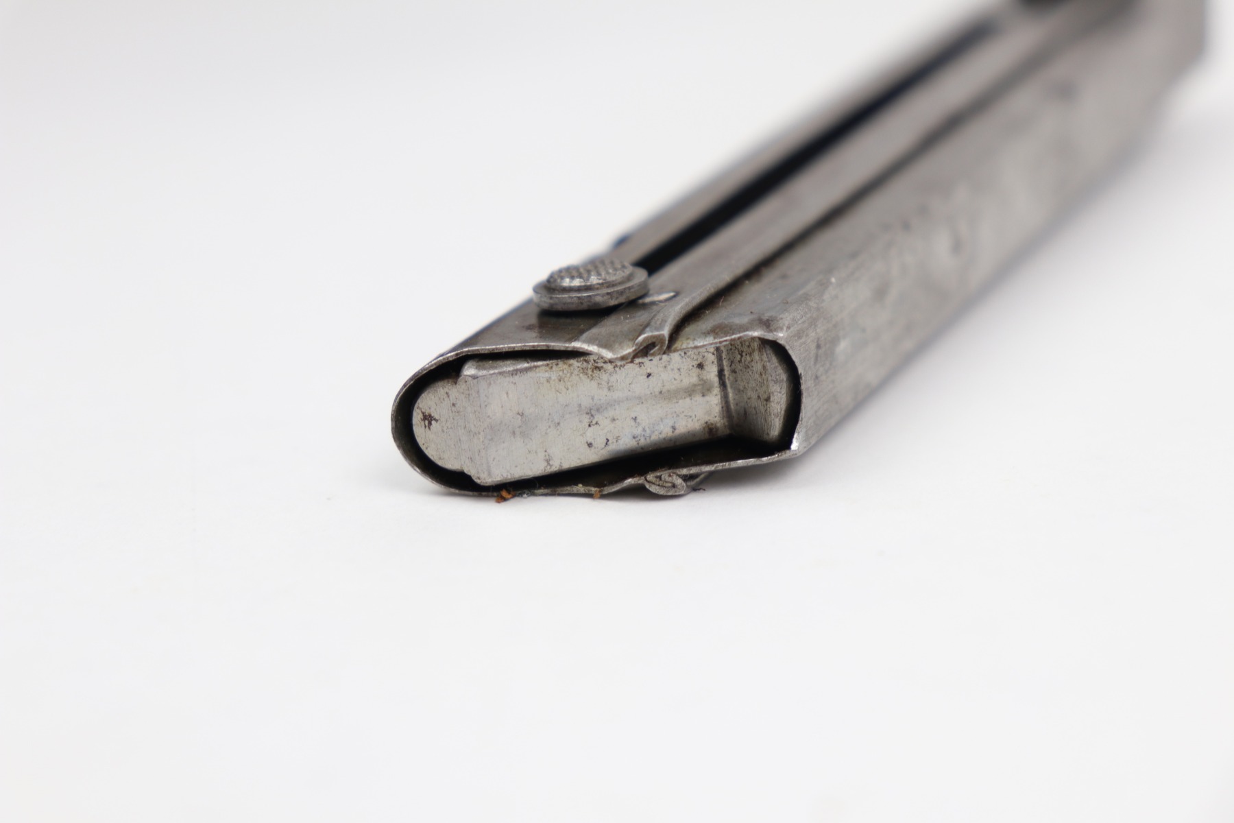 12/23/20 – This is an original WW1 era / pre WW1 commercial Luger magazine. Fairly scarce and desirable. The base is unmarked nor shows signs of ever having been stamped. There are however two small chips in the lower portion of the base. This doesn’t affect the structural integrity of the base and is a minor flaw. The tube has oxidation throughout but no major rust or pitting. Strong, functional spring.