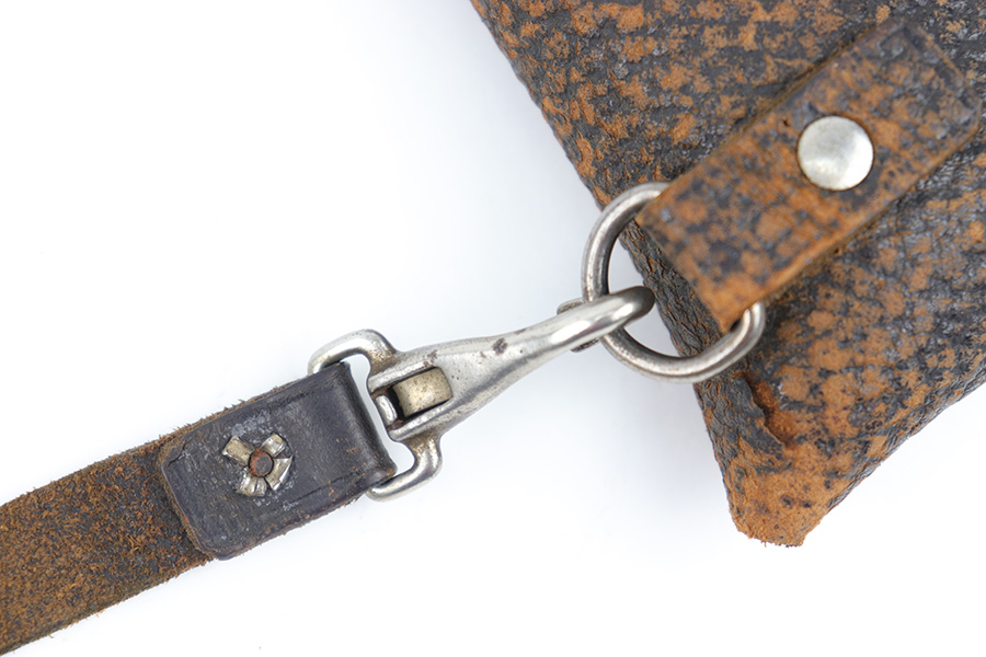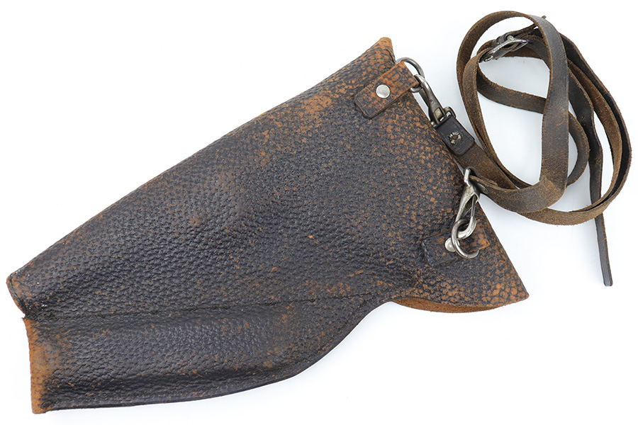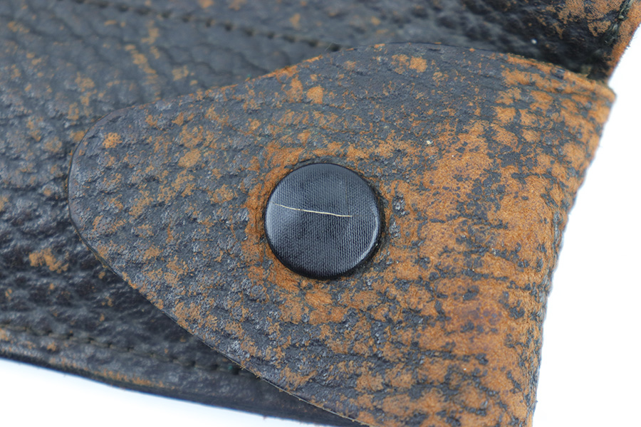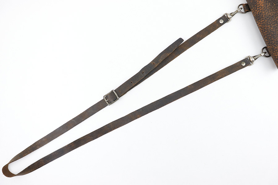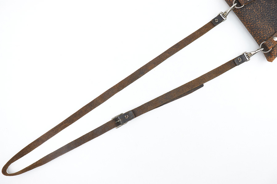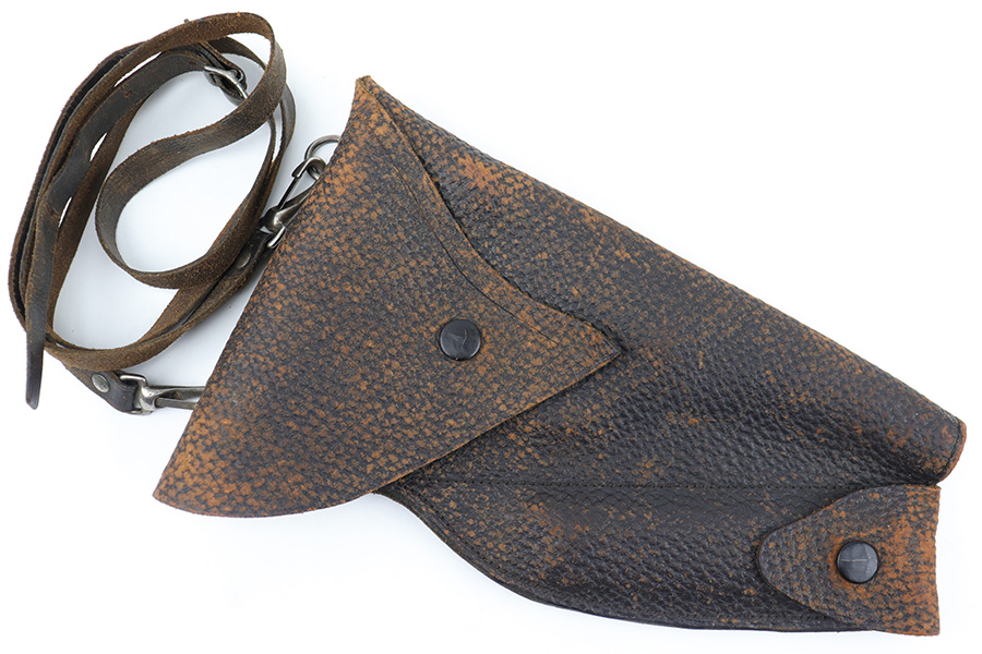 3/23/23 – This is a rare, early commercial Luger holster from pre-WW1. Would pair nicely with an American Eagle or similar commercially produced DWM Luger pistol. The holster has no markings or stamps, and features a unique design with a separate magazine pouch underneath the main pistol pouch. The snaps and buttons are brass, and the rear shoulder harness-loop rivets are aluminum. The leather is soft and pliable and features a textured exterior. Clean interior leather, and the exterior shows scuffing and natural aging without any excessive wear. The shoulder strap is still completely intact. No notable stitching flaws and all original stitching.