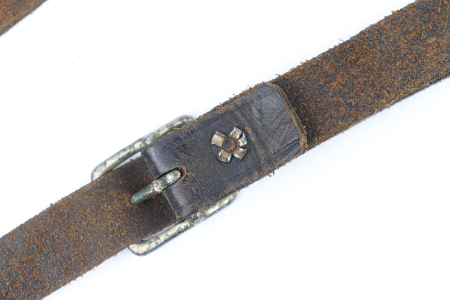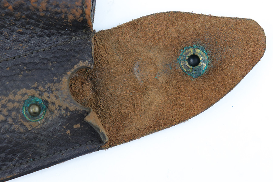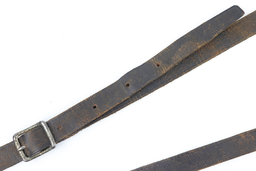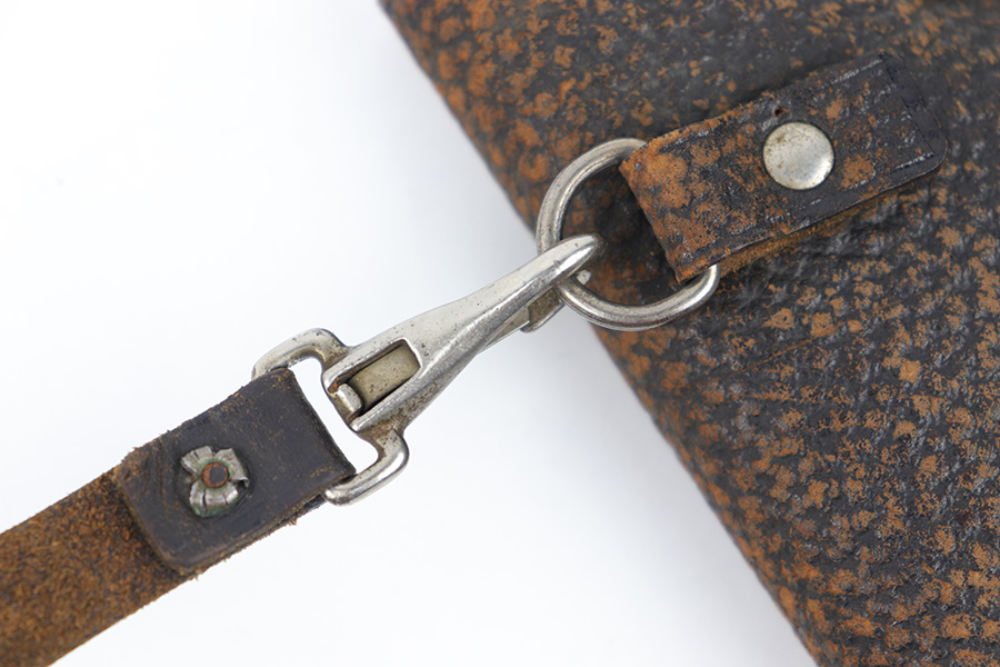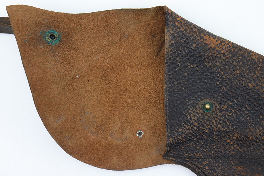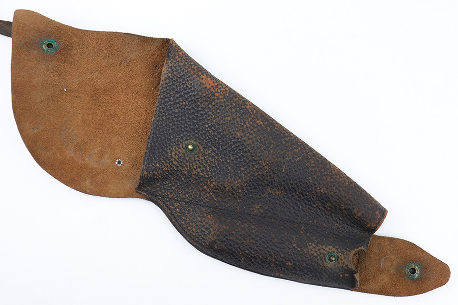 3/23/23 – This is a rare, early commercial Luger holster from pre-WW1. Would pair nicely with an American Eagle or similar commercially produced DWM Luger pistol. The holster has no markings or stamps, and features a unique design with a separate magazine pouch underneath the main pistol pouch. The snaps and buttons are brass, and the rear shoulder harness-loop rivets are aluminum. The leather is soft and pliable and features a textured exterior. Clean interior leather, and the exterior shows scuffing and natural aging without any excessive wear. The shoulder strap is still completely intact. No notable stitching flaws and all original stitching.
