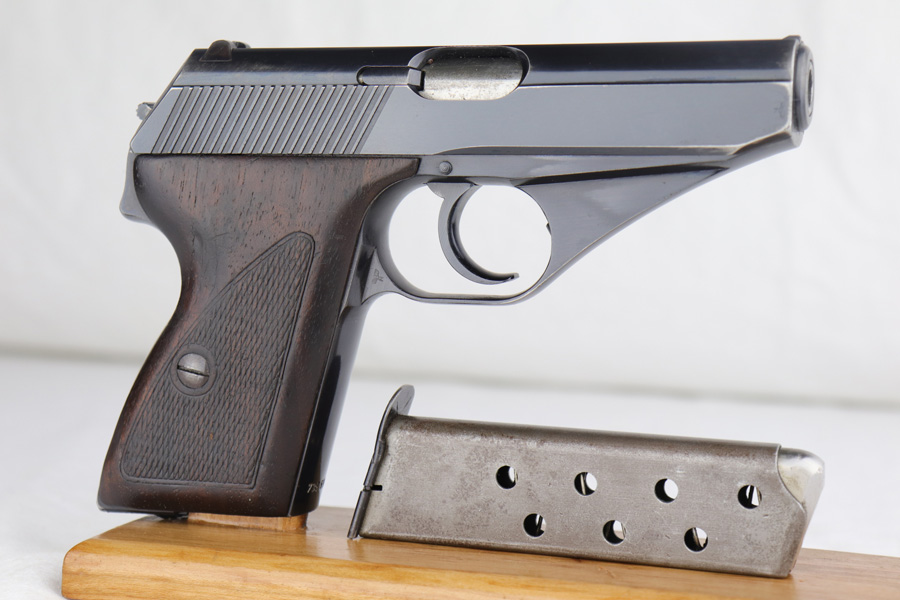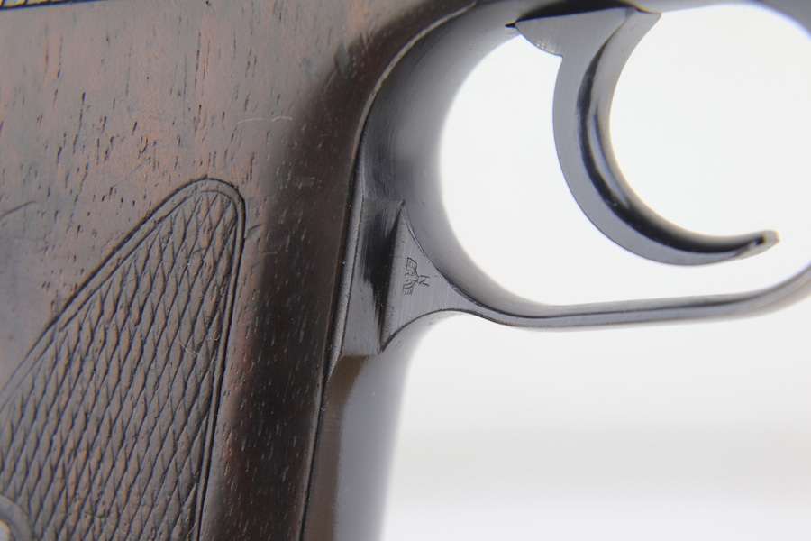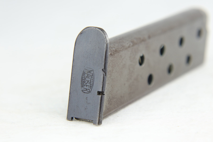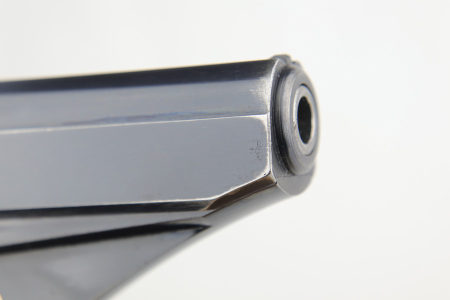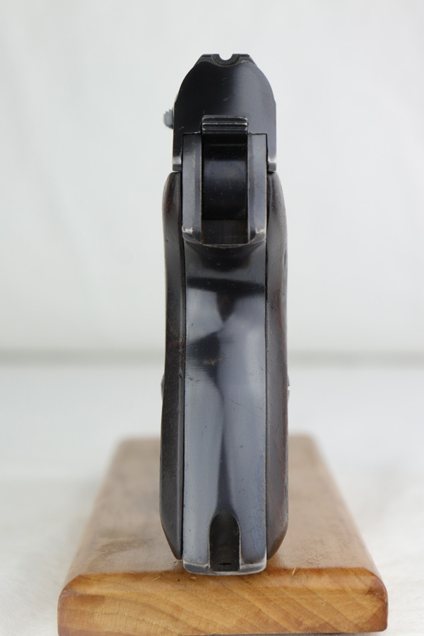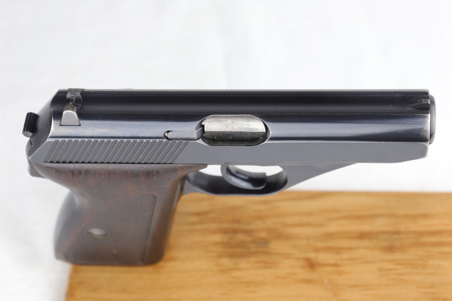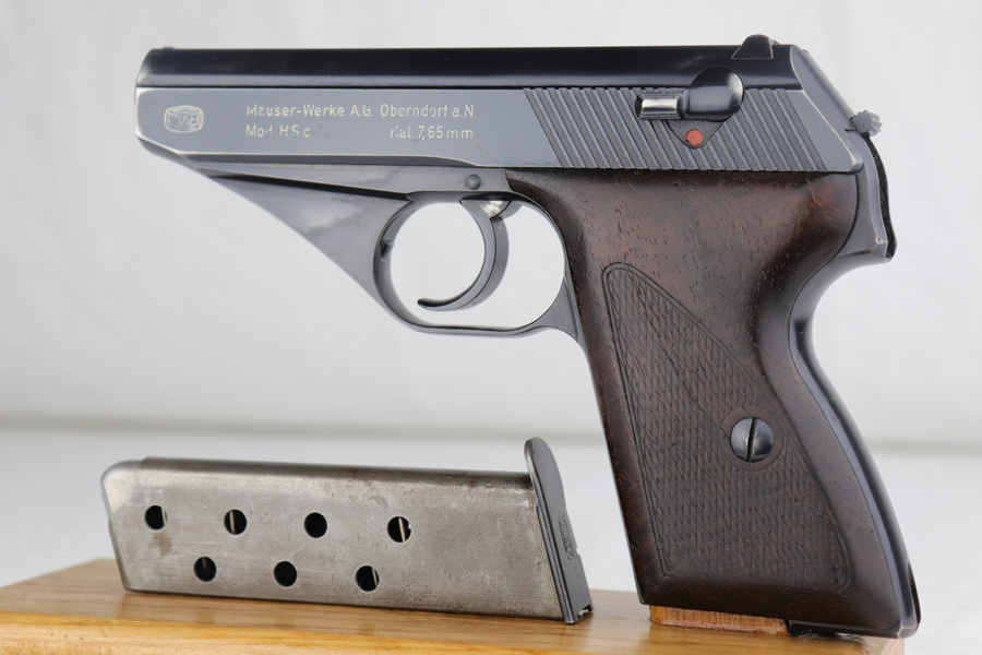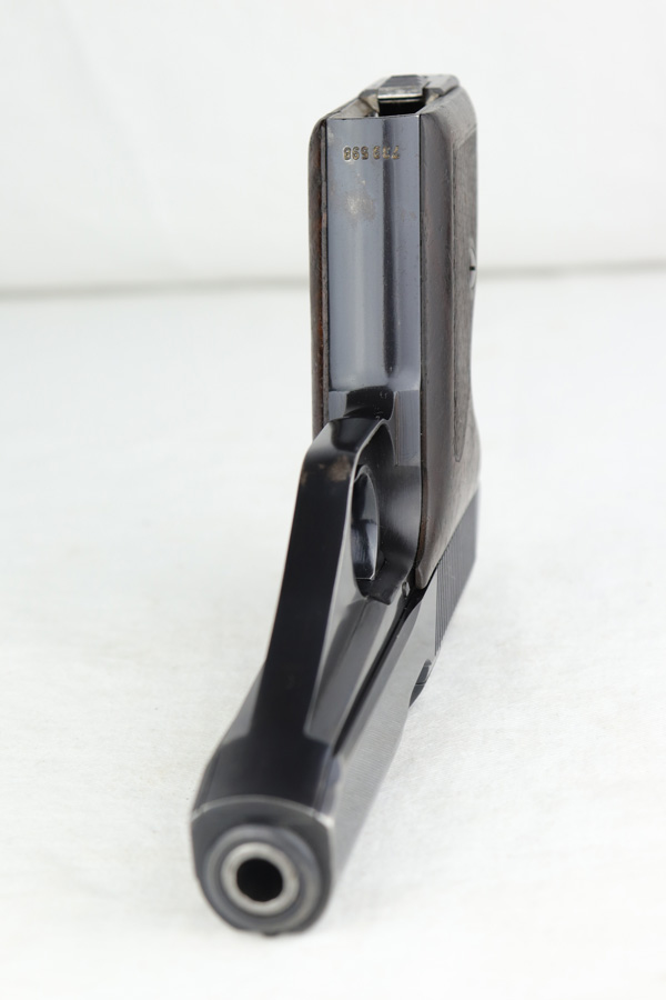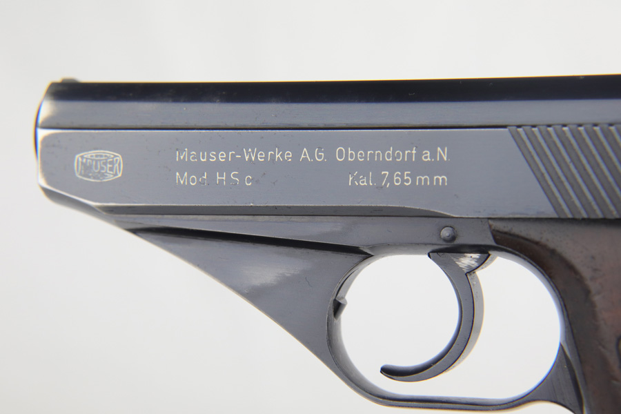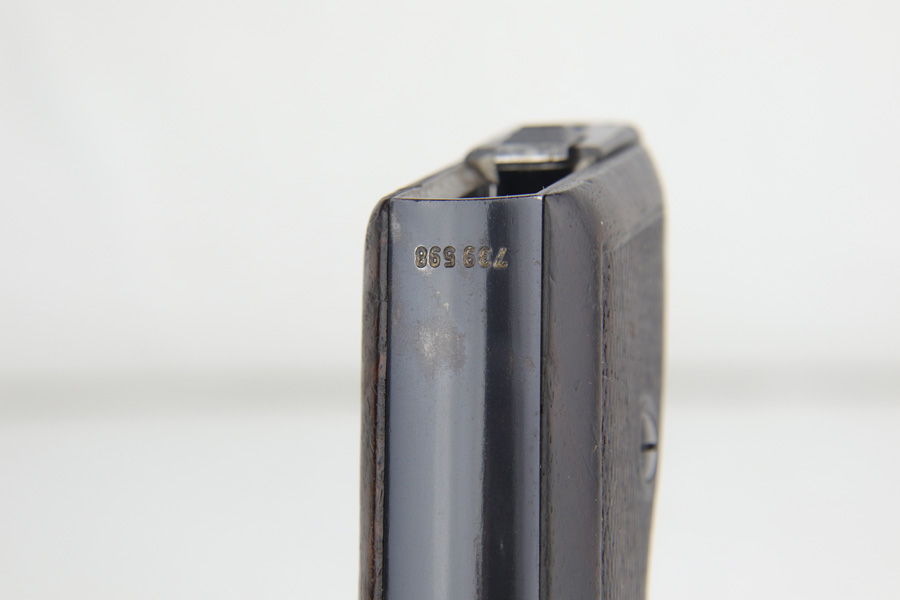 3/17/22 – This is an original high polish Mauser HSc pistol. Fairly early production, the serial number puts this gun at 1941 production. The condition is very nice with only a few small areas of bluing loss. Overall 96-97% with two small spots of bluing loss on the front strap, slide, and a small spot on the back strap. See photos. The dark wood grips are in great condition as well although the left panel does have a small chip near the trigger (most common area almost on all of these hsc’s). Comes with an original early Mauser banner magazine. The bore is very nice and clean as well: 9/10. Guaranteed original.
