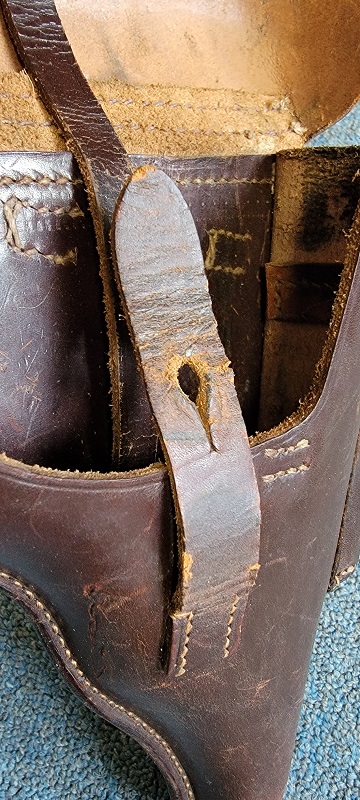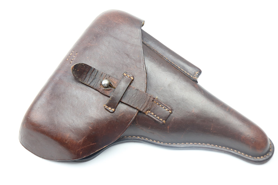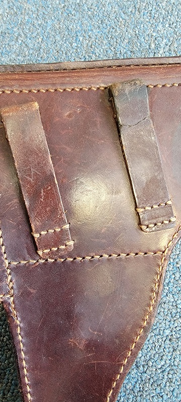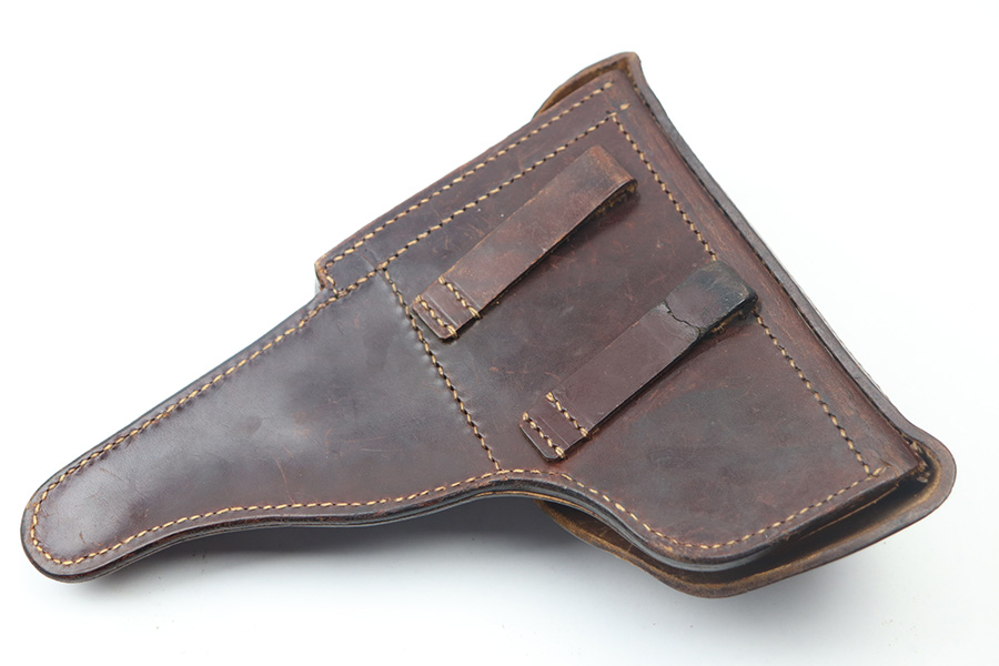 6/8/23 – This is an excellent example of a rare and early hard shell style P.38 holster. The holster has no markings or stamps, which most likely means this was made for commercial use. The reddish-brown leather also indicates early production as almost all wartime production and military production holsters were black leather. Overall the leather is excellent with very minor scuffs here and there. Stitching is intact and all original. Light surface cracking in the closure strap and a crack on the right belt loop on the back. Clean interior leather.