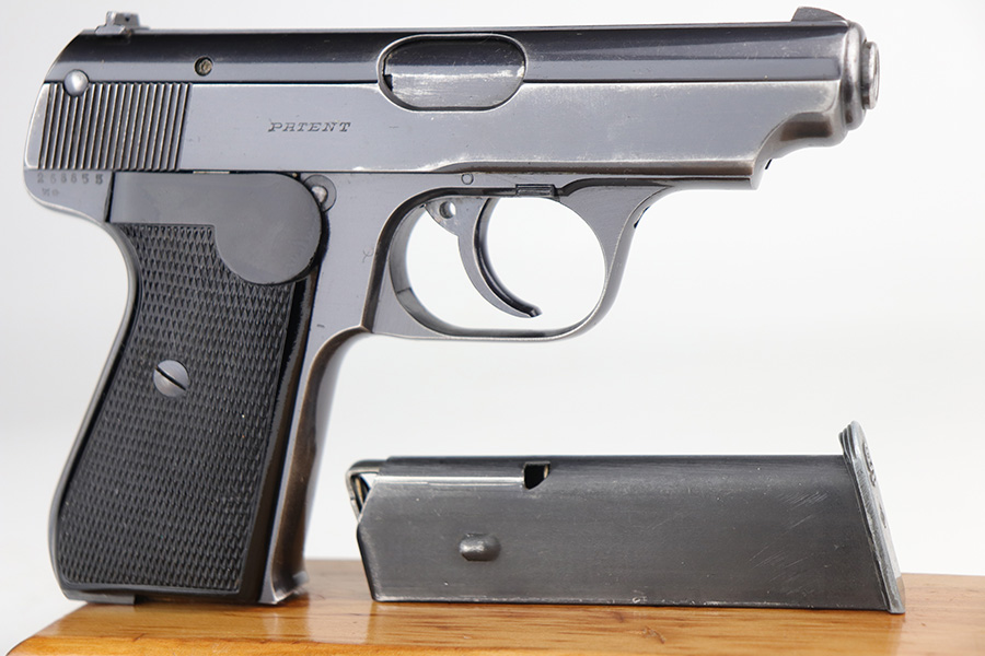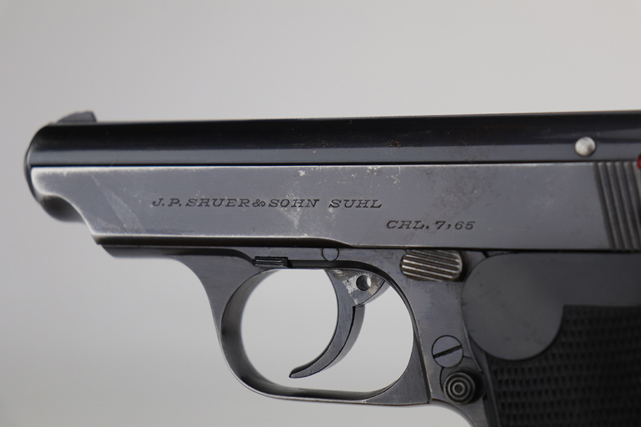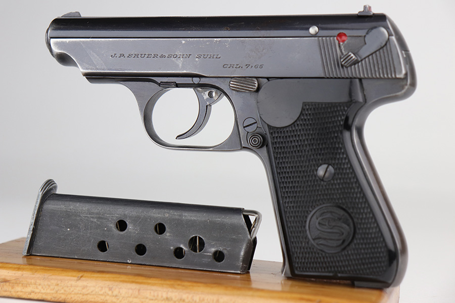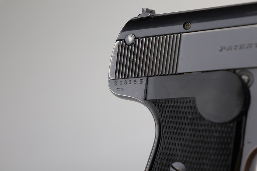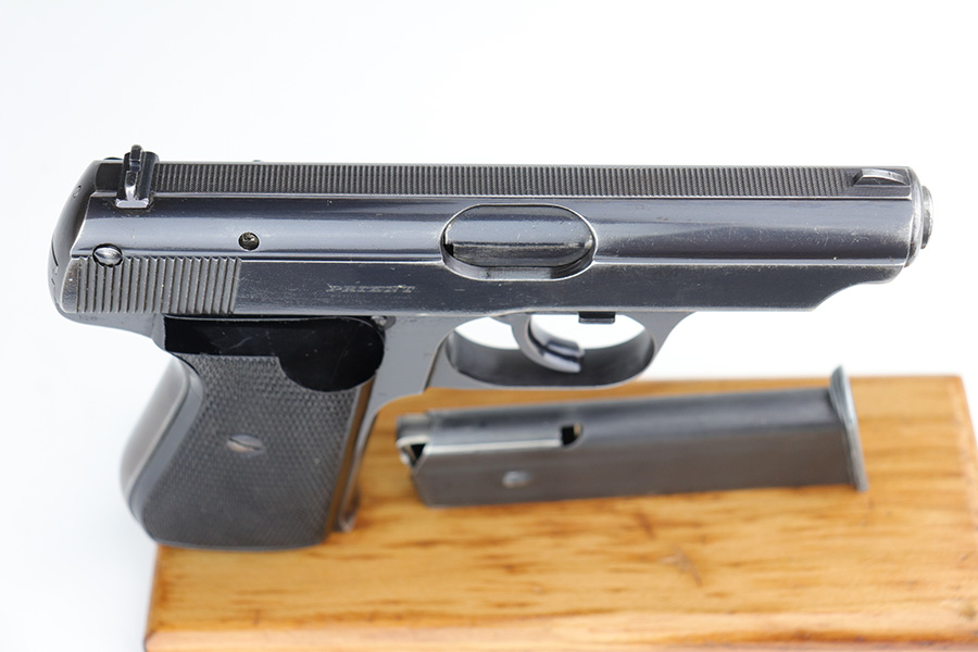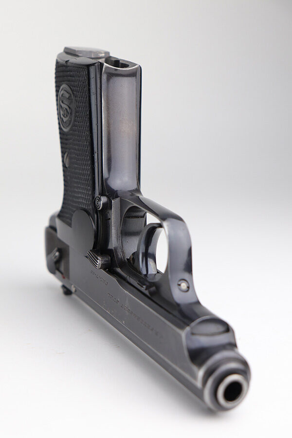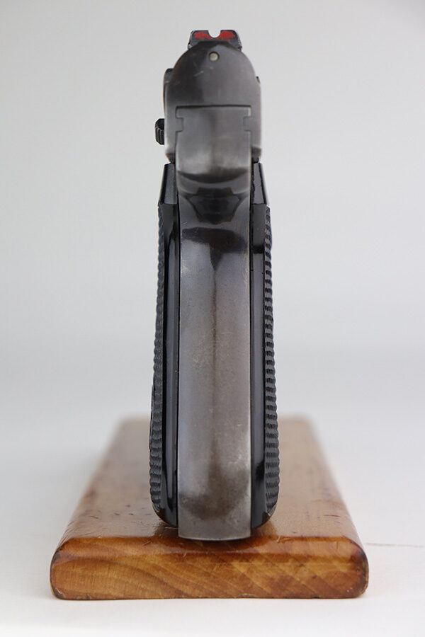9/8/21 – This is a nice example of an early Sauer 38h sold in the commercial market around 1939. It is all matching and has the proper commercial “Crown N” proofs. It has retained roughly 85% of its early high polish finish. There is wear and dark brown patina on the straps. There is wear around the high edges of the slide and tiny dots of discoloration on the left side of the slide. Comes with excellent grips (small chip in the left grip) and a period-correct magazine. Mint bore.