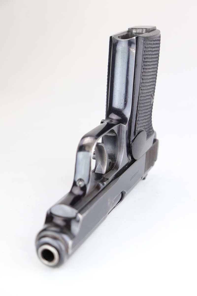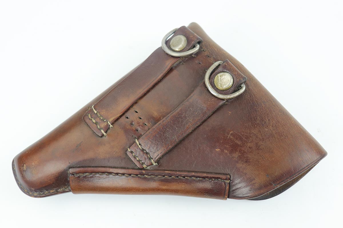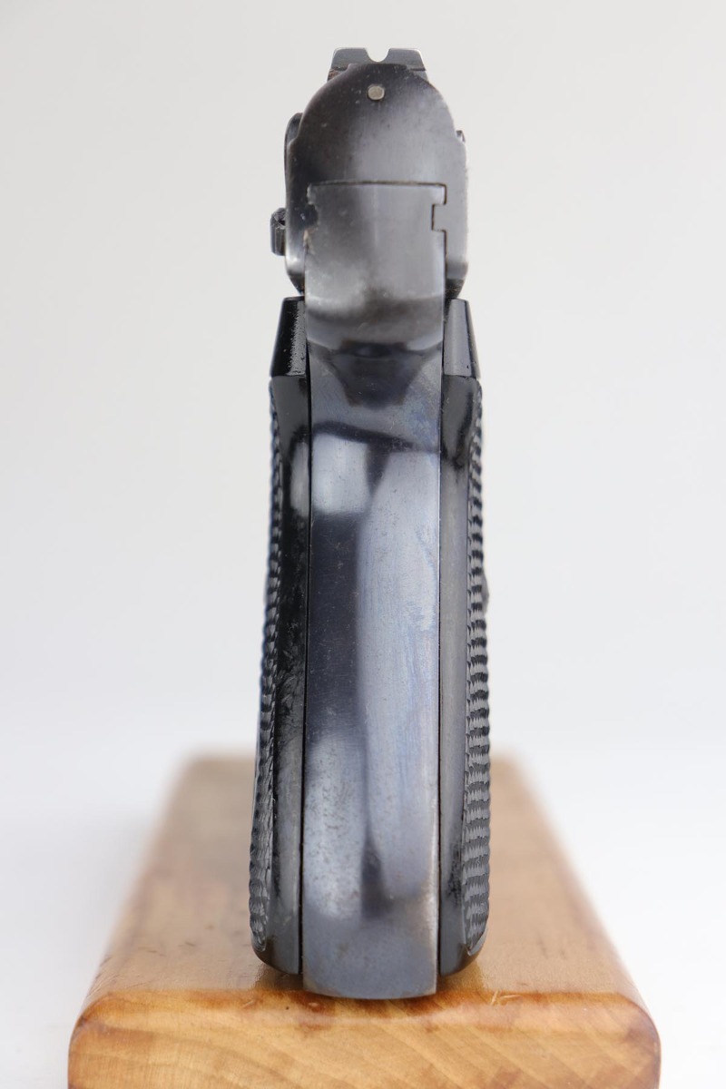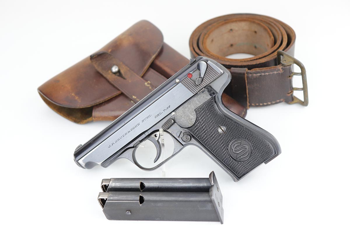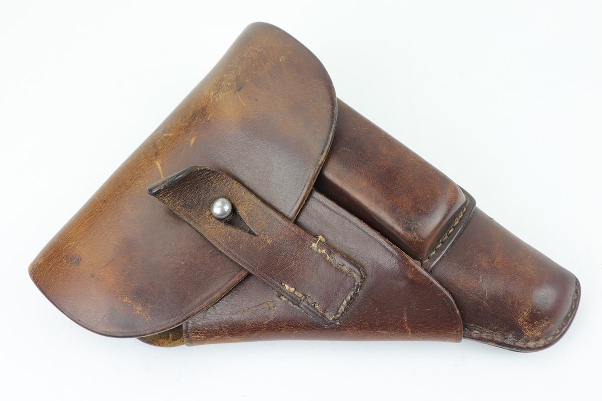 2/28/20 – This is an early commercial Sauer 38h rig with spare magazine, holster and belt. The pistol has high-polish blue with edge wear on both sides of the slide, and an area of finish loss on the trigger guard and bottom of the back strap. Excellent grips and minty bore. Both magazines are early with the double S logo. The holster is marked ‘LBA’ and ’42 dated. The belt buckle is 1938 dated and RZM marked, and these belts were primarily worn by paramilitary or political officials.
