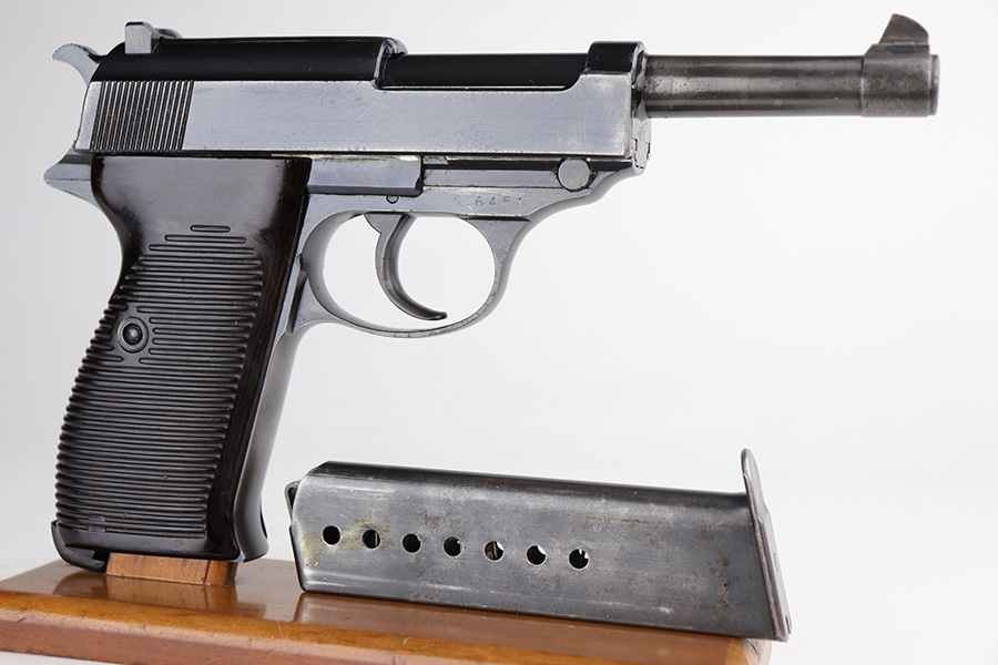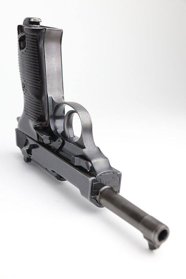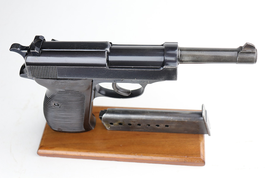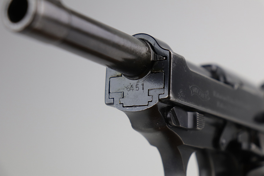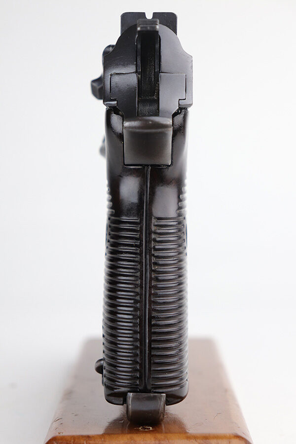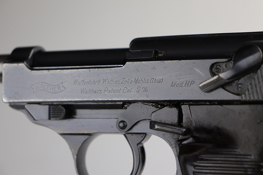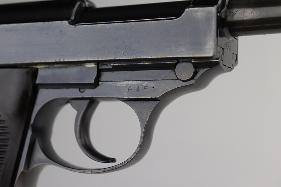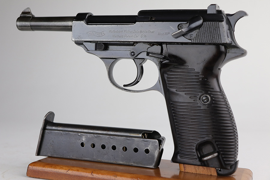10/1/21 – This is a nice example of a very early Walther Mod HP sold in the commercial market in about 1940. It is all matching and commercial “Eagle N” proofed. This is an early variation as the slide is numbered on its underside, near the back. We believe the gun has an old re-blued finish. In any case the gun has retained roughly 80% of its bluing. The majority of the wear comes in the form of thinning on the front strap and barrel. There is also minor wear concentrated around the high edges of the slide and around the muzzle. There are a few minor pits on the barrel and some areas of minor pin-pricking on the left side of the slide. Some very light scratches on the right side of the slide. Comes with excellent grips and a ‘P.38v’ marked magazine. The rifling in the bore is a bit worn with minor pitting throughout. De-cocker is functional.