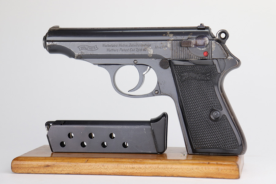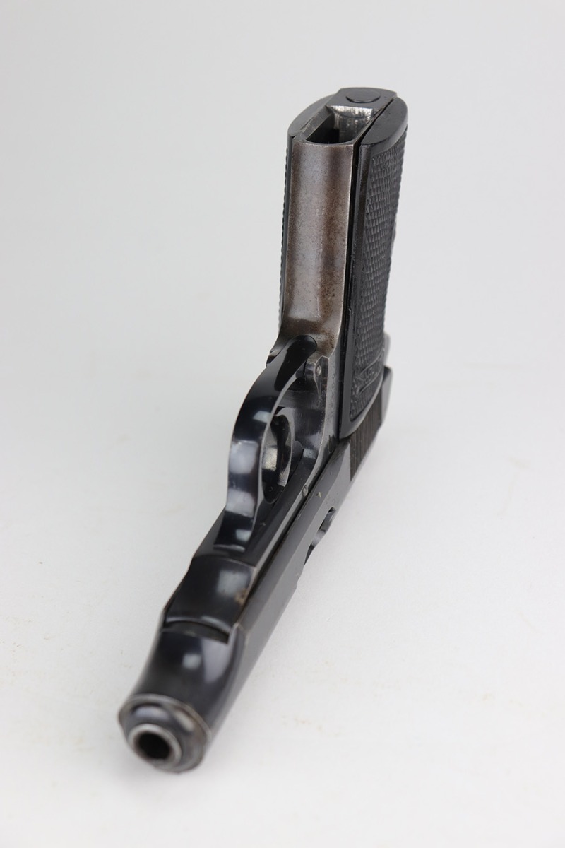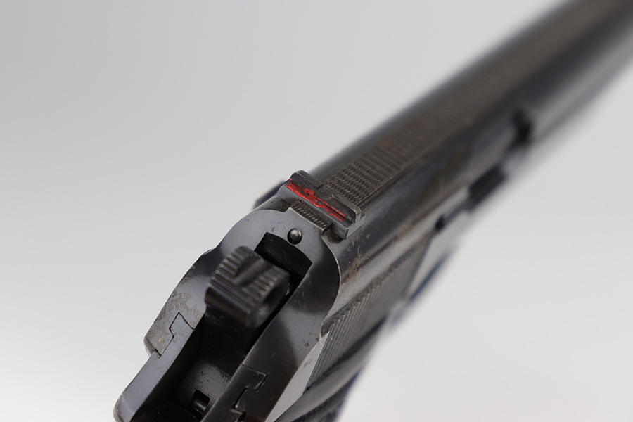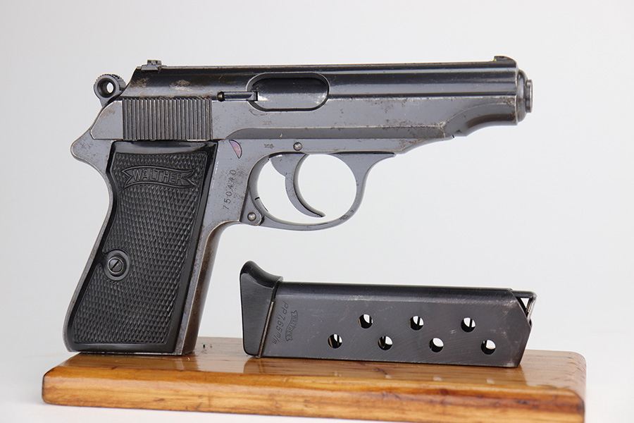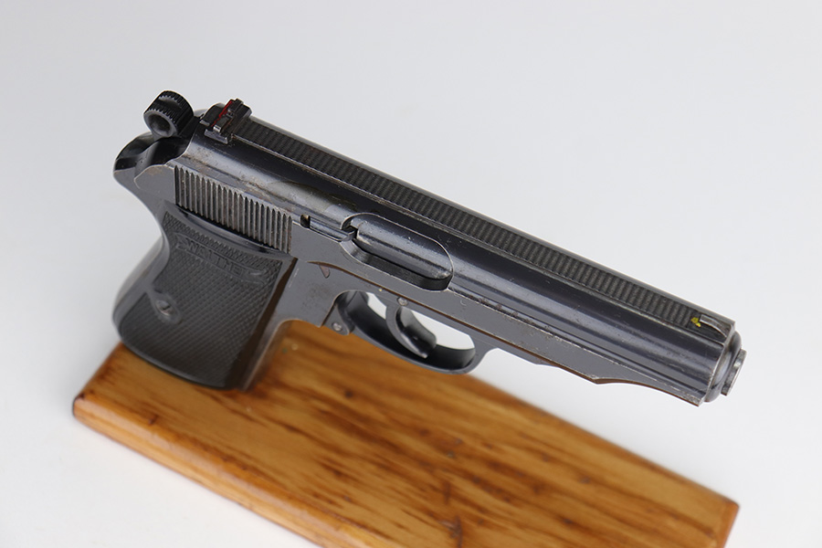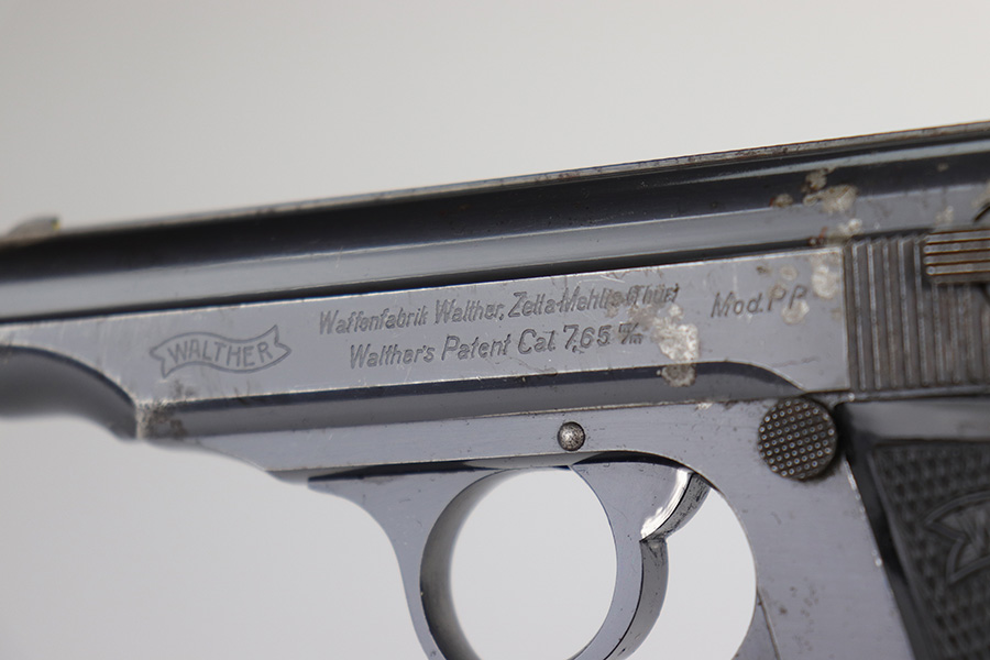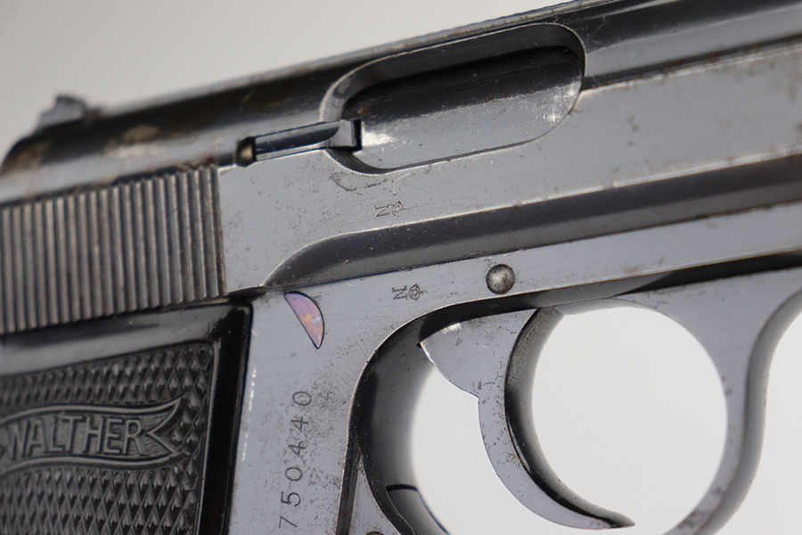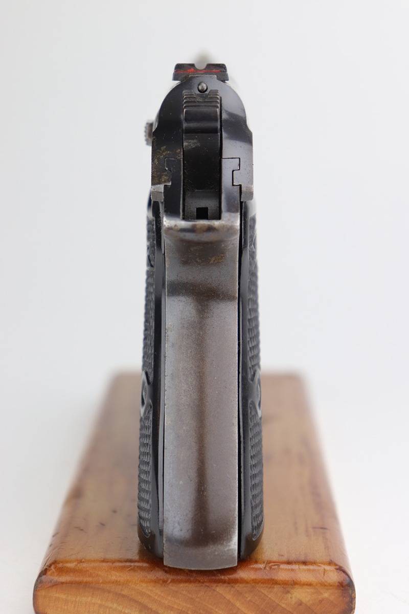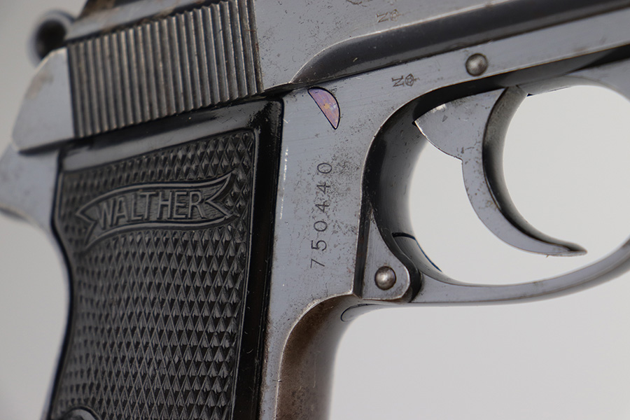 1/10/23 – This is a very nice example of a very early Walther PP sold in the commercial market during the first year of production, 1929. It is all matching, “Crown N” proofed, and has the proper early features, such as 90 degree safety, extended barrel, and “upside-down” serial number on the frame. It has retained somewhere between 85-90% of its original high polish finish. There is thinning and spotty oxidation on both grip straps, but the most obvious signs of wear are areas of splotchy discoloration on both sides of the slide. There are also a few areas of minor pitting here and there along the slide. Fitted with set of period-correct weighted grips, but there is a crack along the edge of the left panel from expansion and contraction of the bakelite. Comes with a wartime magazine that has a proper early flat-side finger extension. The bore is shiny with strong rifling, but there is some light freckling here and there. Painted sights.