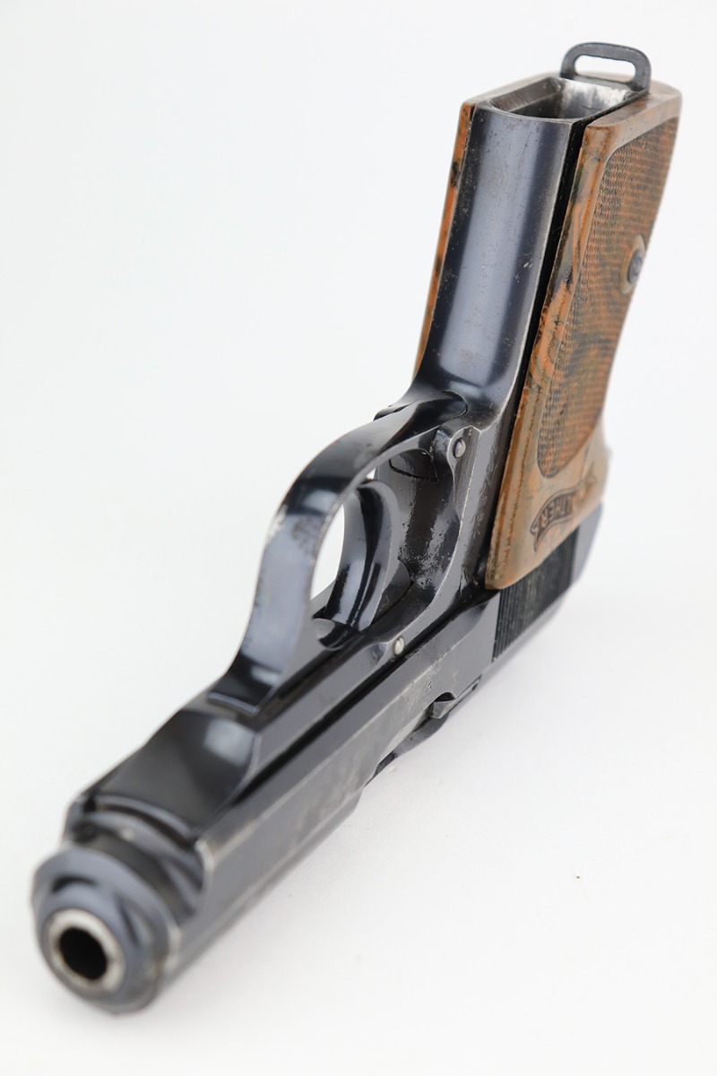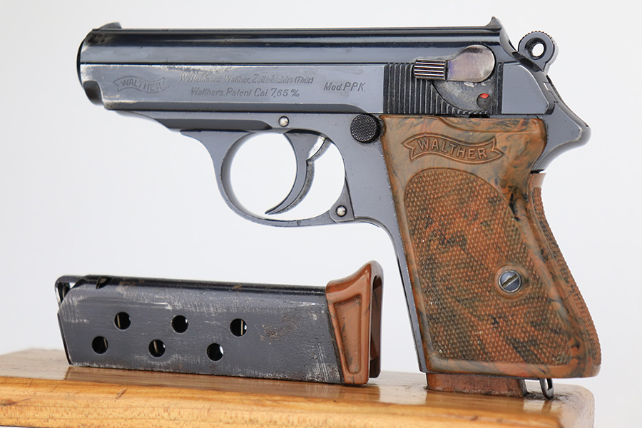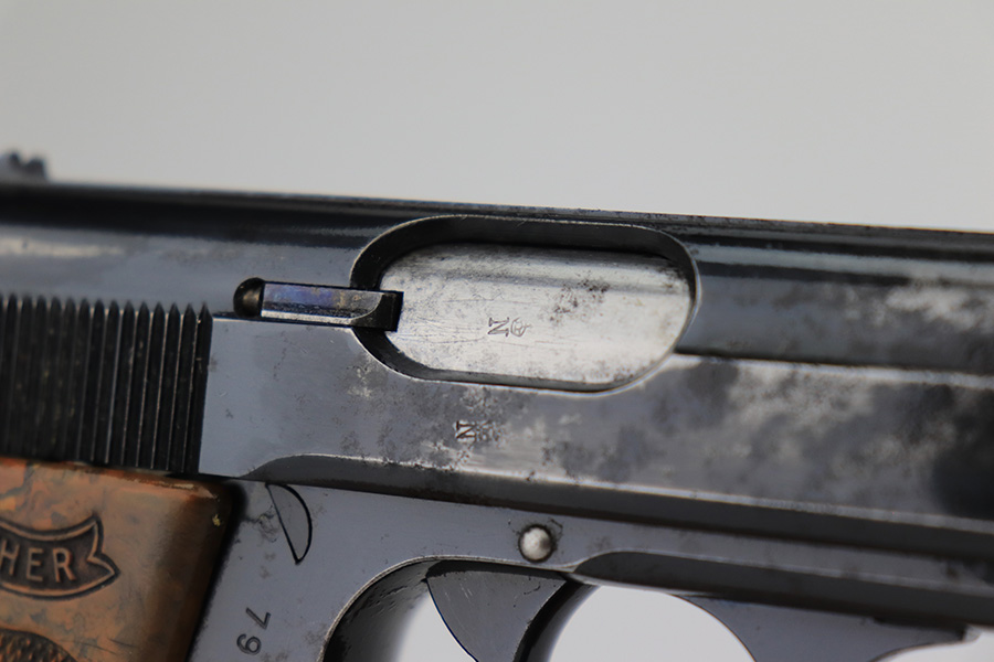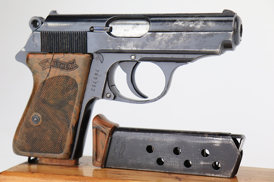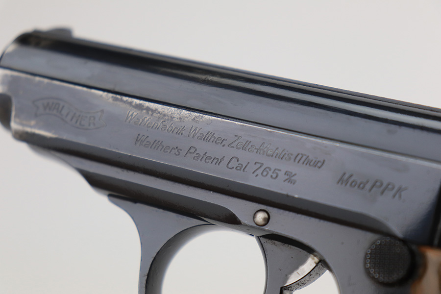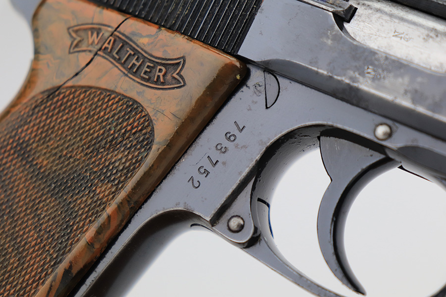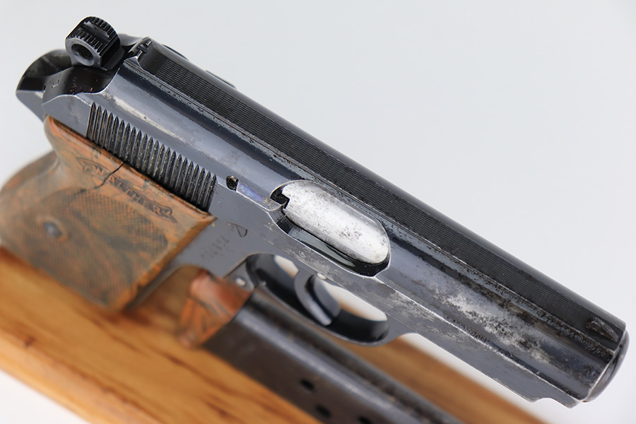 2/17/23 – This is an early production, all original and matching Walther PPK. The pistol was made in about 1933 and has the early 90 degree safety. While the original finish covers about 85% of the gun it also has corrosion on the metal, mostly found on the left side of the slide. This is forward of the ejection port, on the flat and rounded portion of the slide where there is finish loss, dark patina, and pin pricking. The front strap is actually one of the better areas of finish on the gun, although there is some mild finish loss and edge wear on the front and back straps. The original grip is correct but has crack on the upper right side. A correct early banner-only magazine is included. The bore is shiny and rates about 8 out of 10. The etching inside the slide matches the serial number on the frame. Comes with a wartime finger extension magazine in excellent condition. Overall, a decent example of an early Commercial PPK.