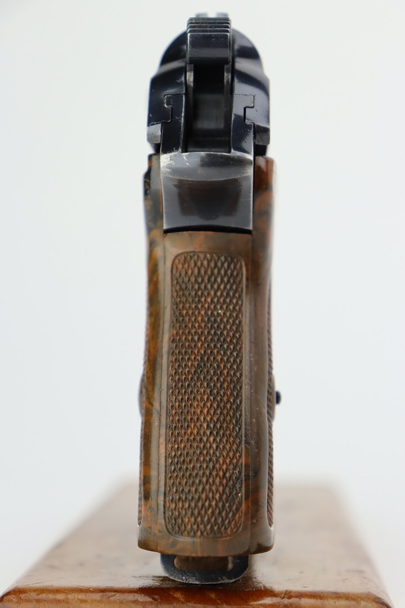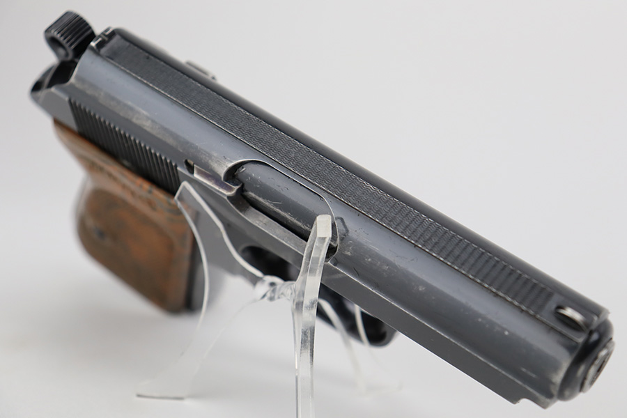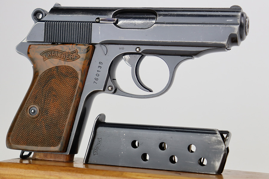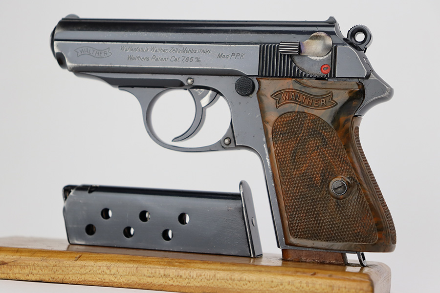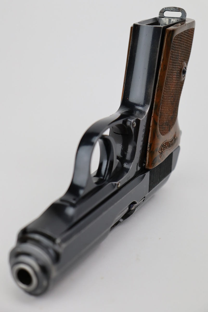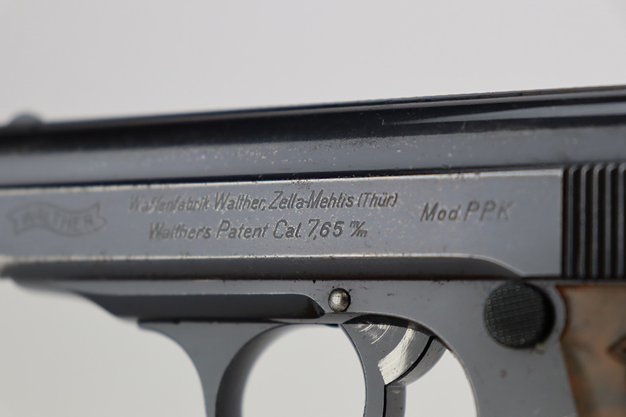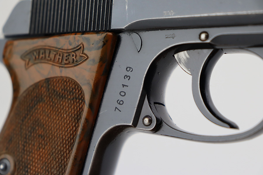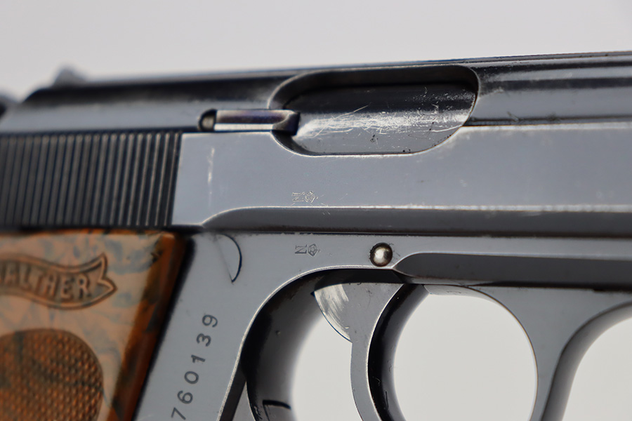 7/31/23 – This is an early Walther PPK sold in the commercial market in about 1932. It is matching and has the proper early features, such as an enclosed firing pin, “reversed” serial number, the left-to-right grip screw orientation, and the earlier locations of the “Crown N” proofs on the slide and frame. The gun has retained about 85% of its original high polish finish. There is wear around the muzzle and light spotty wear throughout, concentrated mostly around the high edges. There is a noticeable area of pin-pricking on the left side of the slide. Fitted with an excellent brown Walther grip and comes with a period-correct Walther banner-only magazine. Mint bore. The de-cocker does not function properly.