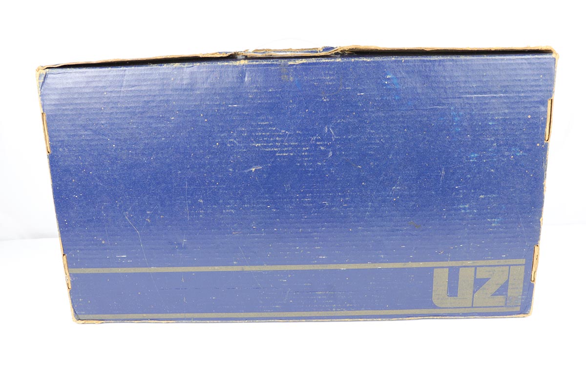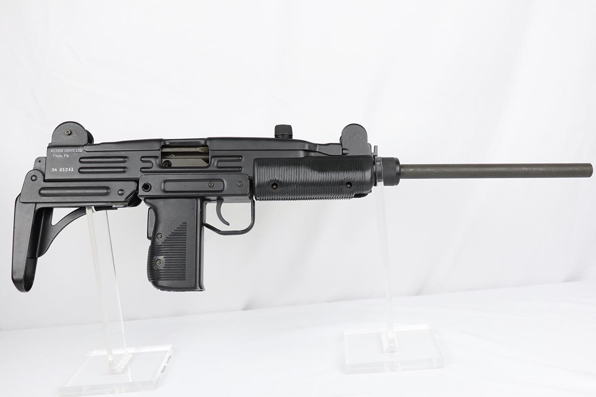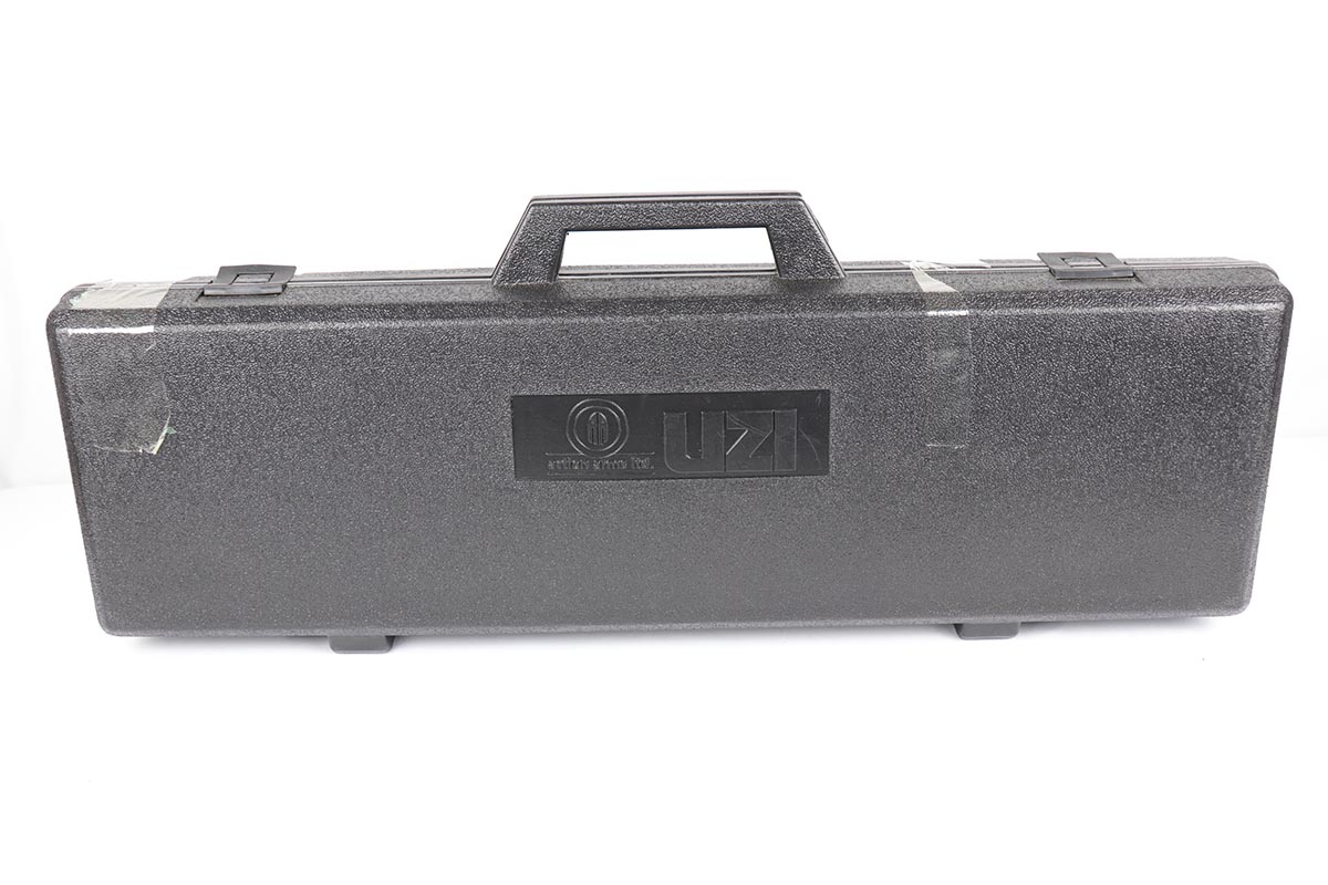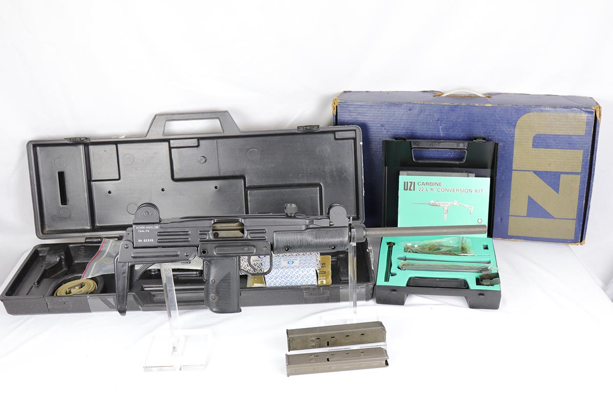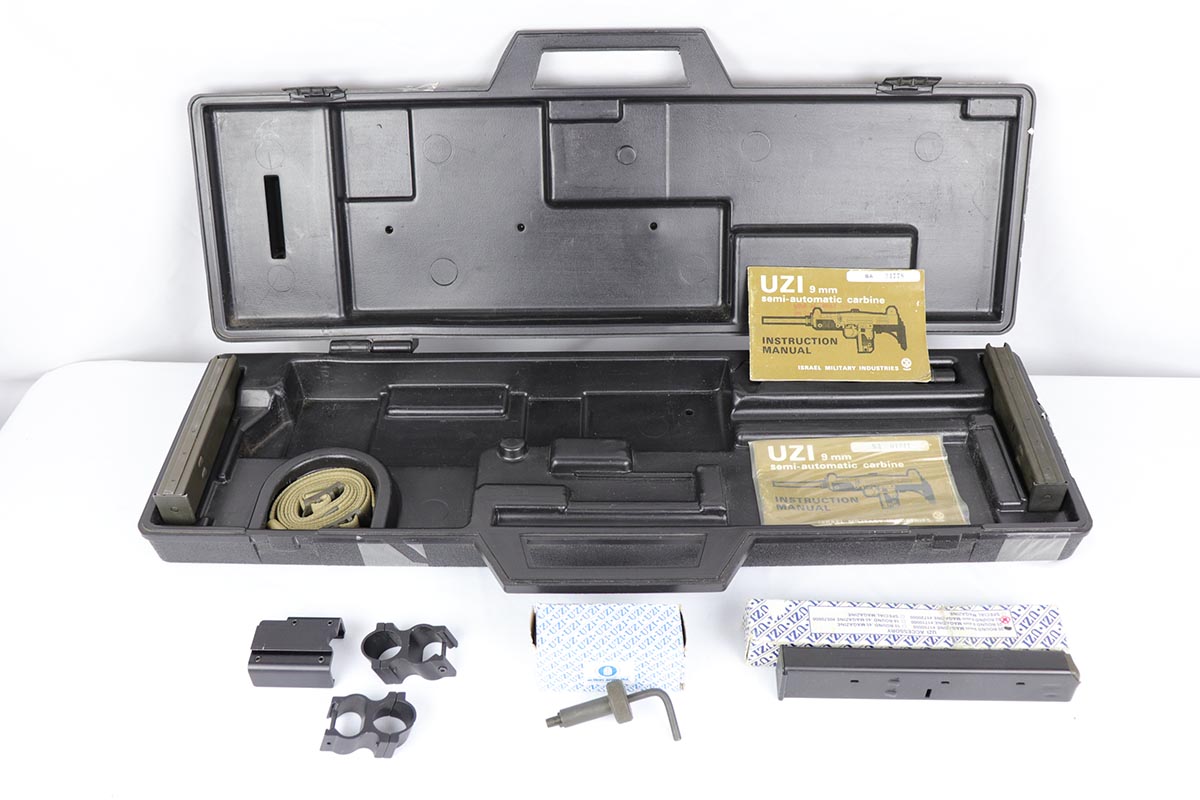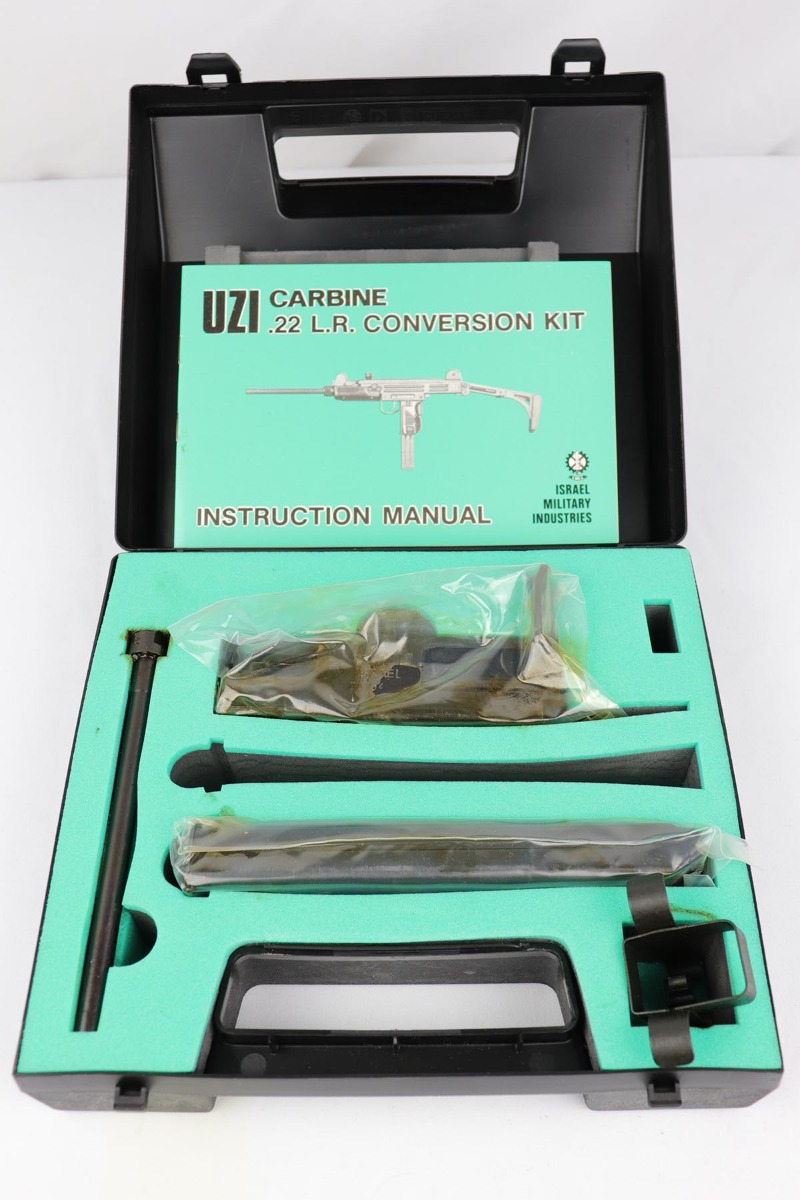 11/1/18 – This must be the most complete example of a pre-ban UZI assault rifle made by IMI in Israel and imported by Action Arms of PA in mid 1980s. This gun appears near new with just a few spots of handling wear here and there. It is complete with a plastic UZI tactical case, and original cardboard case and a load of accessories: dummy barrel, sling, manual, mags, scope rings, tool, and everything else that you see in the pictures. It even comes with a complete boxed unused early .22 cal conversion kit! If you wanted an example of a legendary original assault pistol – this set cannot be upgraded. We have never seen such a beautiful example. 16.1 inch barrel makes this item a rifle with folding stock.