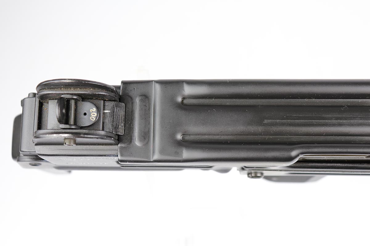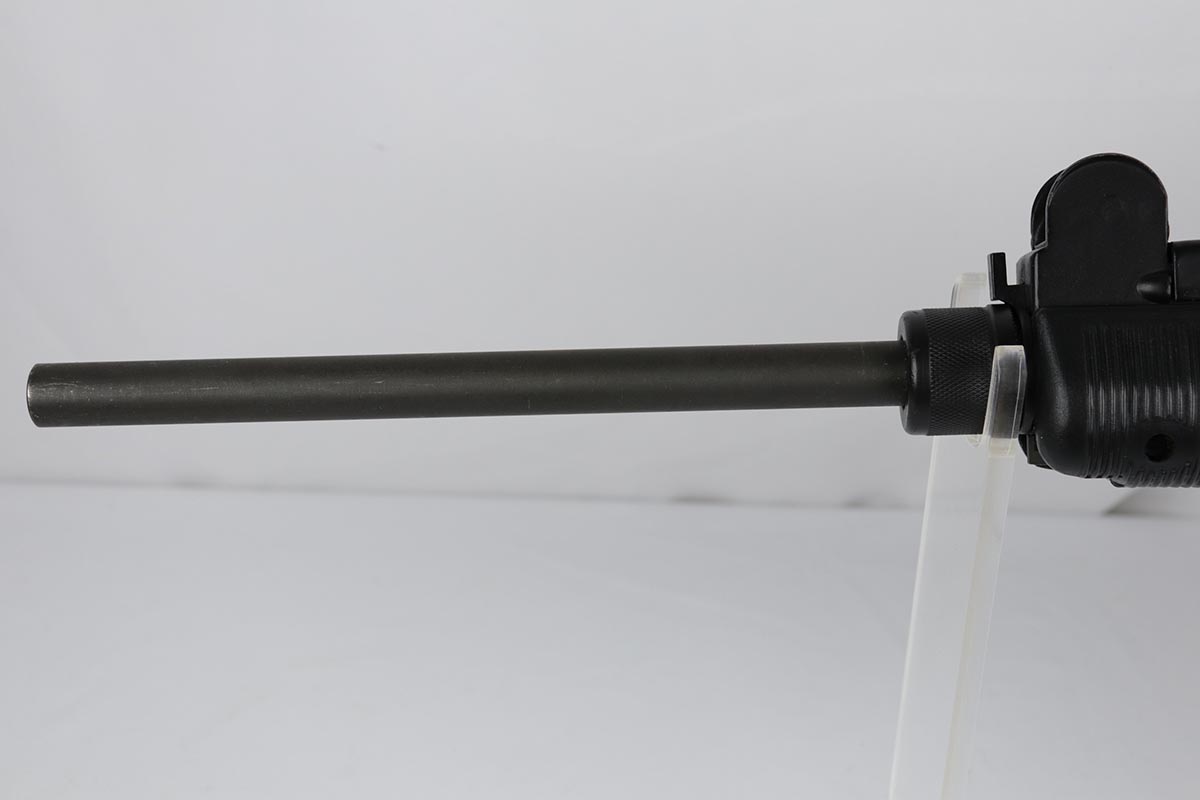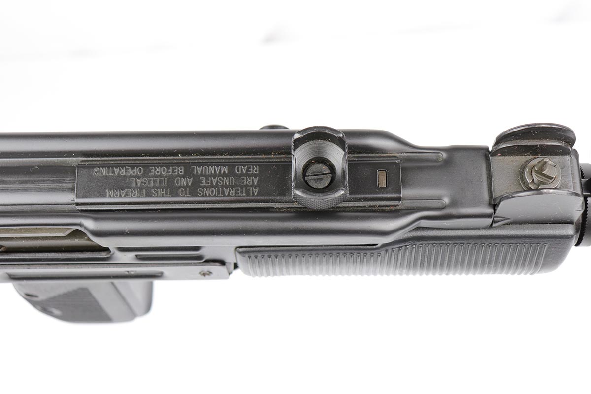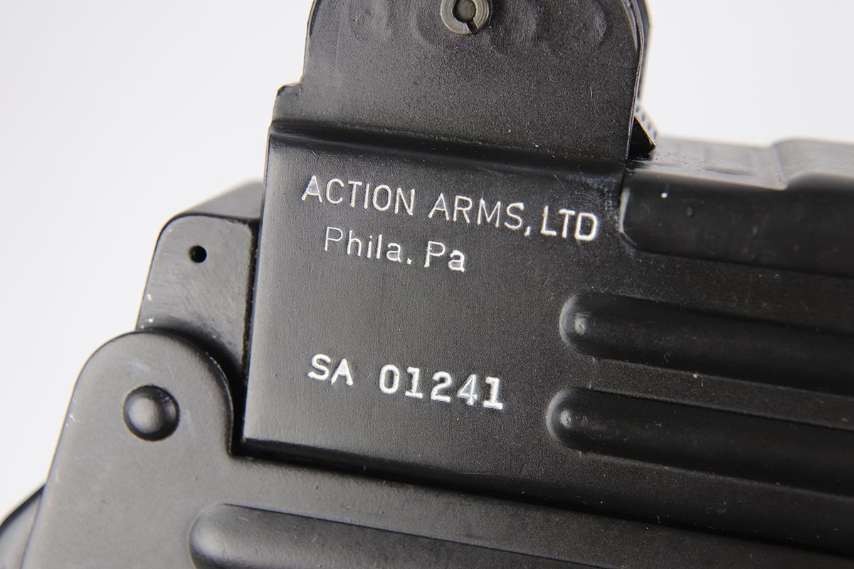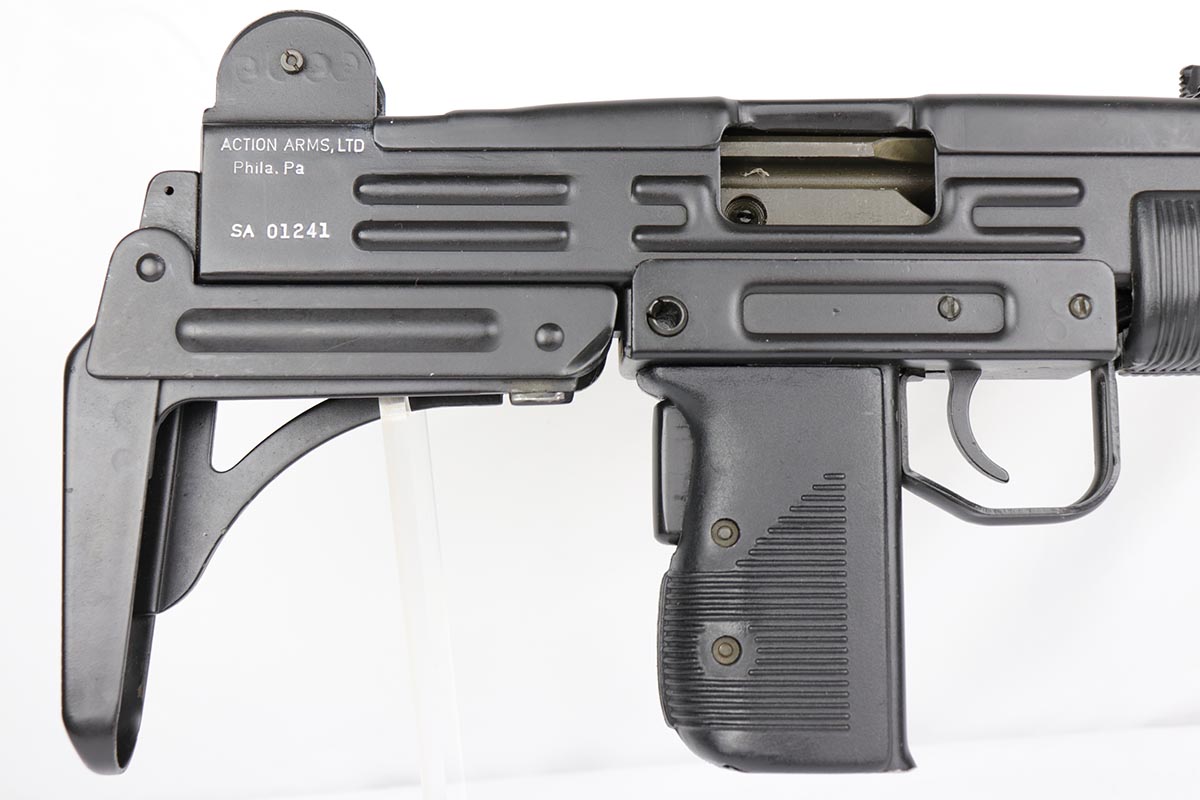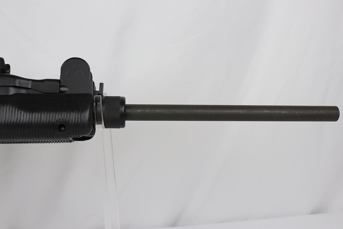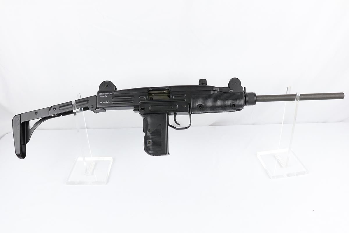 11/1/18 – This must be the most complete example of a pre-ban UZI assault rifle made by IMI in Israel and imported by Action Arms of PA in mid 1980s. This gun appears near new with just a few spots of handling wear here and there. It is complete with a plastic UZI tactical case, and original cardboard case and a load of accessories: dummy barrel, sling, manual, mags, scope rings, tool, and everything else that you see in the pictures. It even comes with a complete boxed unused early .22 cal conversion kit! If you wanted an example of a legendary original assault pistol – this set cannot be upgraded. We have never seen such a beautiful example. 16.1 inch barrel makes this item a rifle with folding stock.
