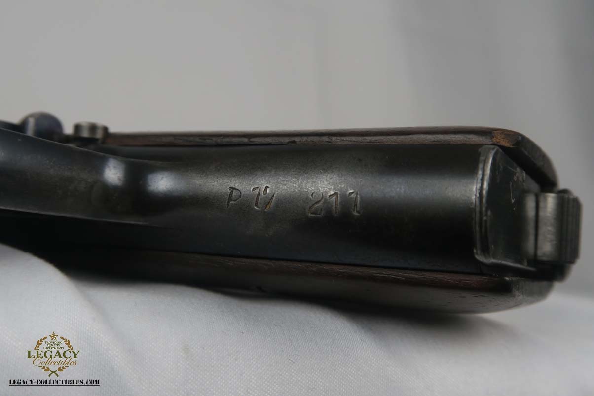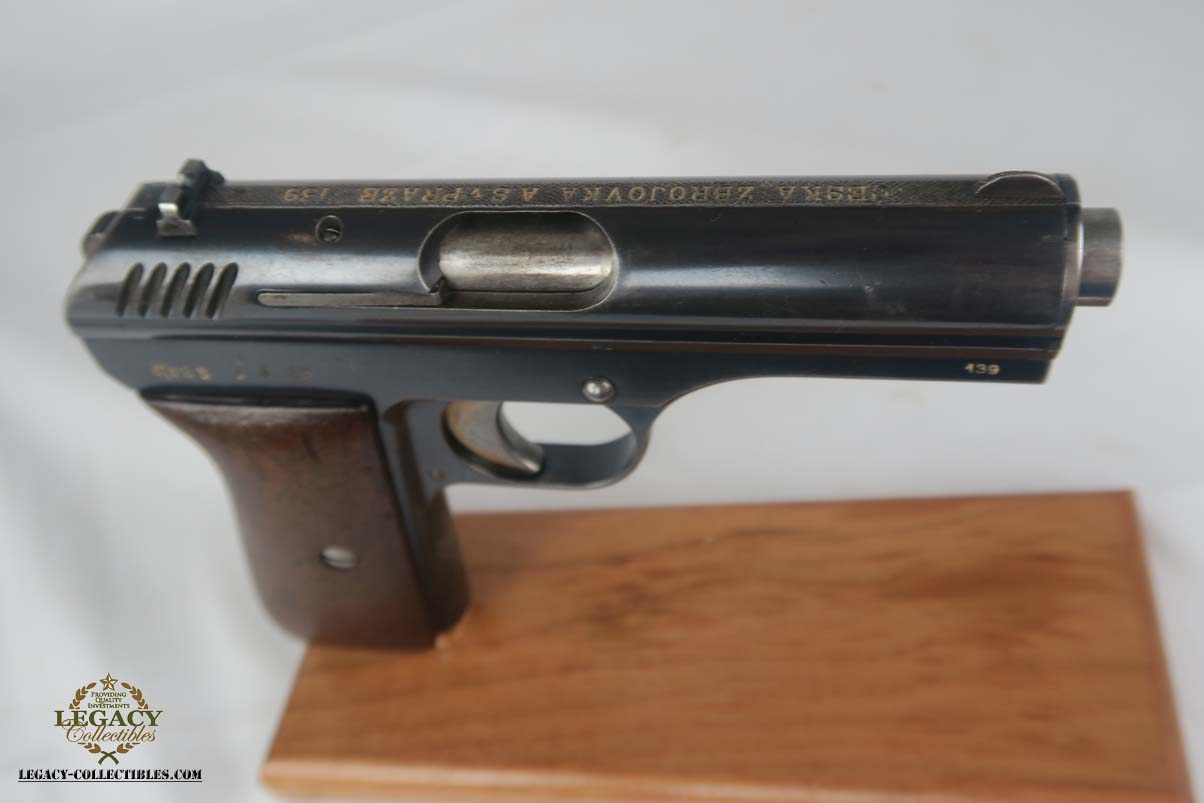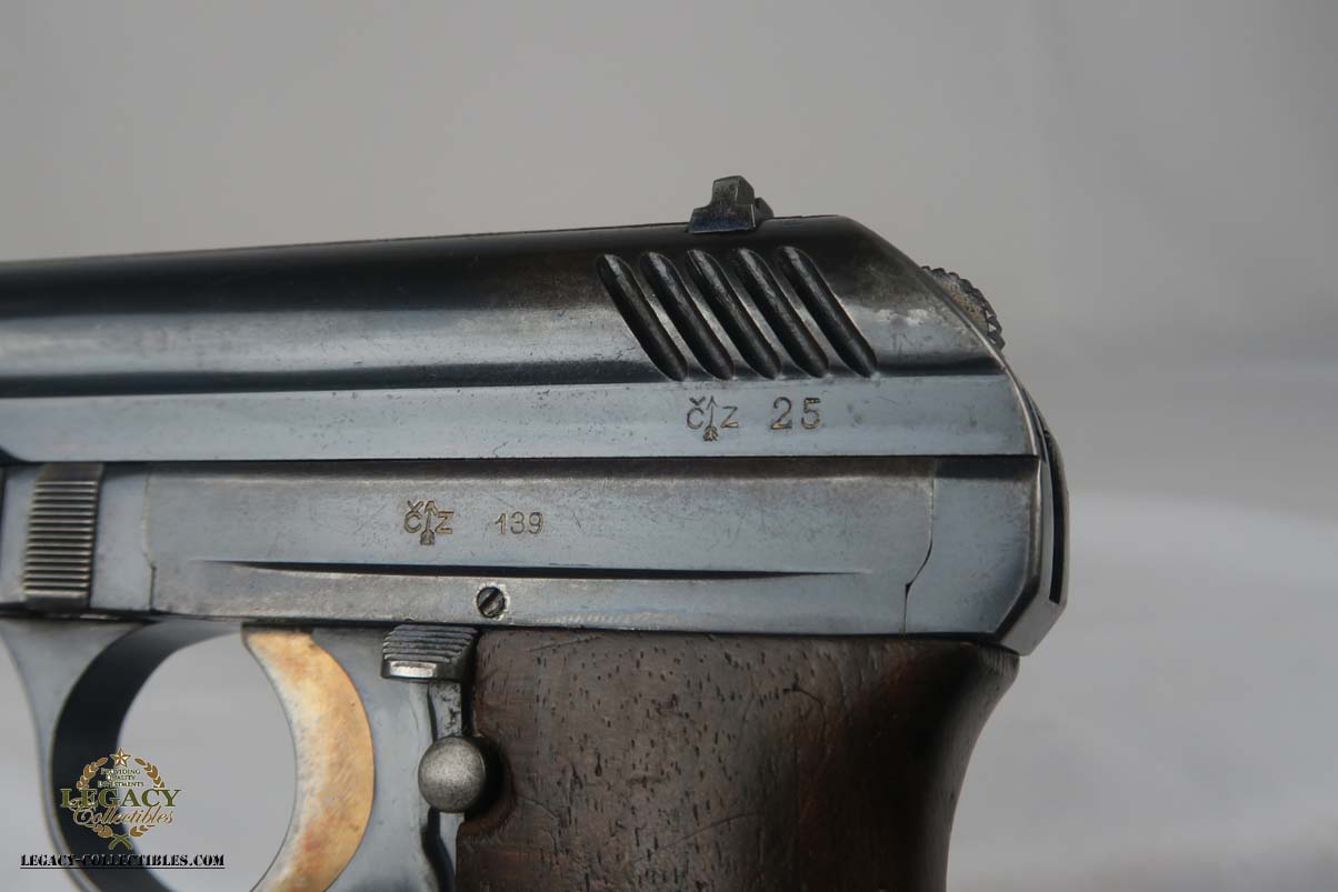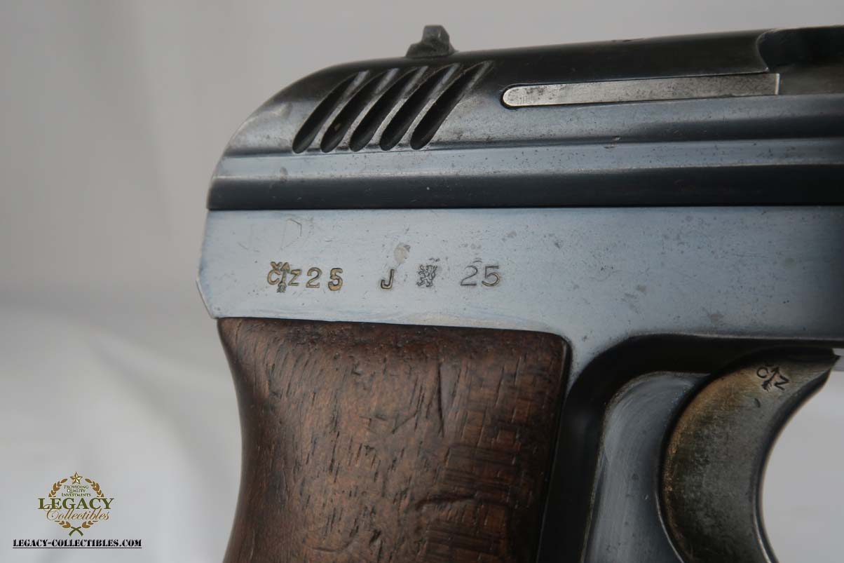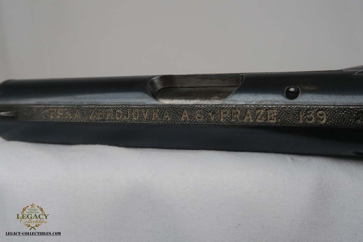 3/15/17 – This is an original, pre WW2 production CZ model 24. The pistol is similar to the CZ -27, but it’s in .380 ACP, and the legend on the top of the pistol says, “CESKA ZEBROJOVKA A.S. v. PRAZE 139”. The lack of German military proof stamps, and early three digit serial number, suggest to me that this is a very early pistol. The pistol is in great shape compared to most other examples I’ve seen. The bluing on the slide has thinned in a few places, but there is no rust or pitting on the pistol. The straw colored trigger is also in great shape, but is missing some of the finish due to use and age. The wood grip is excellent with no cracks or issues. The front strap appears to have a unit stamp “P 17 211”. The front strap shows some thinning of finish as well, but again this is normal wear from use and aging. The bore is surprisingly excellent with only one or two small specs of residue. The rifling is in tact and excellent. Guaranteed original.