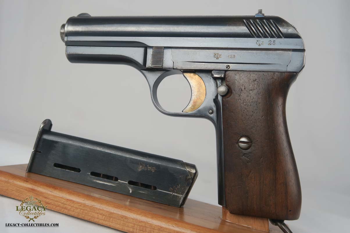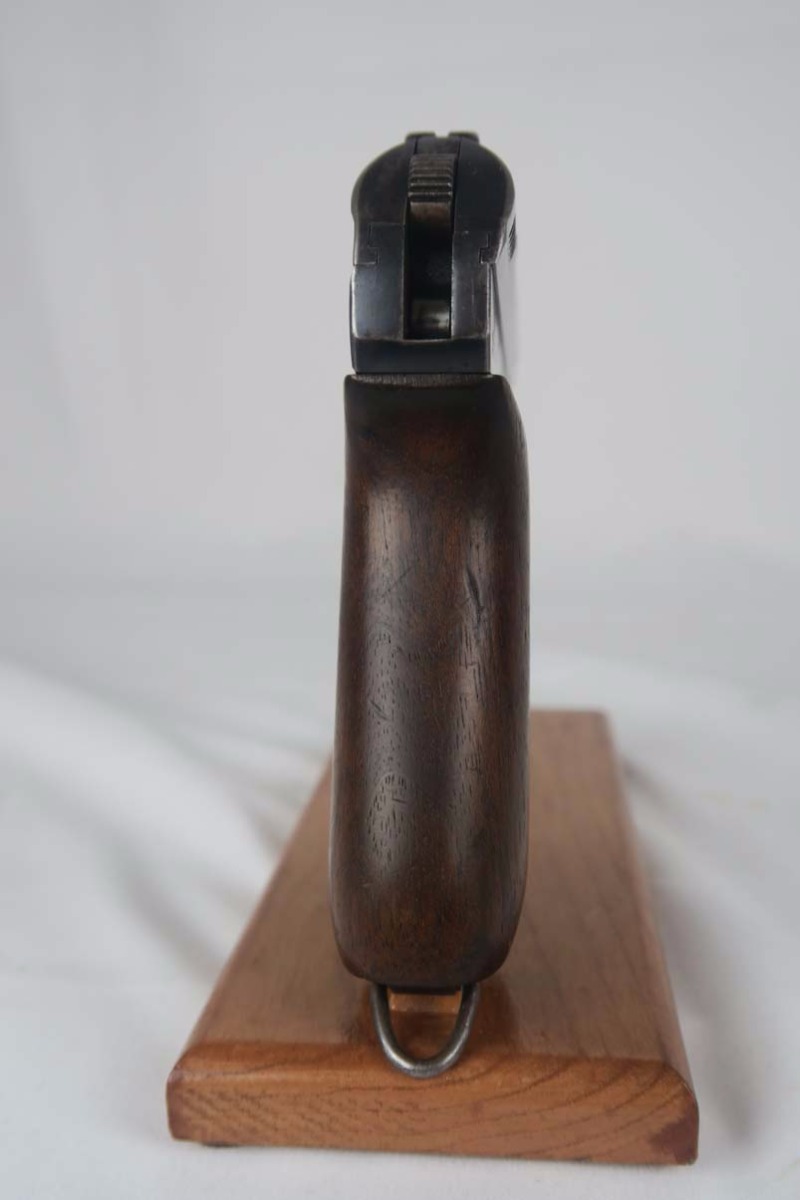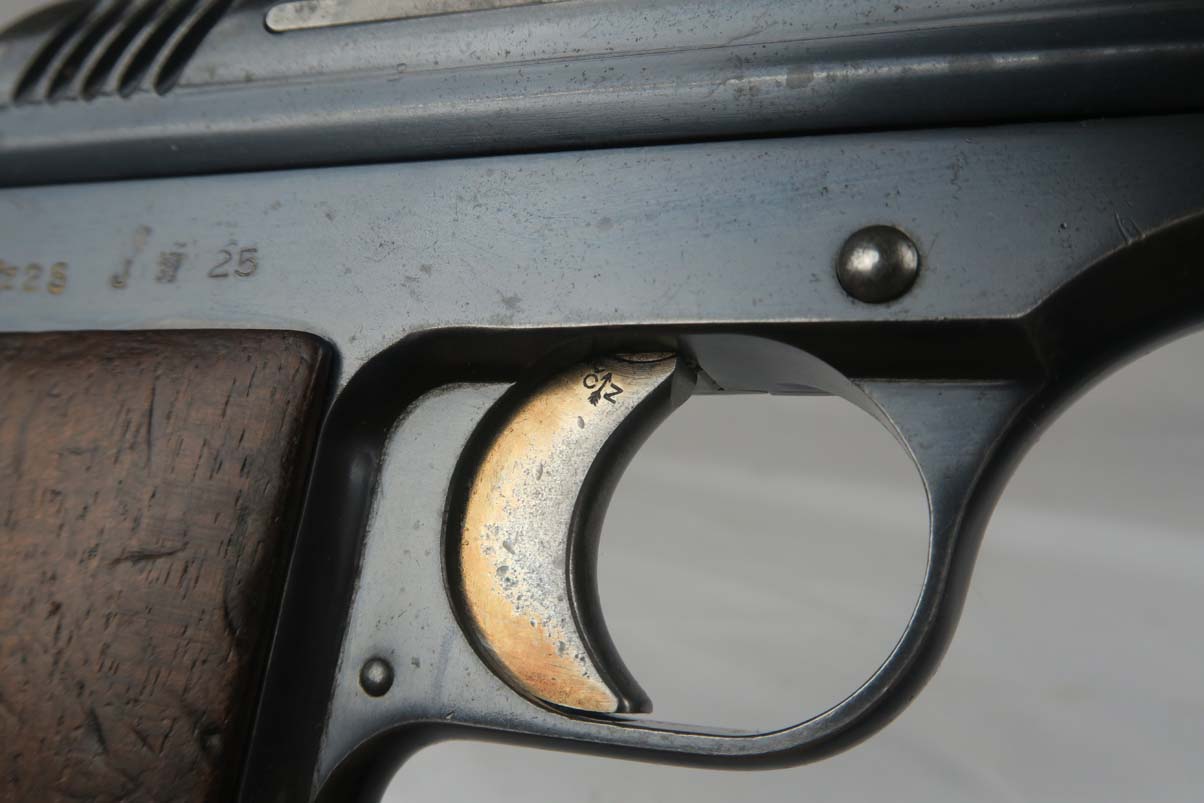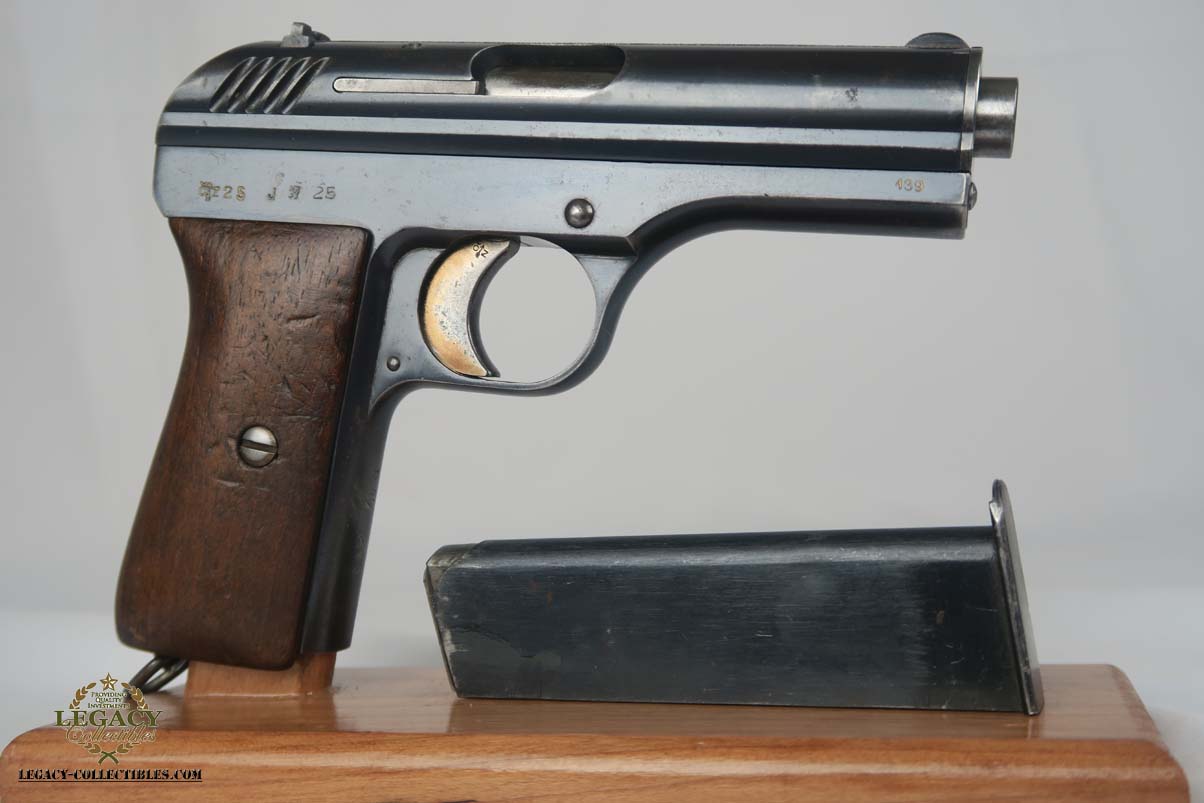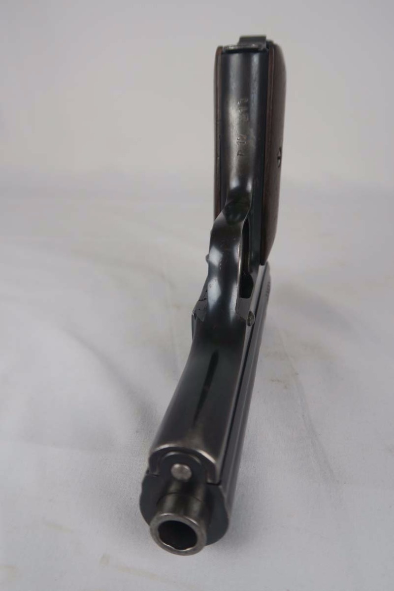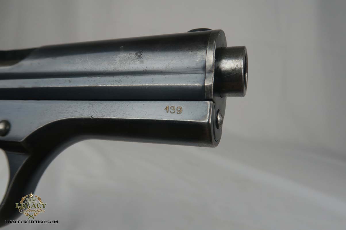 3/15/17 – This is an original, pre WW2 production CZ model 24. The pistol is similar to the CZ -27, but it’s in .380 ACP, and the legend on the top of the pistol says, “CESKA ZEBROJOVKA A.S. v. PRAZE 139”. The lack of German military proof stamps, and early three digit serial number, suggest to me that this is a very early pistol. The pistol is in great shape compared to most other examples I’ve seen. The bluing on the slide has thinned in a few places, but there is no rust or pitting on the pistol. The straw colored trigger is also in great shape, but is missing some of the finish due to use and age. The wood grip is excellent with no cracks or issues. The front strap appears to have a unit stamp “P 17 211”. The front strap shows some thinning of finish as well, but again this is normal wear from use and aging. The bore is surprisingly excellent with only one or two small specs of residue. The rifling is in tact and excellent. Guaranteed original.