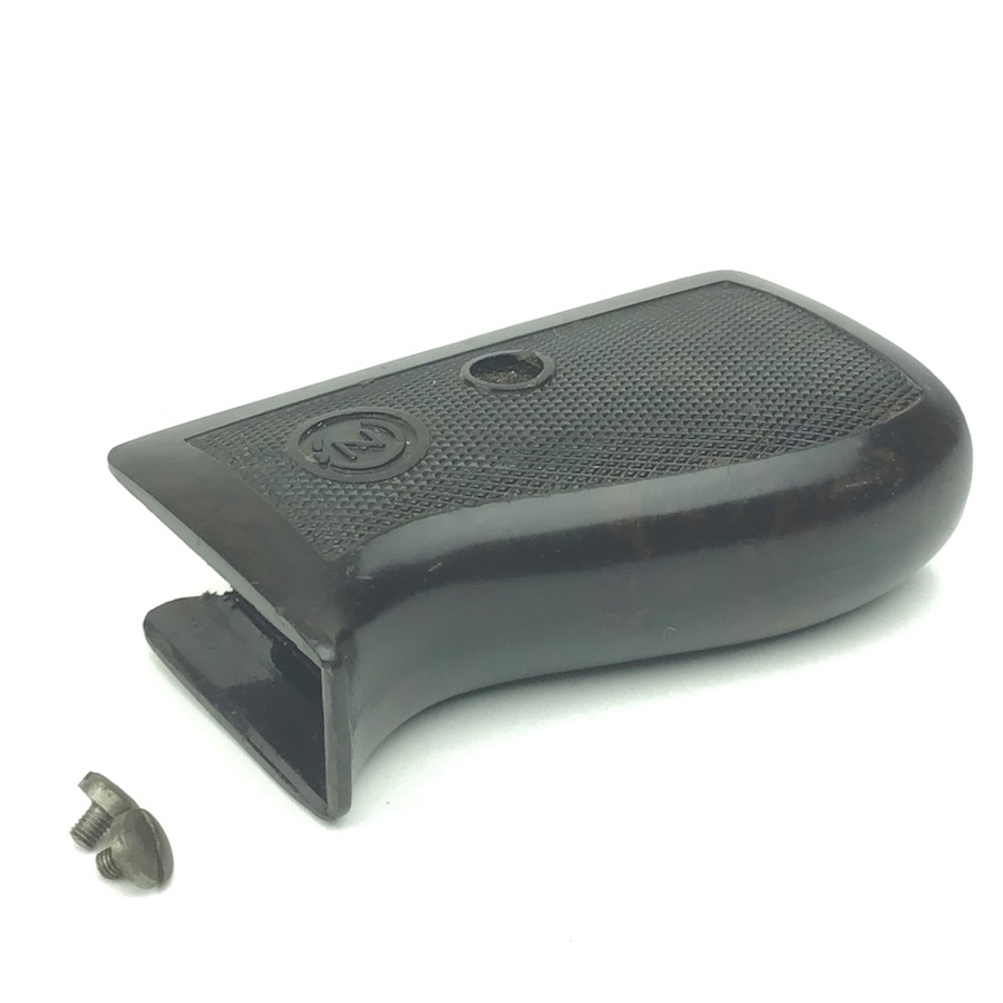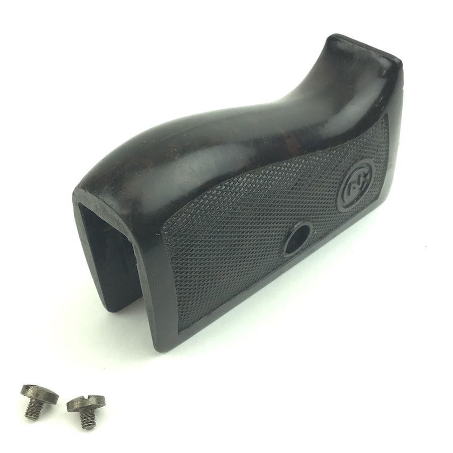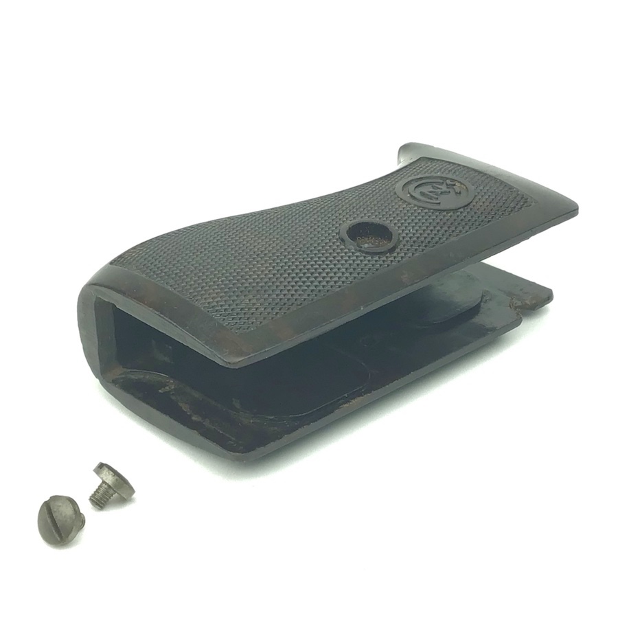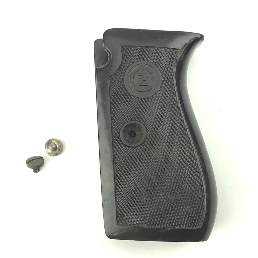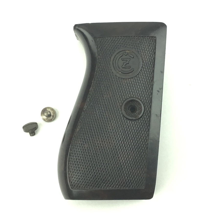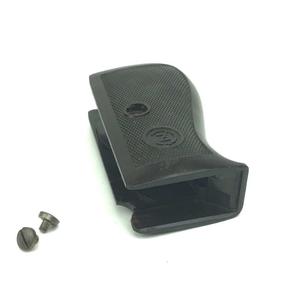 6/15/21 – This is an original WW2 era CZ model 27 grip. The grip is in excellent condition, and the earlier wartime variation. Each side of the grip has the CZ logo inside a circle. The dark brown bakelite is in excellent condition. Some minor surface wear, but no cracks or chips. The grip comes with two original screws.